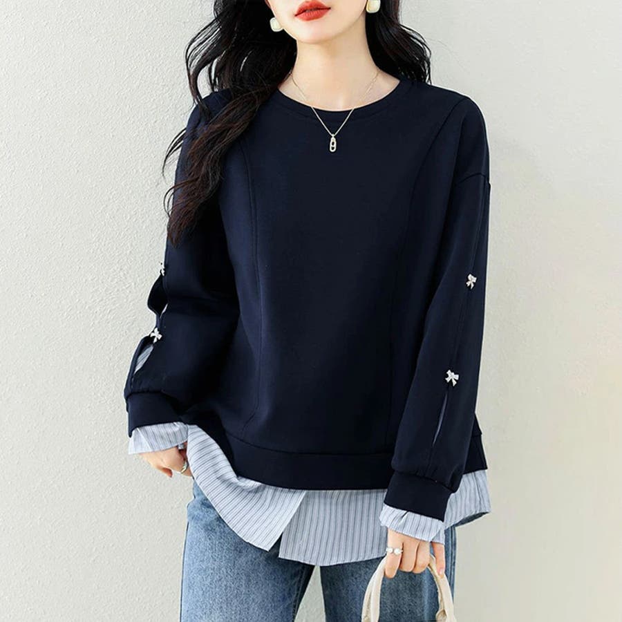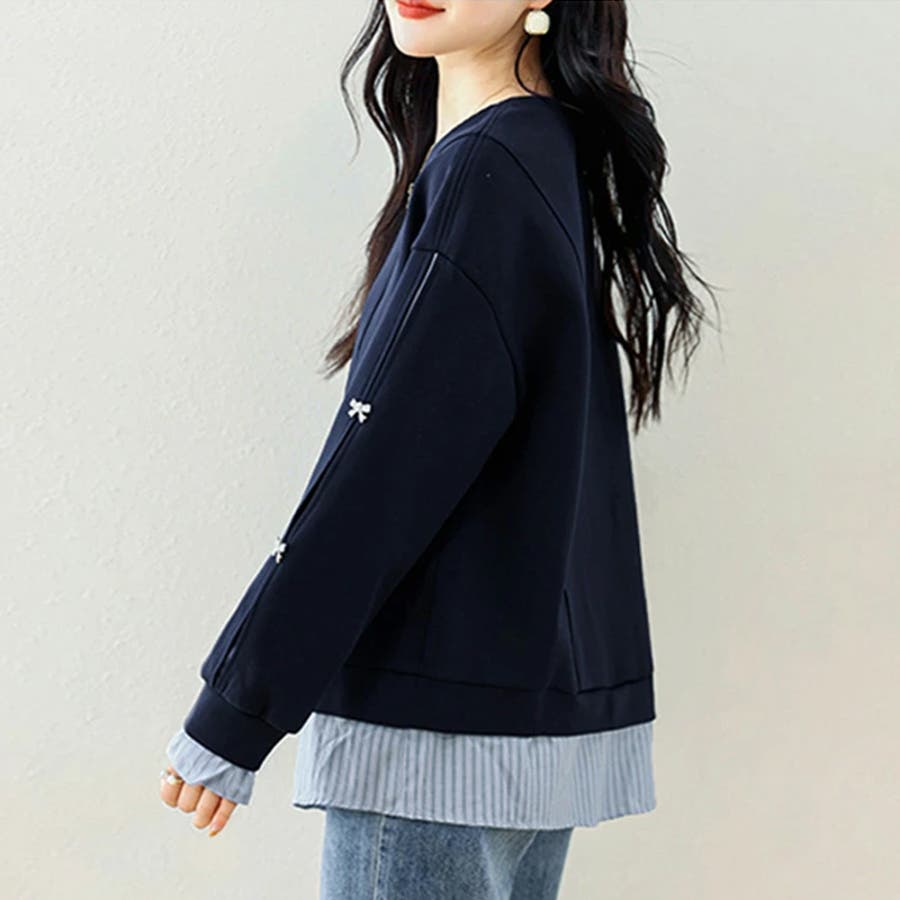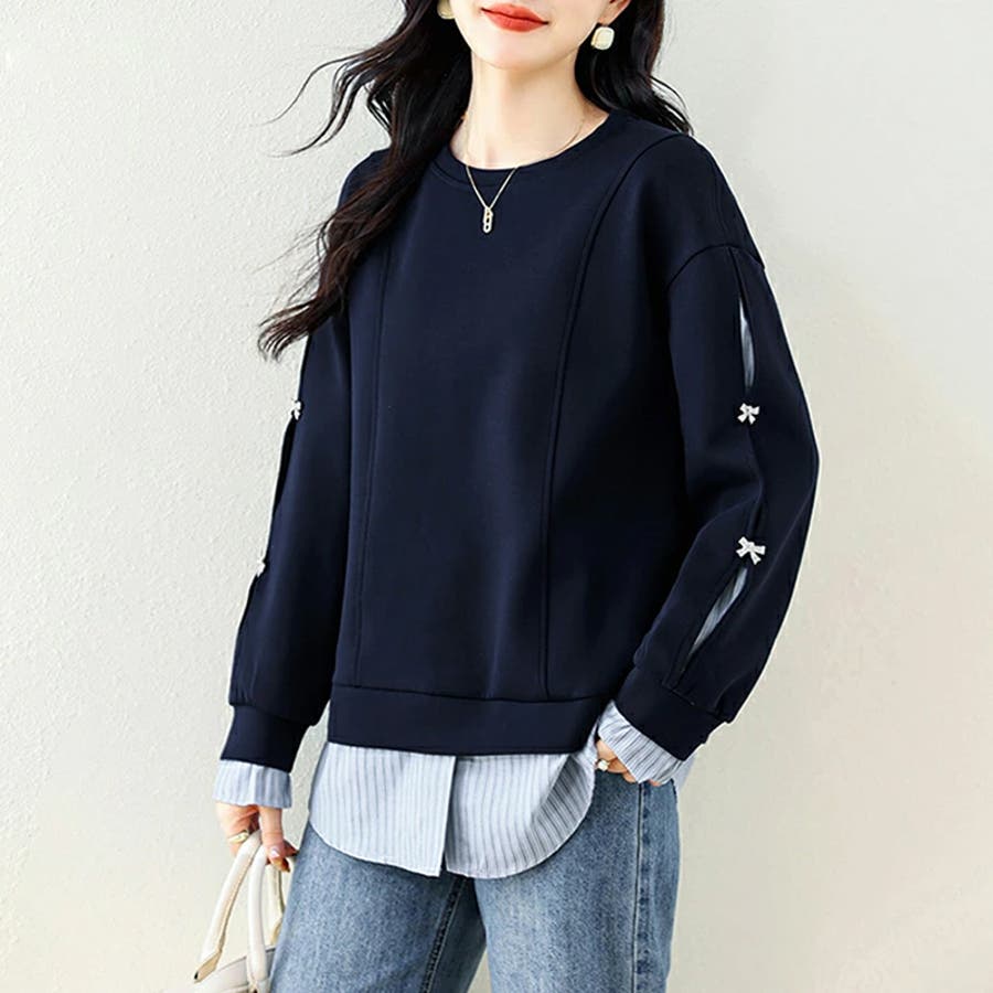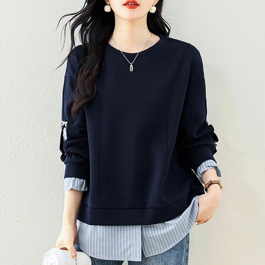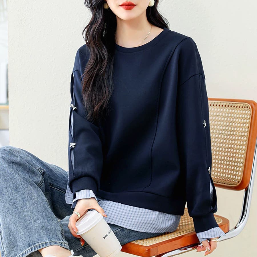 レイヤード風 シャツ スウェット 袖リボン トップス レディース トレーナー 長袖 袖スリット 重ね着風 重ね着風スウェット ドッキング ストライプ ゆったり 体型カバー 切り替え おしり隠し シャツドッキングプルオーバー ストライプシャツ 切り替えシャツ 切り替えトレーナー 袖 スリット きらきら ビジュー ラインストーン 異素材トップス きれいめ 大人 カットソー クルーネック プルオーバー 異素材切り替えトップス 重ね レイヤード 風 大きいサイズ スウェットトレーナー スエット 大きい 大きめ ラウンドネック 体型 カバー 隠し 楽 楽ちん 楽チン tops 洗える 手洗い可 手洗い 洗濯機で洗える リラックス 韓国風 韓国服 フェミニン カジュアル きれいめカジュアル 可愛い かわいい 大人可愛い 大人カジュアル オシャレ おしゃれ プチプラ 高見え トレンド ヒット 商品 おすすめ 服 服装 ファッション コーデ 母 ママ ママコーデ 女性 カジュアルコーデ Sサイズ Mサイズ Lサイズ S M L サイズ ネイビー 紺 紺色 カラー 春トップス 秋トップス 冬トップス 春トップスレディース 秋トップスレディース 冬トップスレディース レディース春 レディース秋 レディース冬 レディース秋冬 レディース秋物 レディース秋冬トップス 長袖トップス トップス長袖 長袖トップスレディース 長袖トップスおしゃれ トップスレディース トップスレディース長袖 レディーストップス 長袖レディース 長袖トレーナーレディース 可愛いトレーナー スウェットレディース スウェットトレーナーレディース 春秋 秋冬 春 秋 冬 春服 秋服 冬服 春用 秋用 冬用 春物 秋物 冬物 韓国 韓国ファッション 10代 20代 30代 40代 50代 60代 70代 cocomomo ココモモ