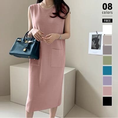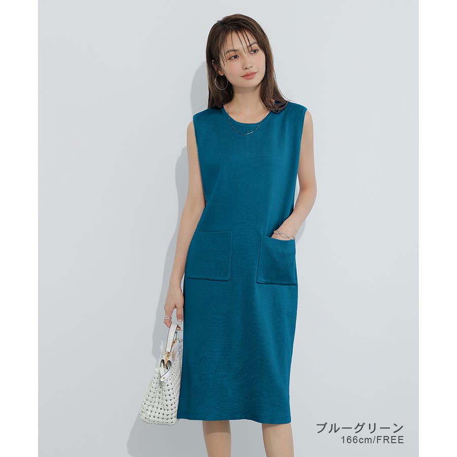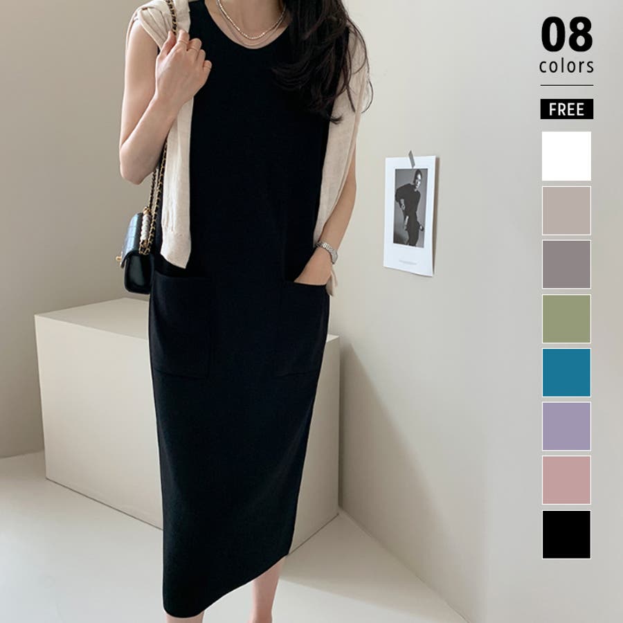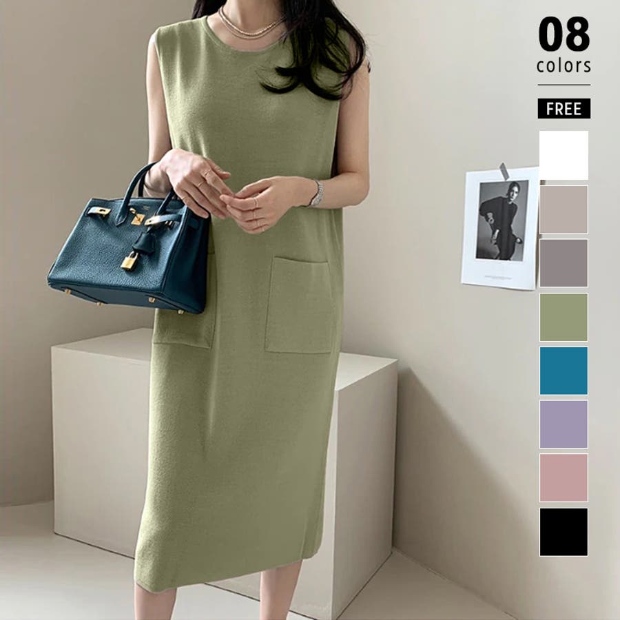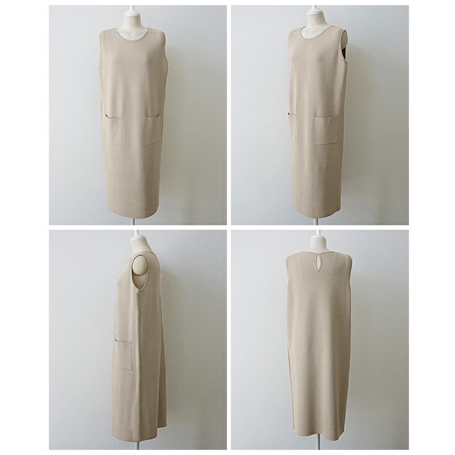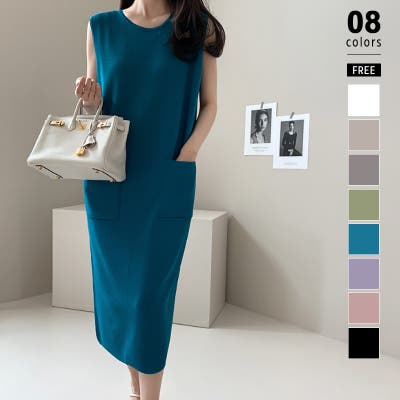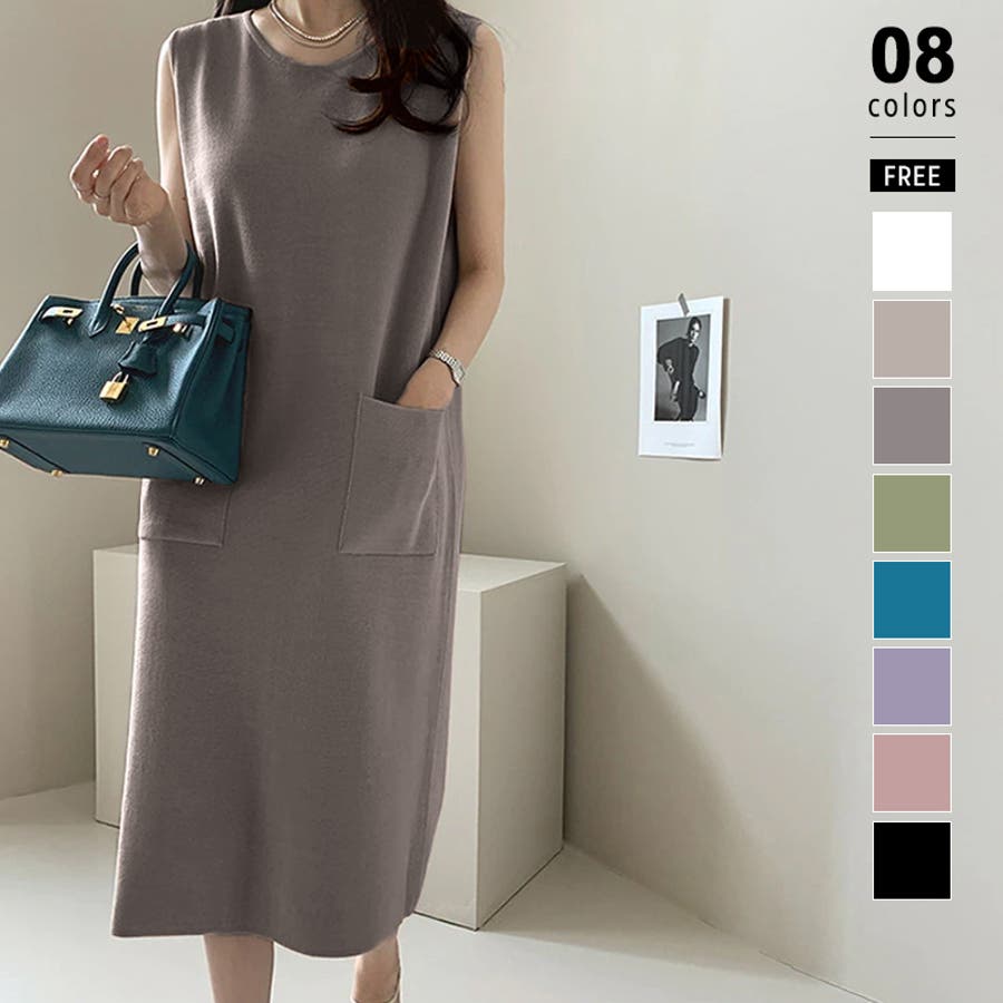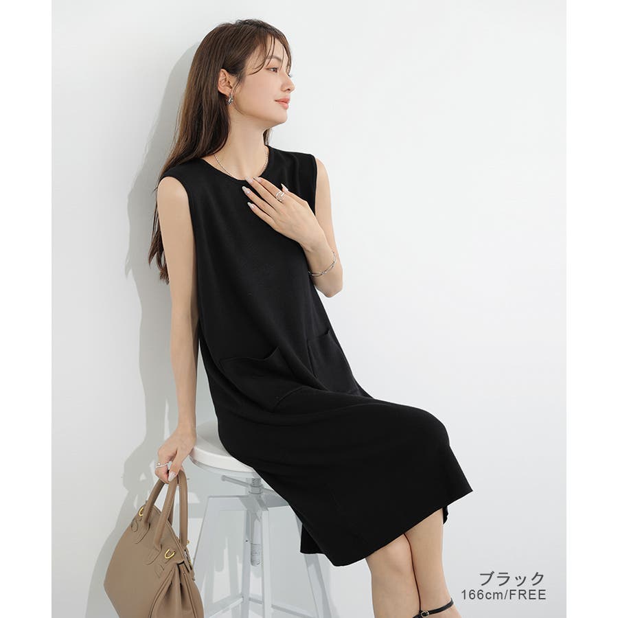 レディース ワンピース ノースリーブ タイトワンピース | Free 無地 ひざ下丈 ニット ポケットつき クルーネック アクリル カジュアル オフィス ビジネス 大人 上品 韓国 韓国ファッション 20代 30代 40代 50代 cocomomo 秋 秋服 春服