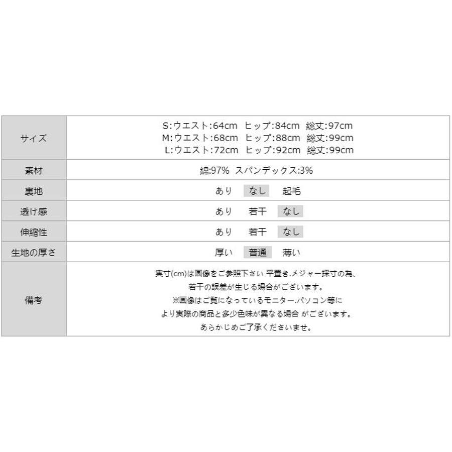 | サイズ | S:総丈97cm ウエスト64cm ヒップ84cm M:総丈99cm ウエスト68cm ヒップ88cm L:総丈99cm ウエスト72cm ヒップ92cm |