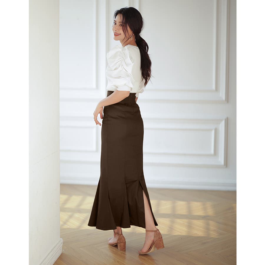S M L 無地 ロング丈 綿 コットン バックスリット ハイウエスト スタイルアップ フェミニン ママコーデ 20代 30代 40代 50代 cocomomo 韓国 韓国ファッション 春 夏 秋 冬 春服 夏服 秋服 冬服