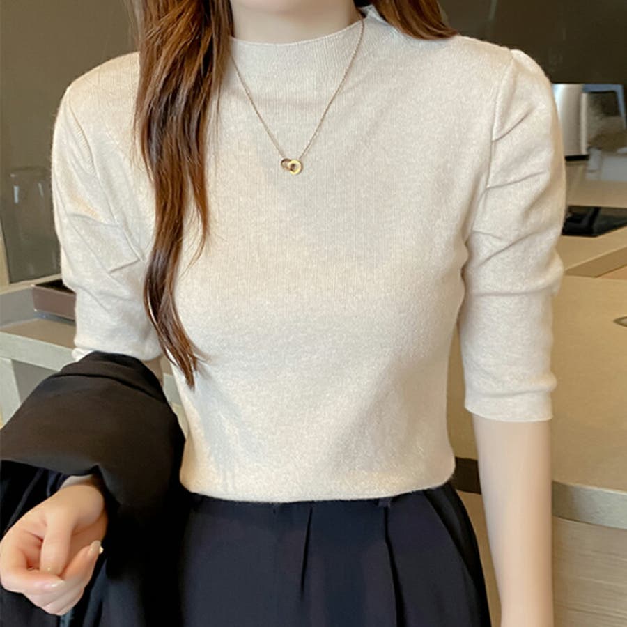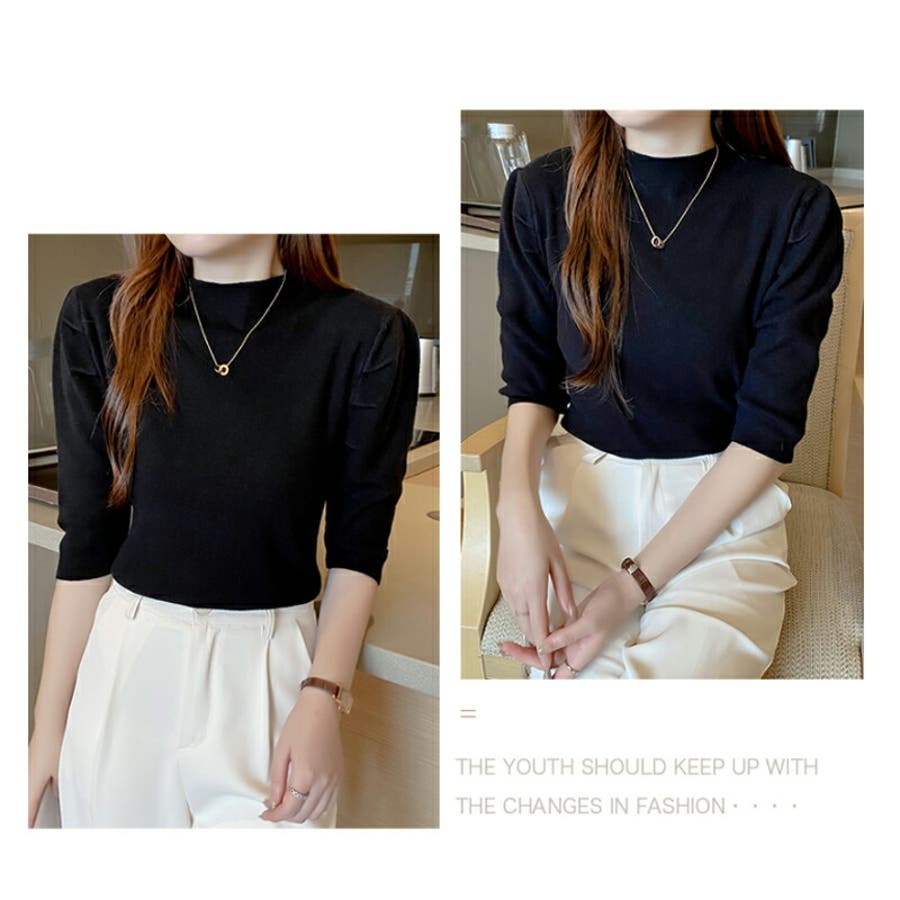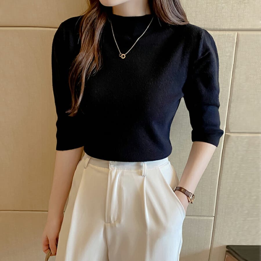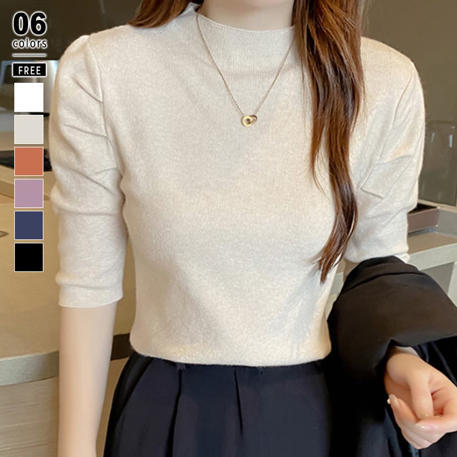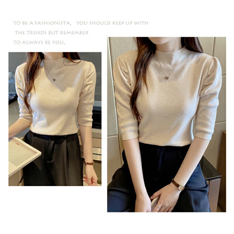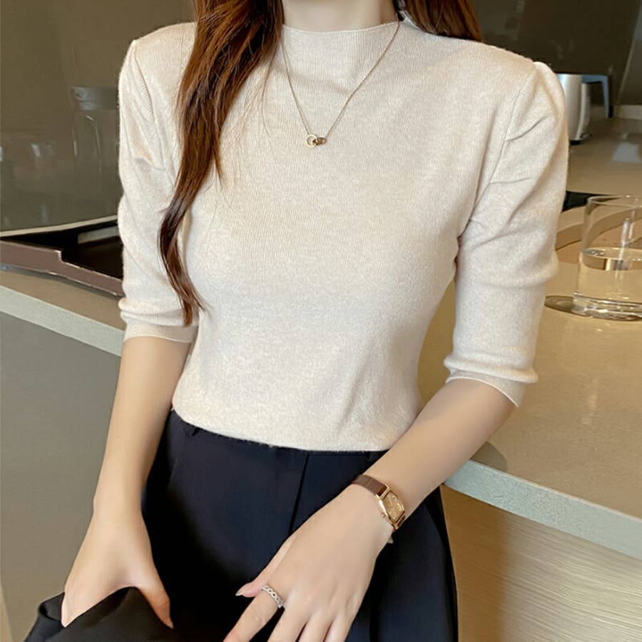Free 無地 5分袖 ハイネック アクリル パワーショルダー きれいめ 上品 エレガント フェミニン ママコーデ 20代 30代 40代 50代 cocomomo 秋冬 冬 冬服 韓国 韓国ファッション