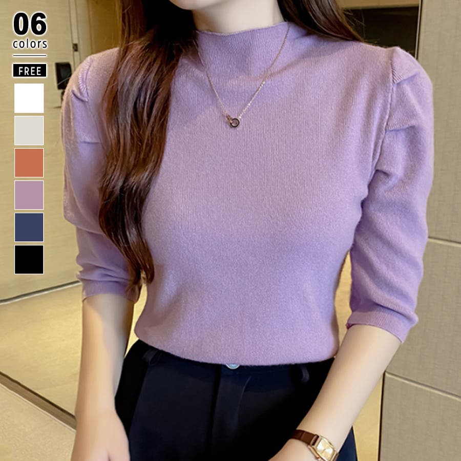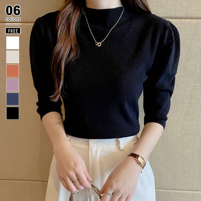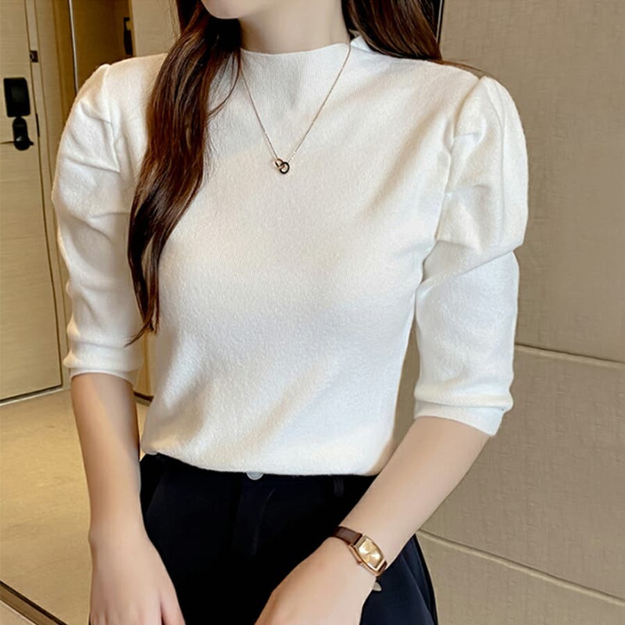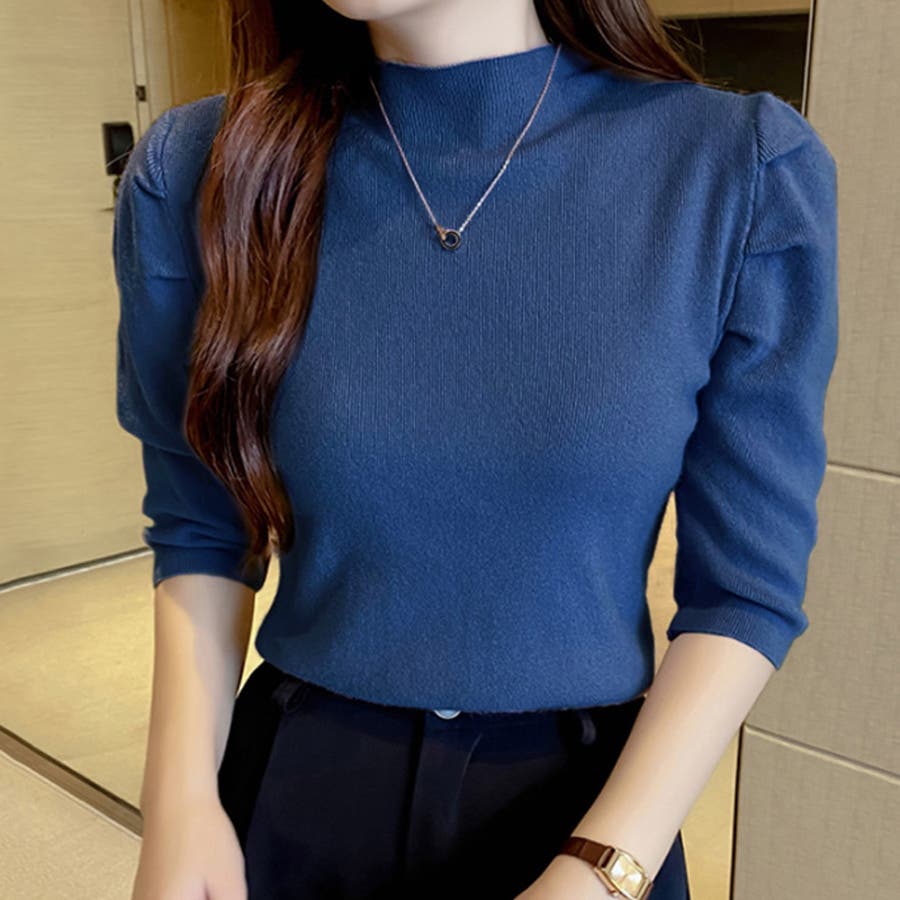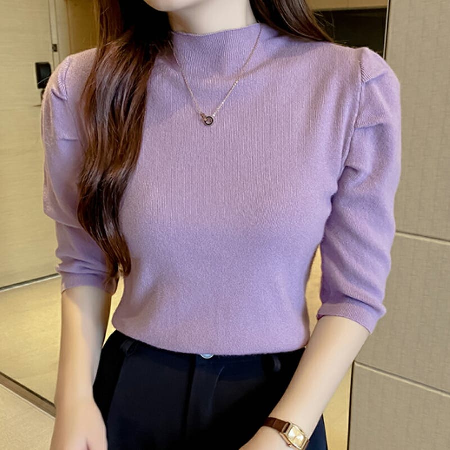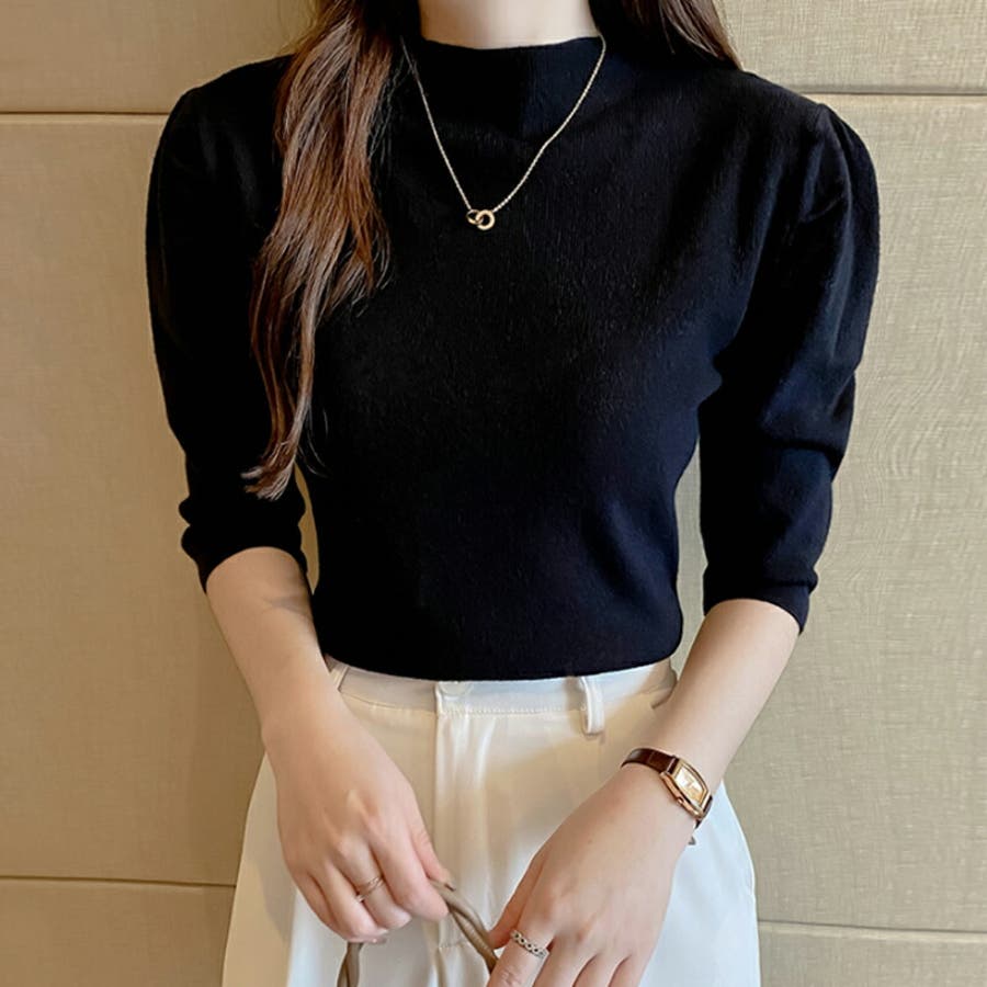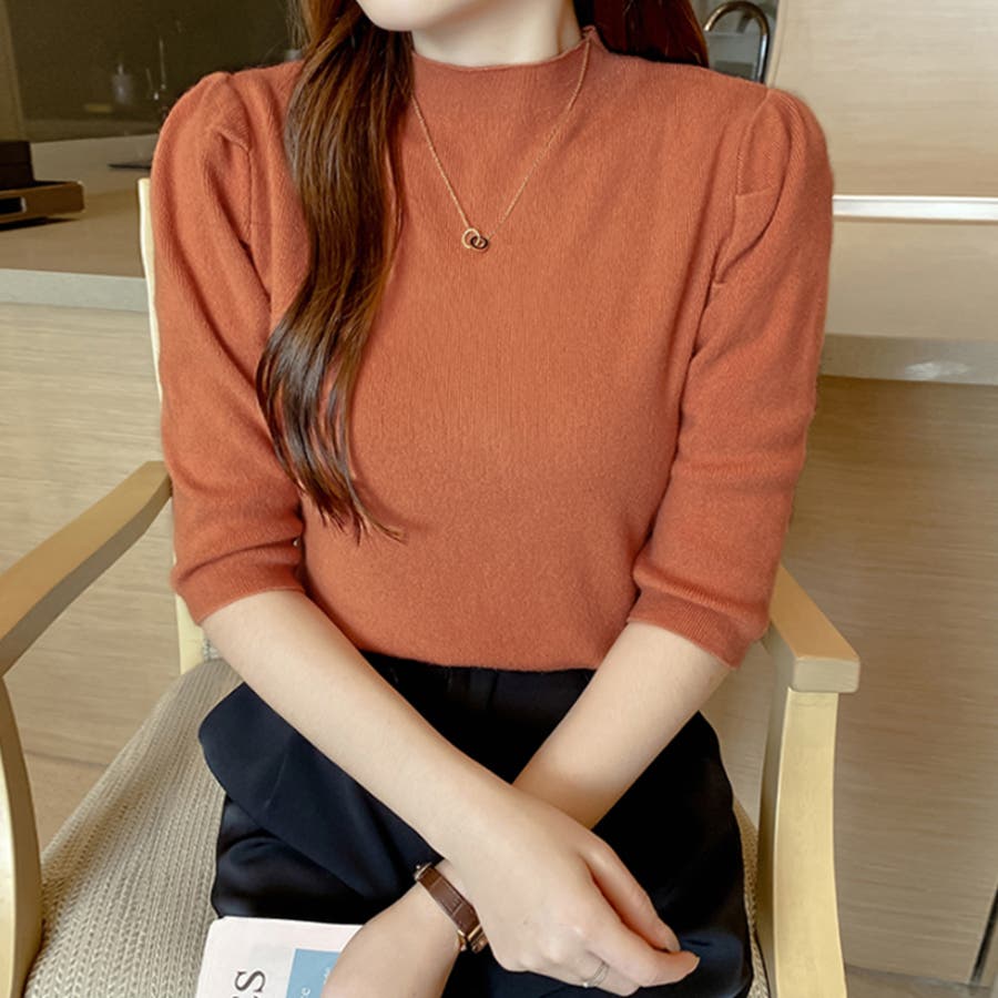 Free 無地 5分袖 ハイネック アクリル パワーショルダー きれいめ 上品 エレガント フェミニン ママコーデ 20代 30代 40代 50代 cocomomo 秋冬 冬 冬服 韓国 韓国ファッション