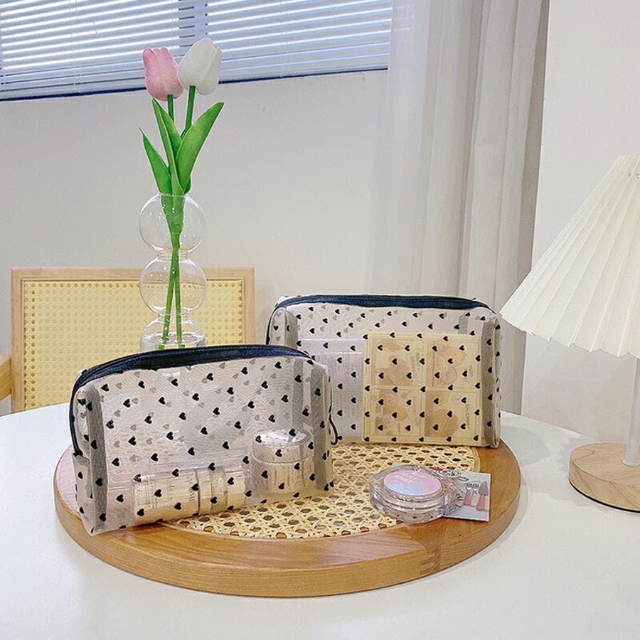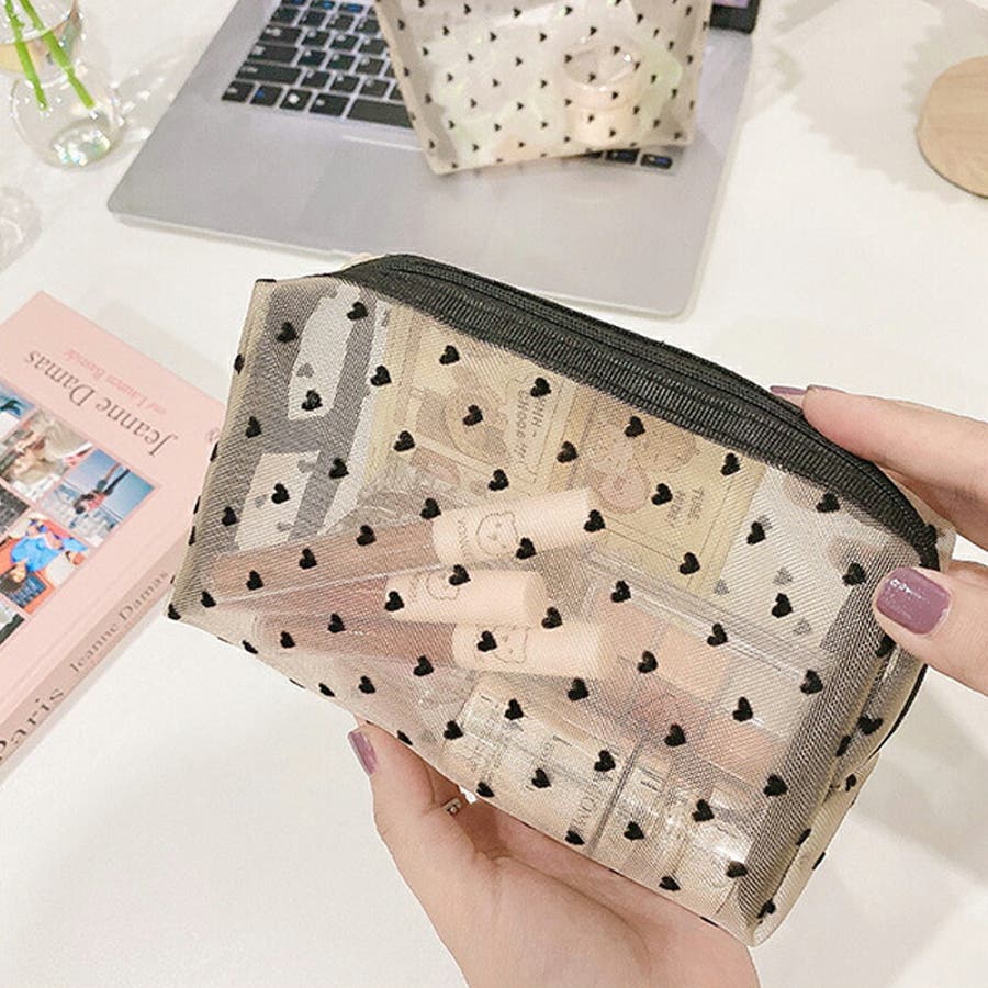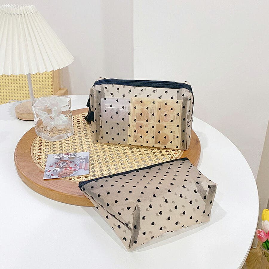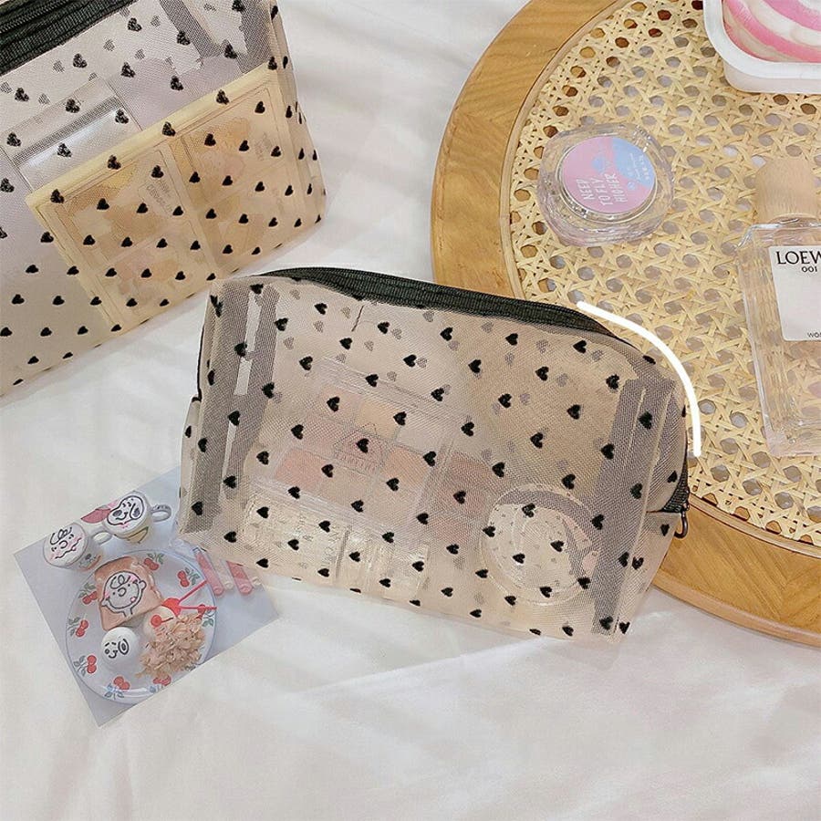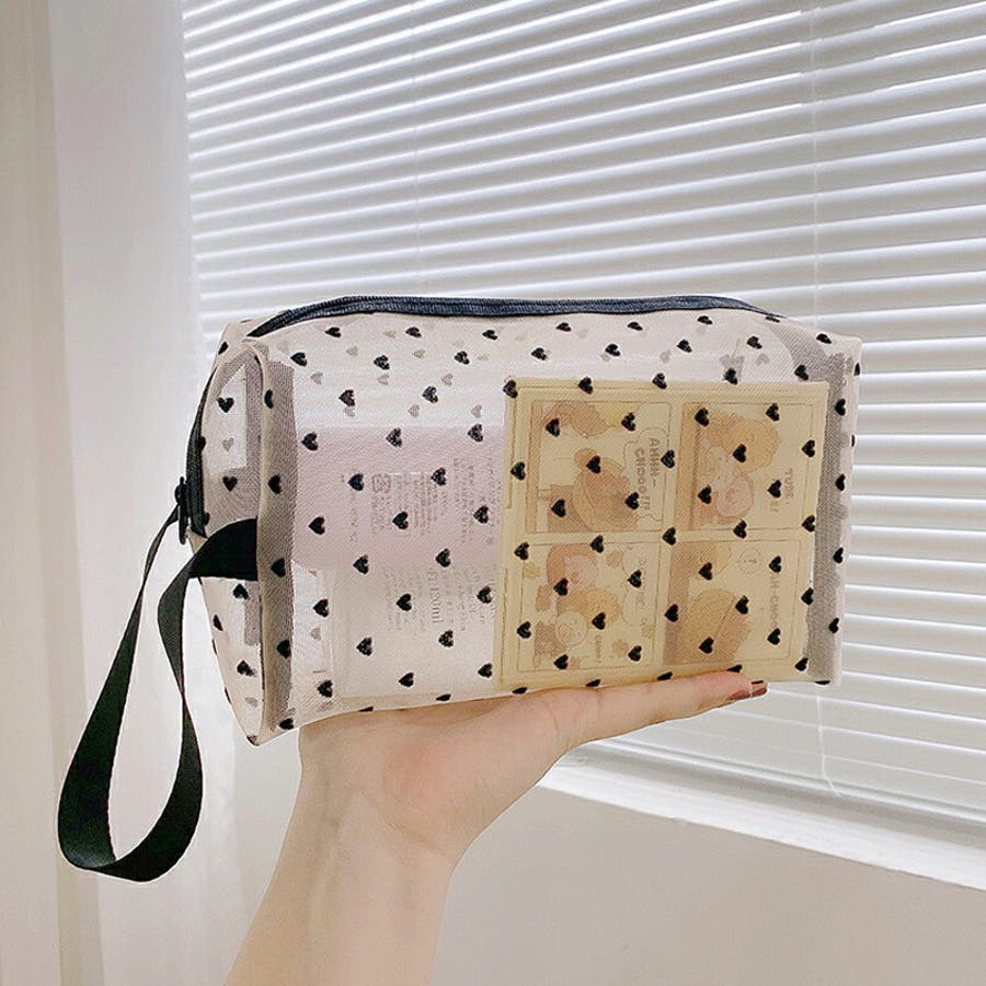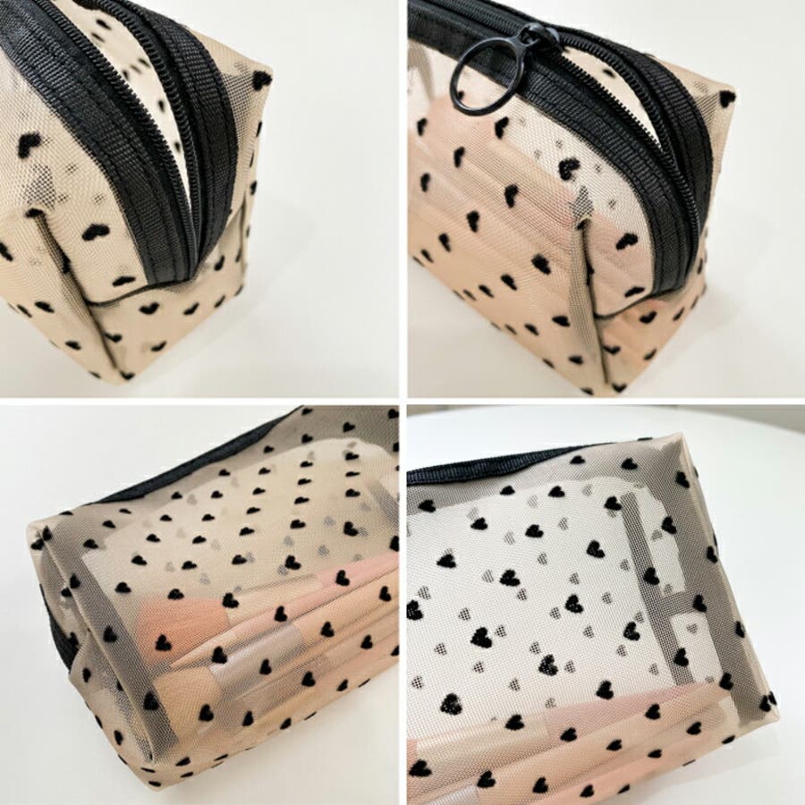 メッシュポーチ ハート柄 プリントポーチ 日用雑貨 バッグ 小物 整理 整頓 旅行 筆箱 デイリーポーチ 収納 可愛い