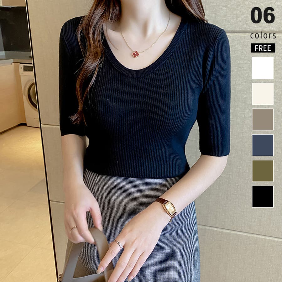 リブニット クルーネック 半袖 五分袖 トップス Free 無地 シンプル カットソー レディース 春 夏 大人 ワンマイルウェア