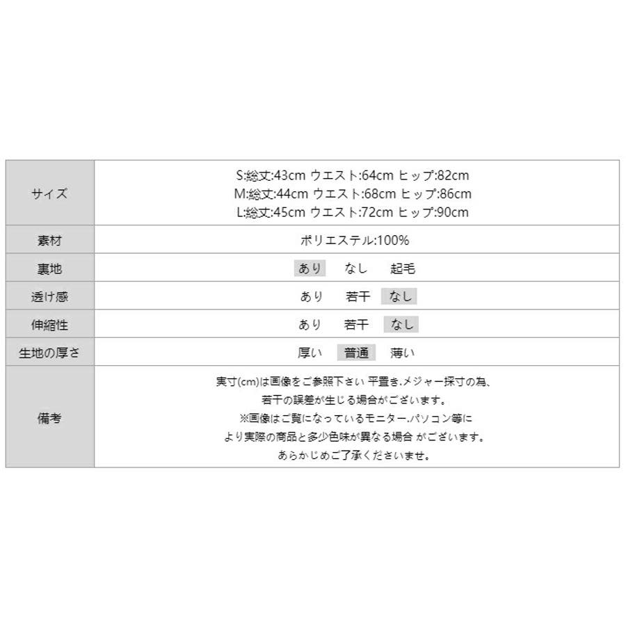 | サイズ | S:総丈 43cm ウエスト 64cm ヒップ 82cm M:総丈 44cm ウエスト 68cm ヒップ 86cm L:総丈 45cm ウエスト 72cm ヒップ 90cm |