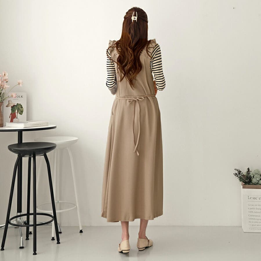 レディースロングワンピース エプロンワンピース ポケット付き ウェスト紐付き 伸縮性 ポンチワンピース フェミニン かわいい 楽ちん