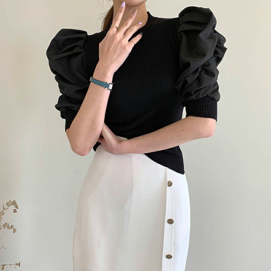 異素材ボリューム袖 ドッキング ニット プルオーバー パフスリーブ 半袖ブラウス サマーニット 大人 上品 レディーストップス 切り替え