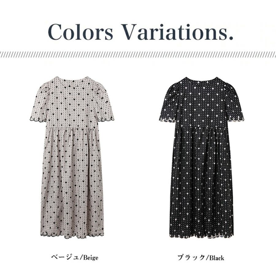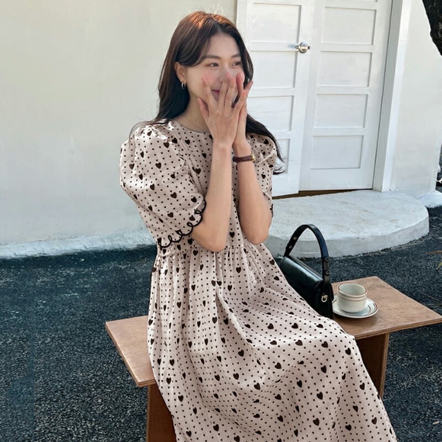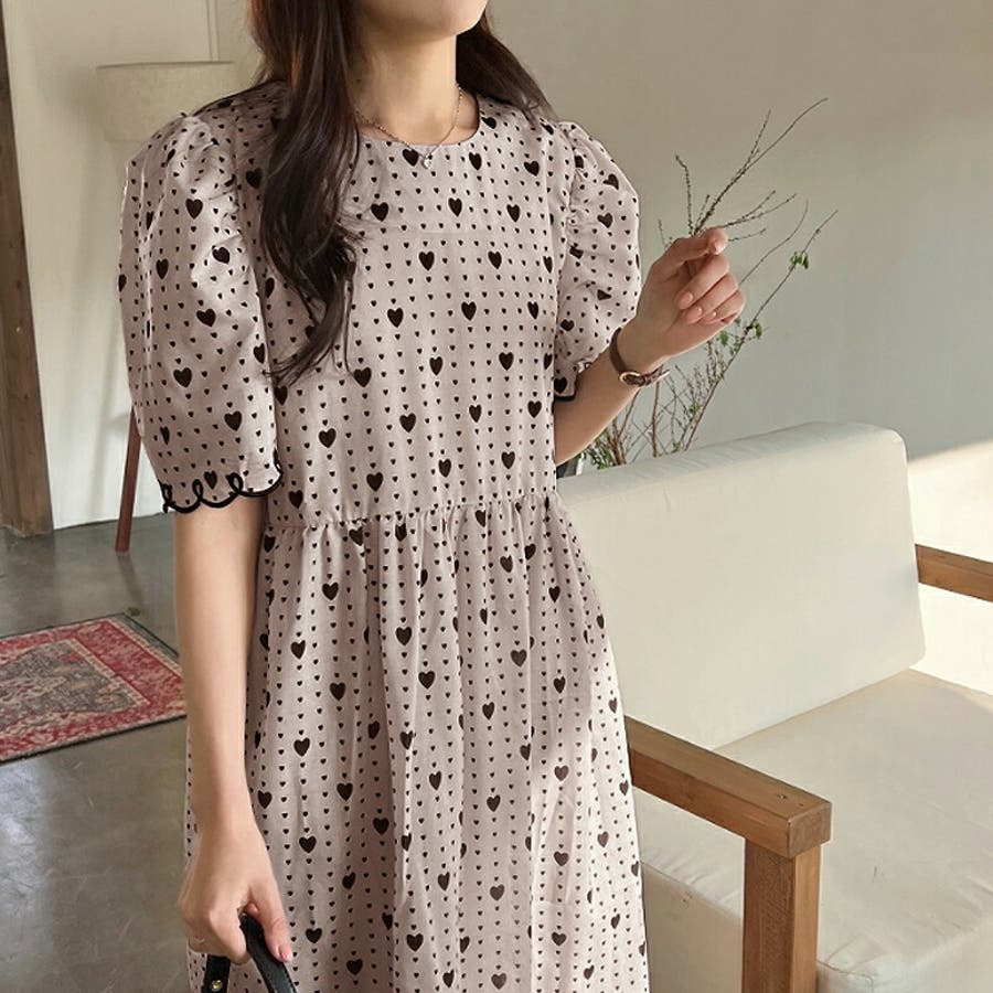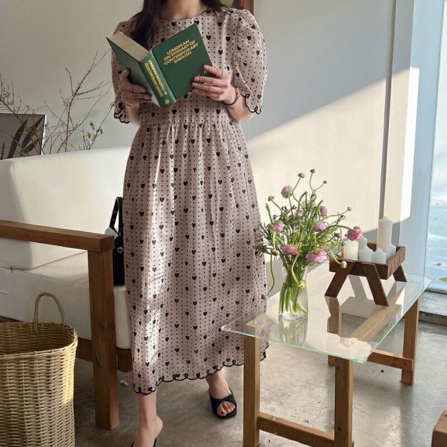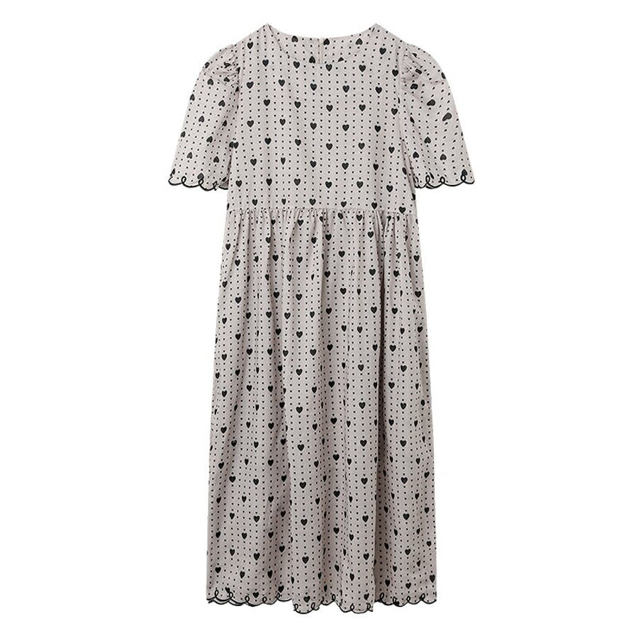 ワンピース ロングワンピース ハート ドット柄 ワンピース 半袖 パフスリーブ スカラップ ミモレ丈 春 夏