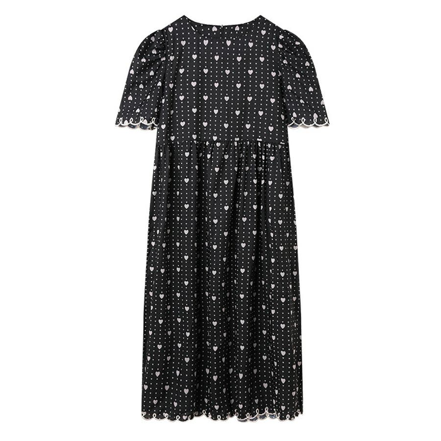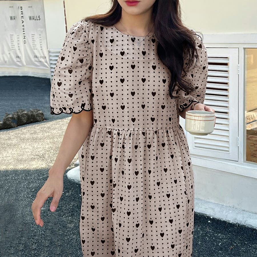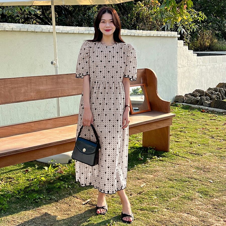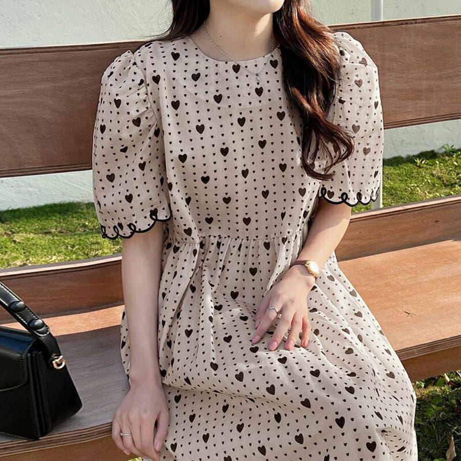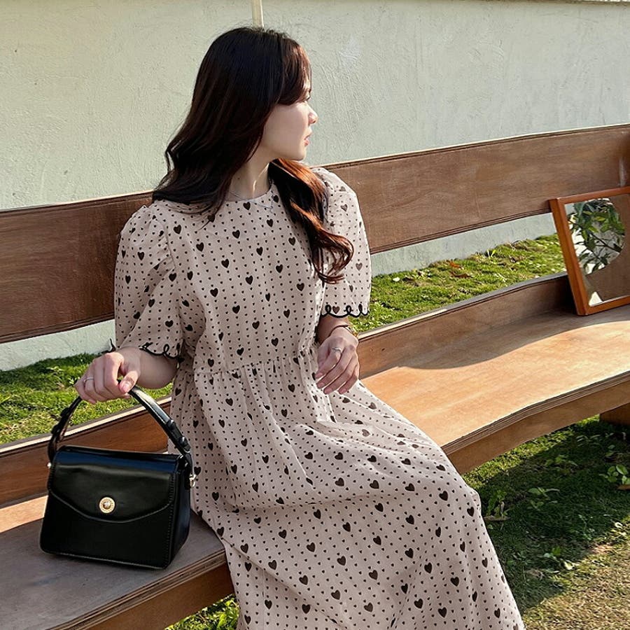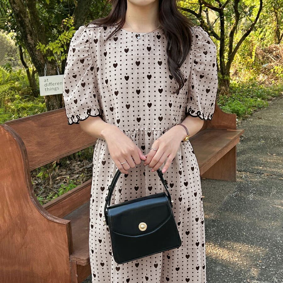 ワンピース ロングワンピース ハート ドット柄 ワンピース 半袖 パフスリーブ スカラップ ミモレ丈 春 夏