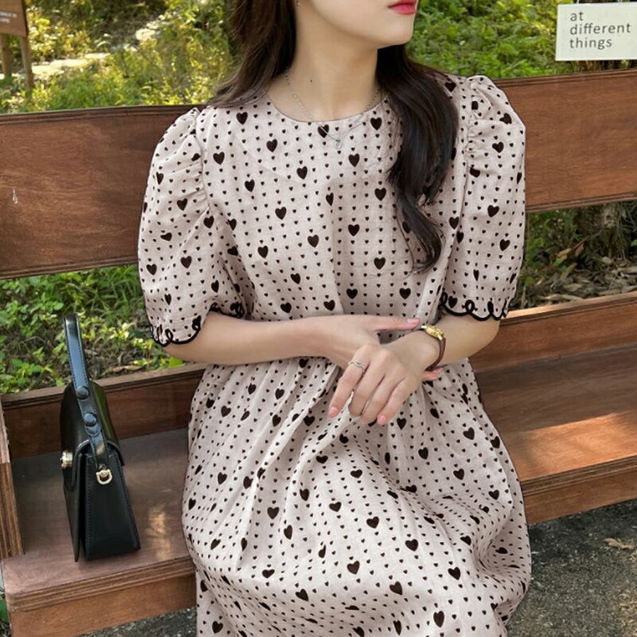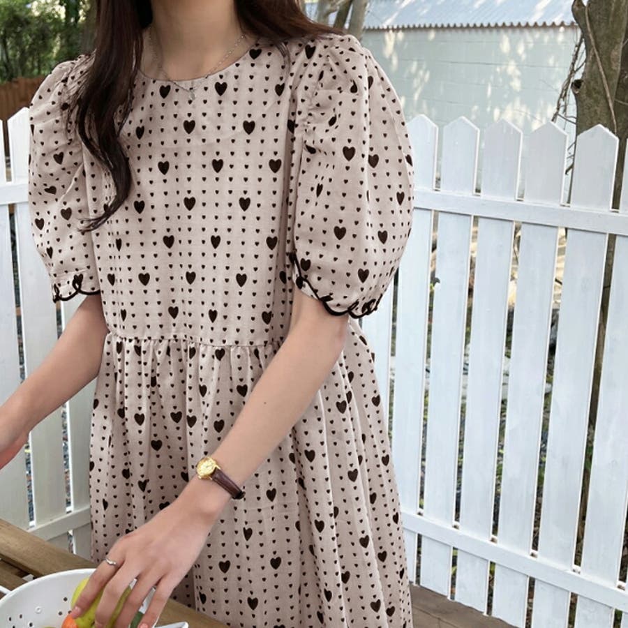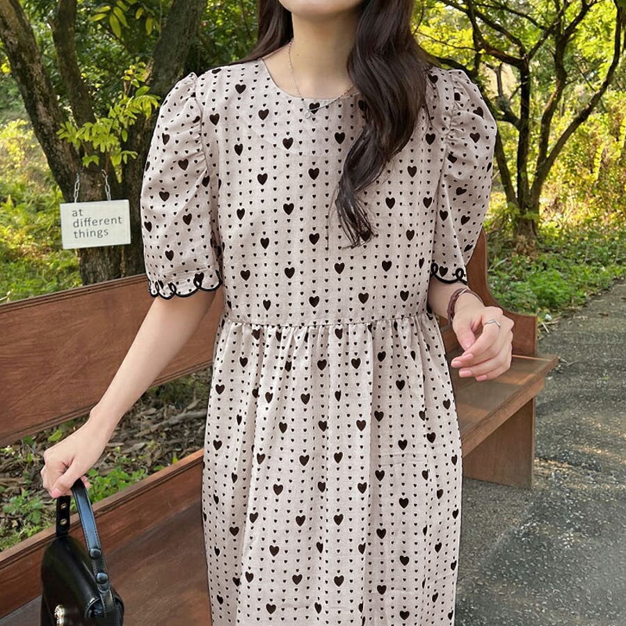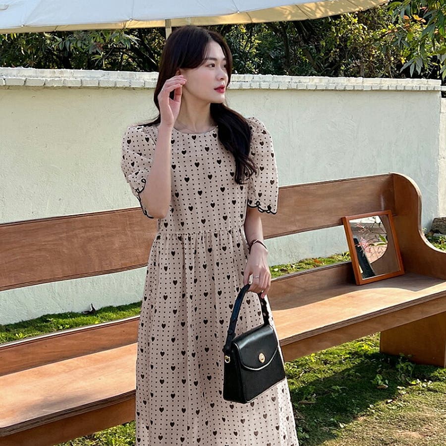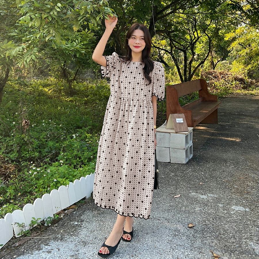 ワンピース ロングワンピース ハート ドット柄 ワンピース 半袖 パフスリーブ スカラップ ミモレ丈 春 夏