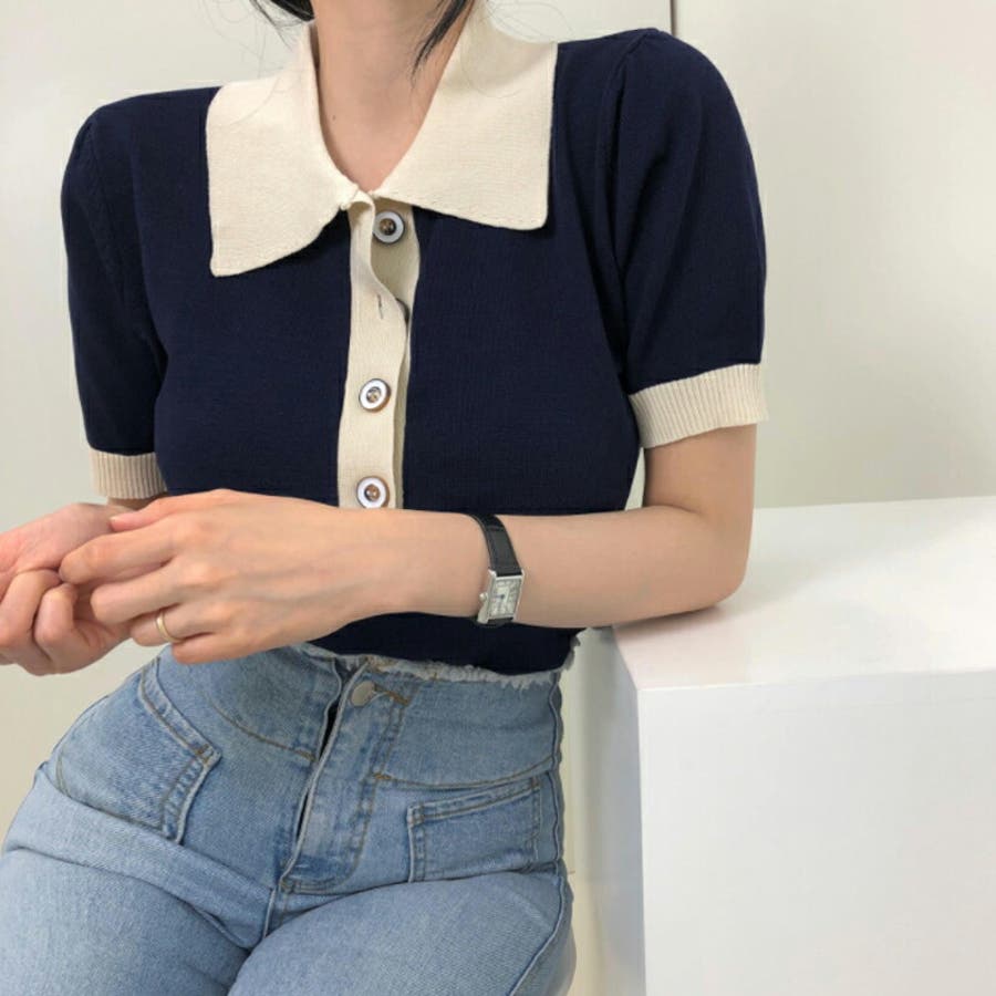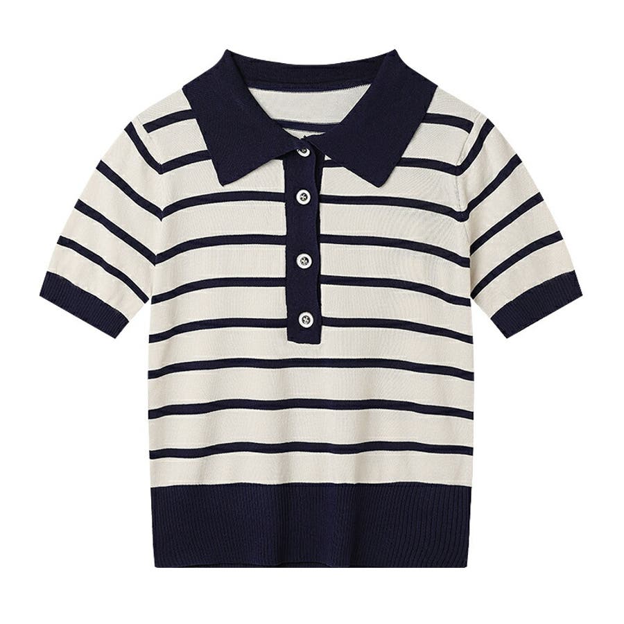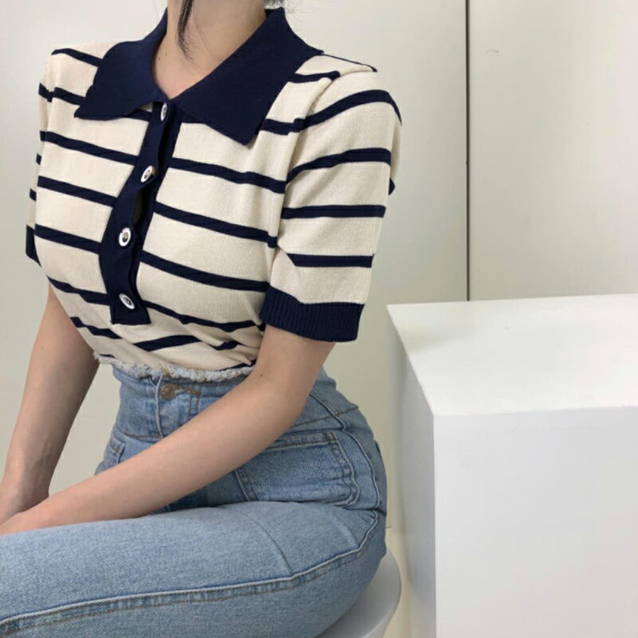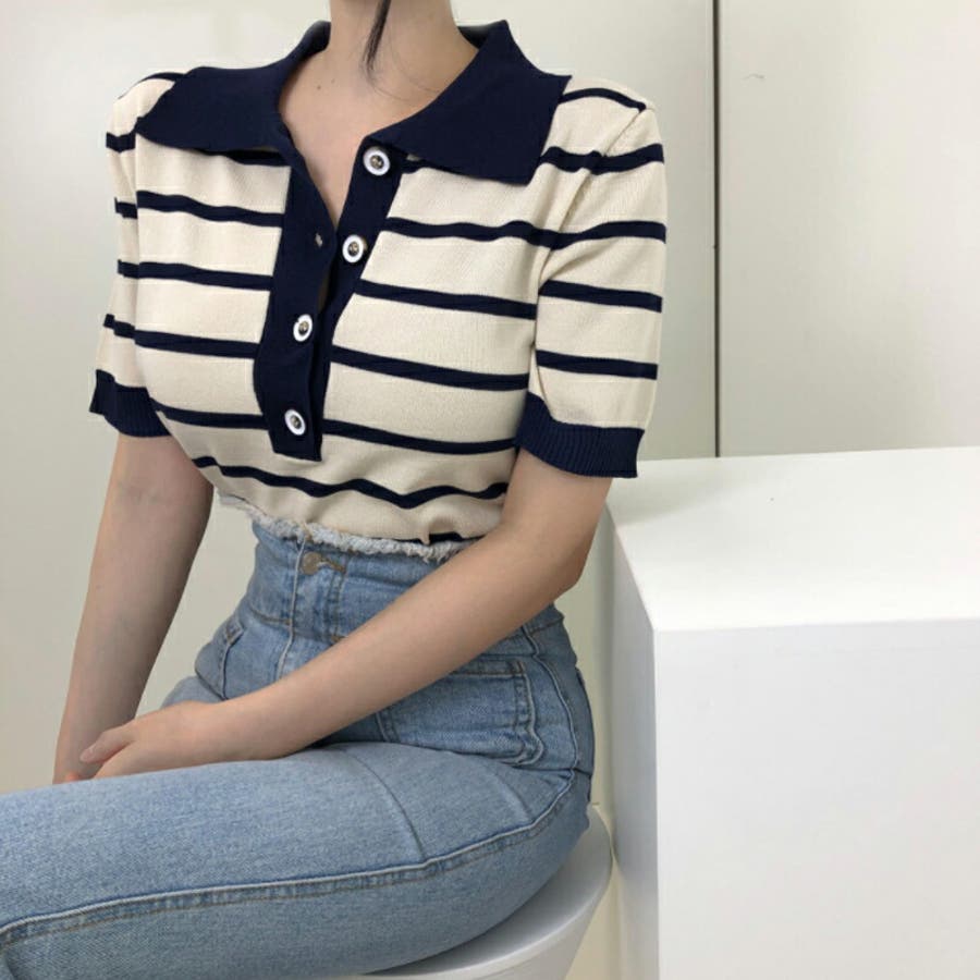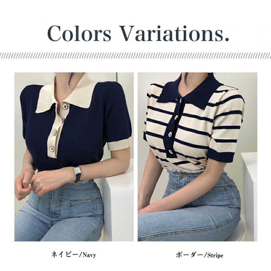 ニット 半袖 襟付きニット サマーニット ショート丈 トップス レディース 無地 ボーダー ストレッチ 柔らかい