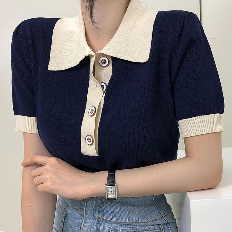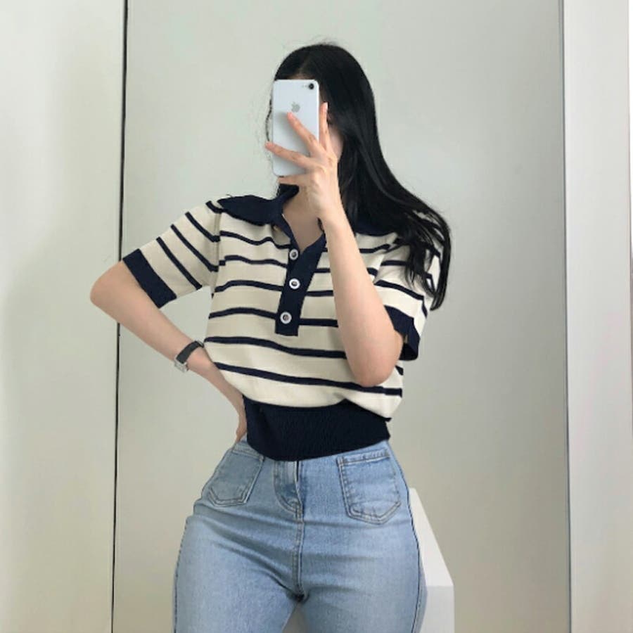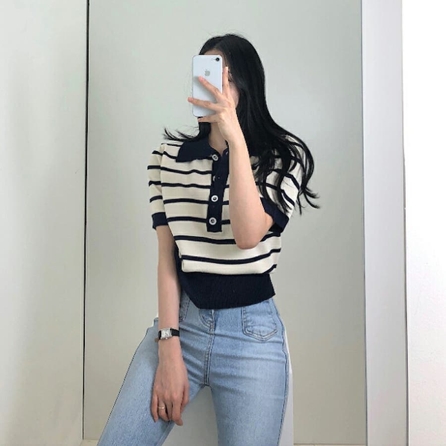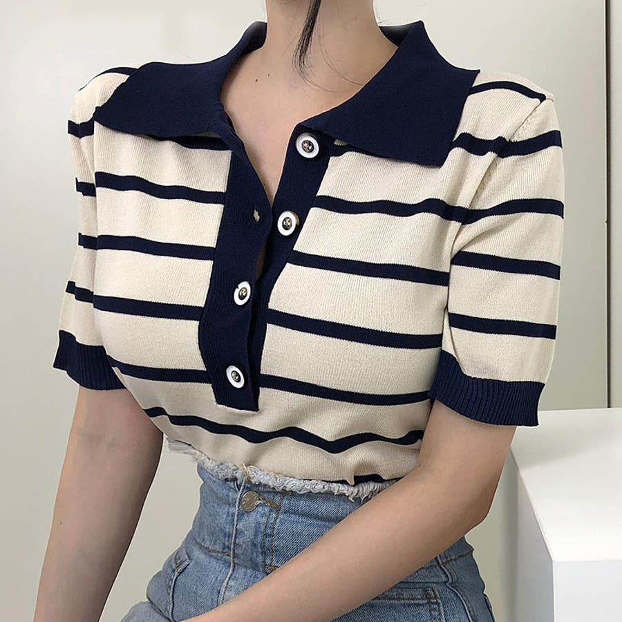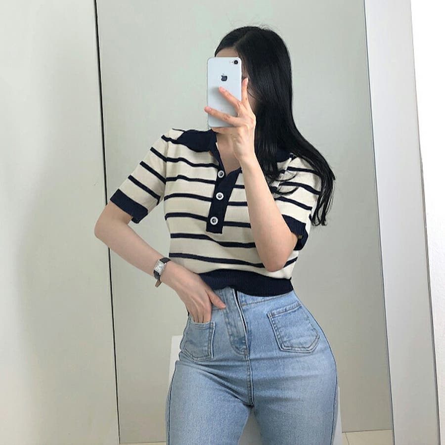 ニット 半袖 襟付きニット サマーニット ショート丈 トップス レディース 無地 ボーダー ストレッチ 柔らかい