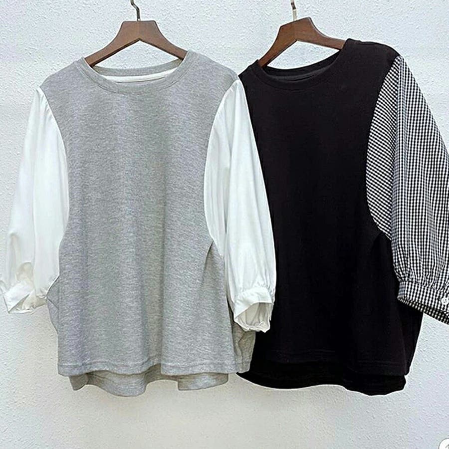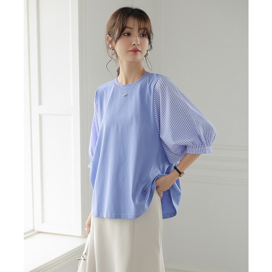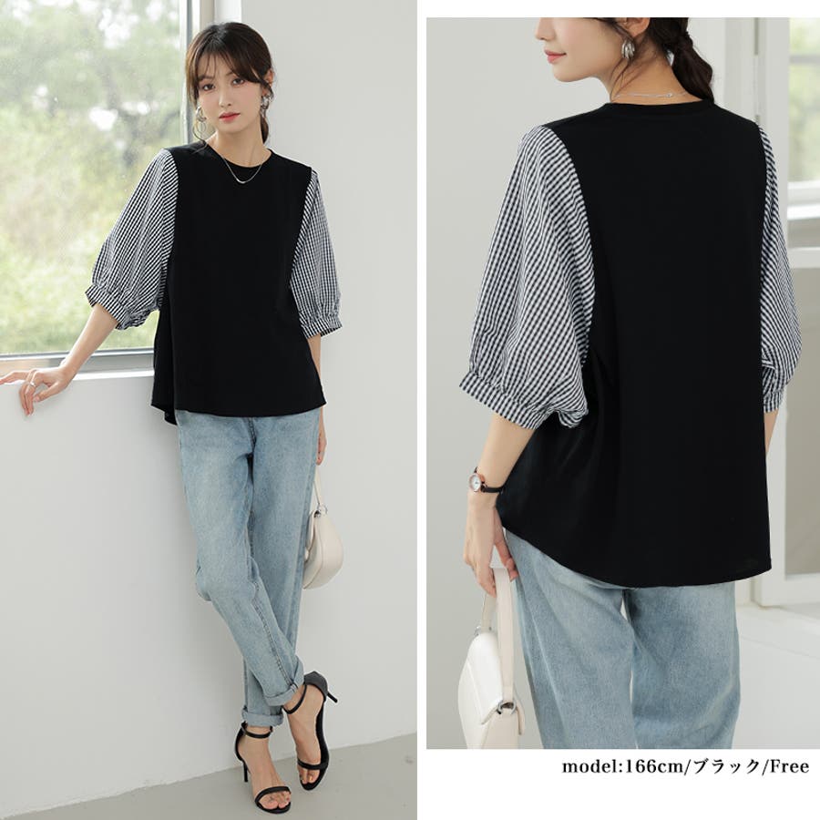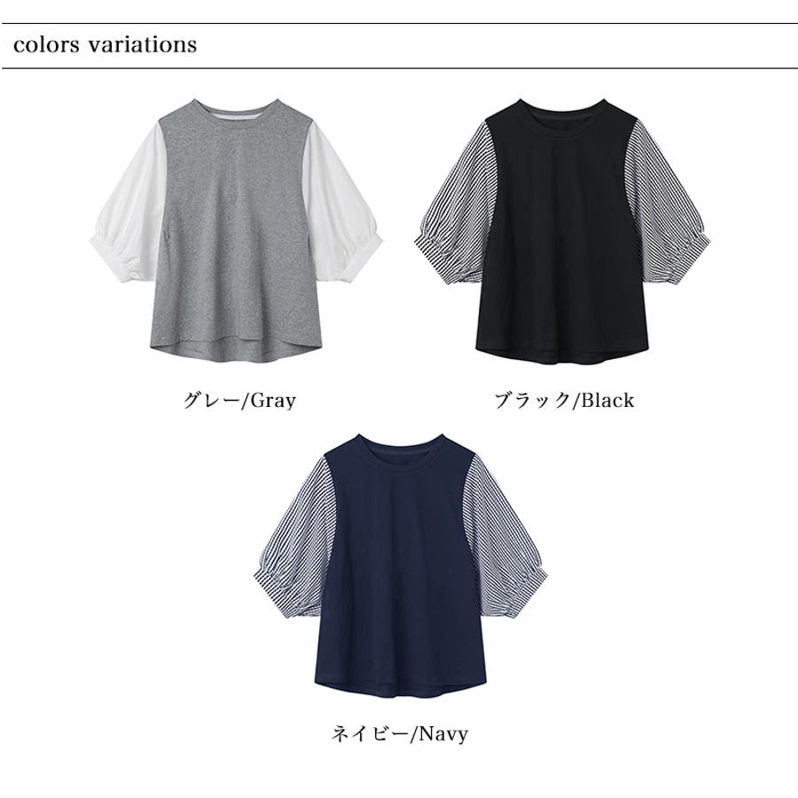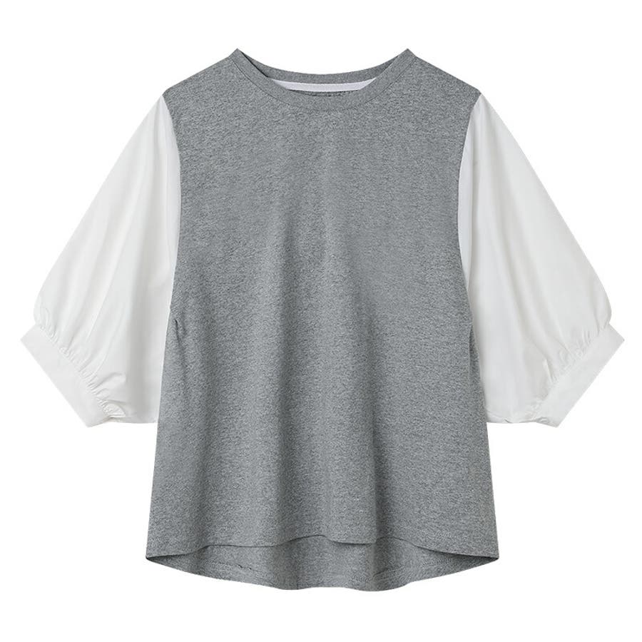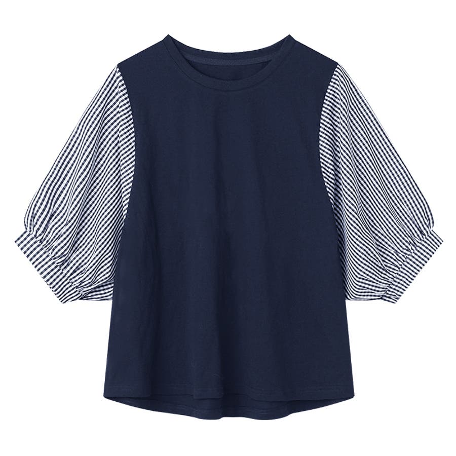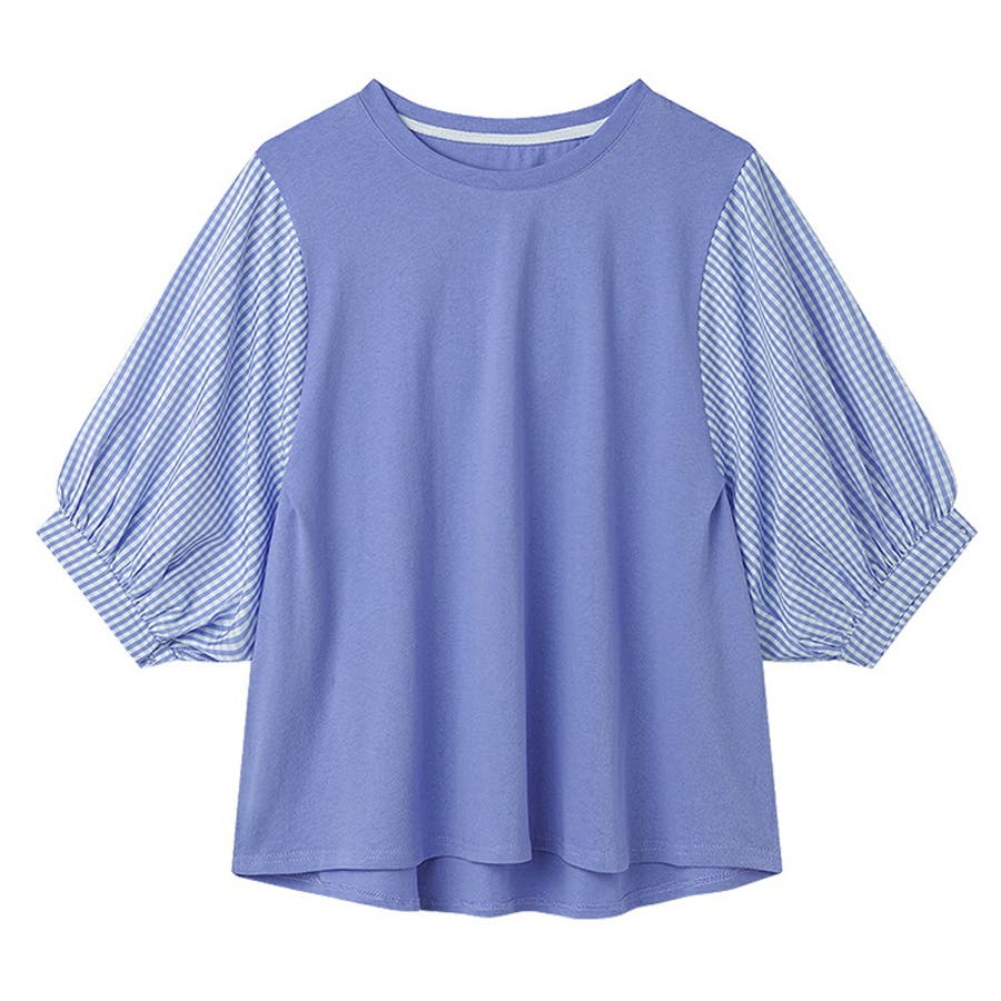 ブラウス コットン100% ドッキング 切り替え 七分丈袖 クルーネック Tシャツ トップス レディース 異素材ボリューム袖 プルオーバー パフスリーブ 七分袖 大人