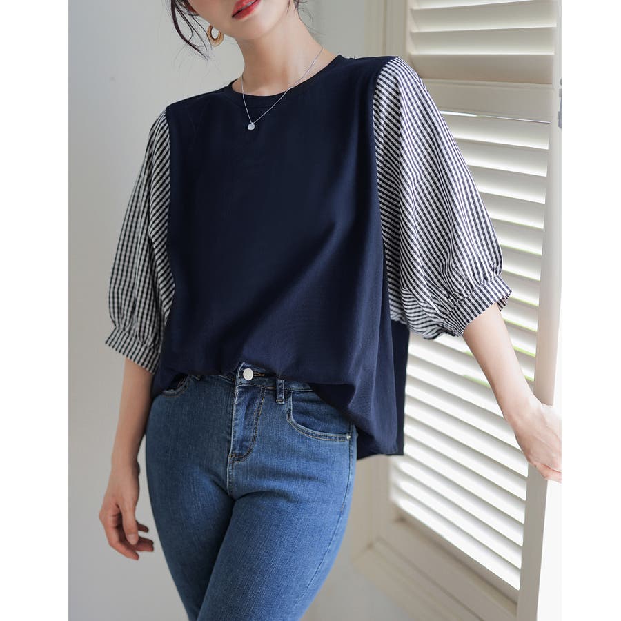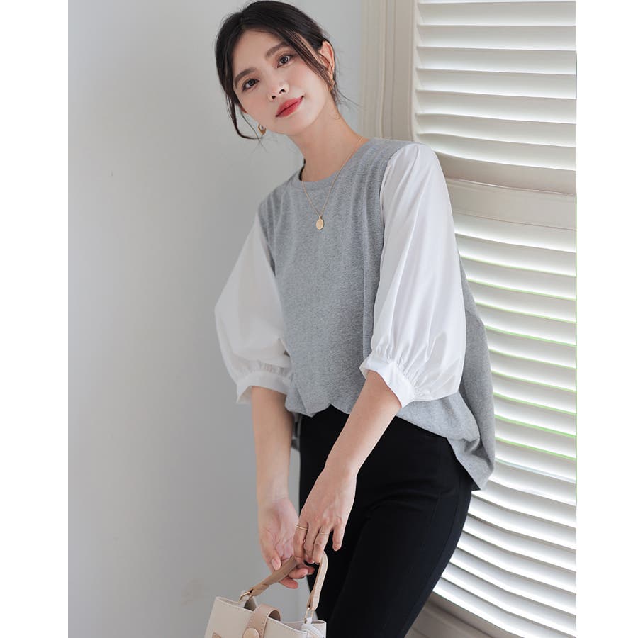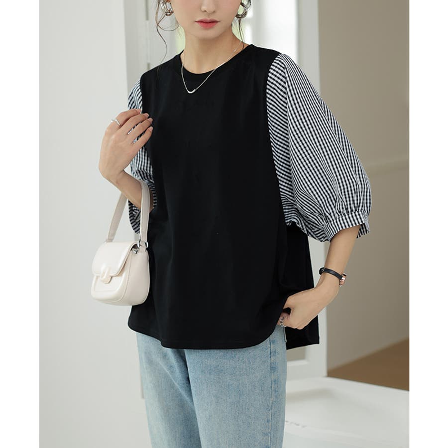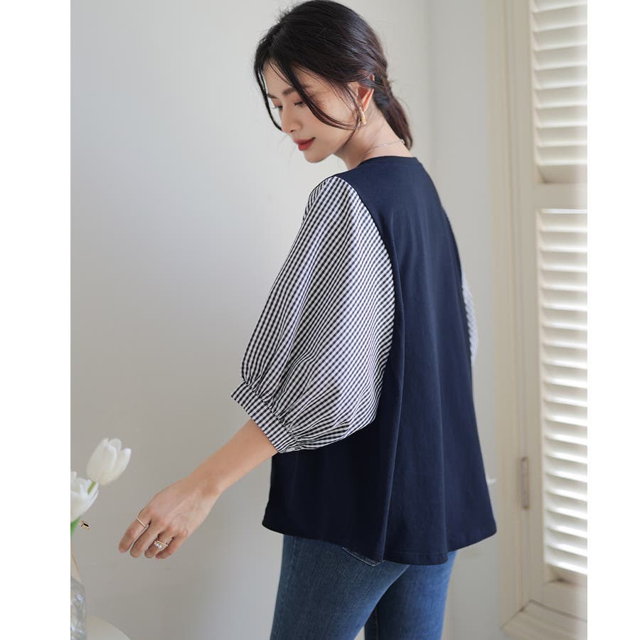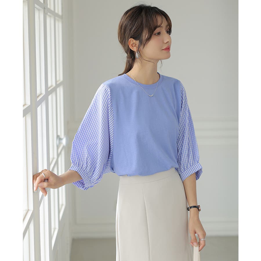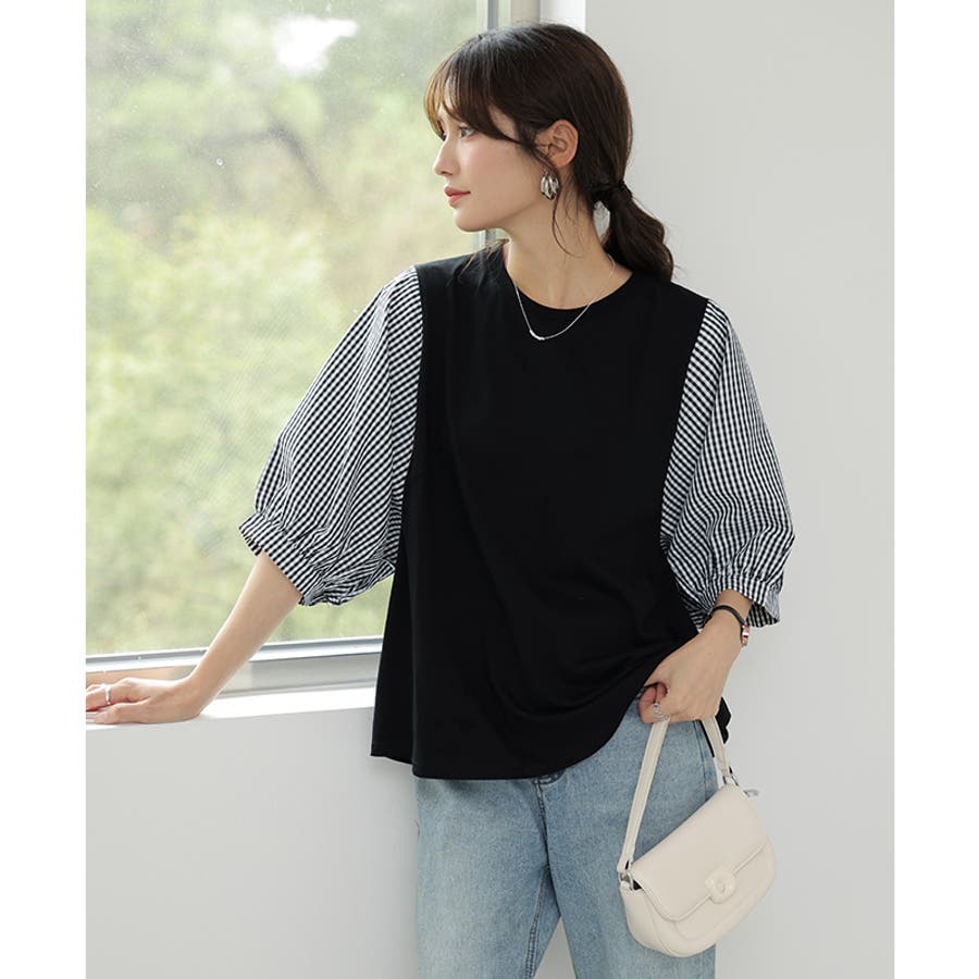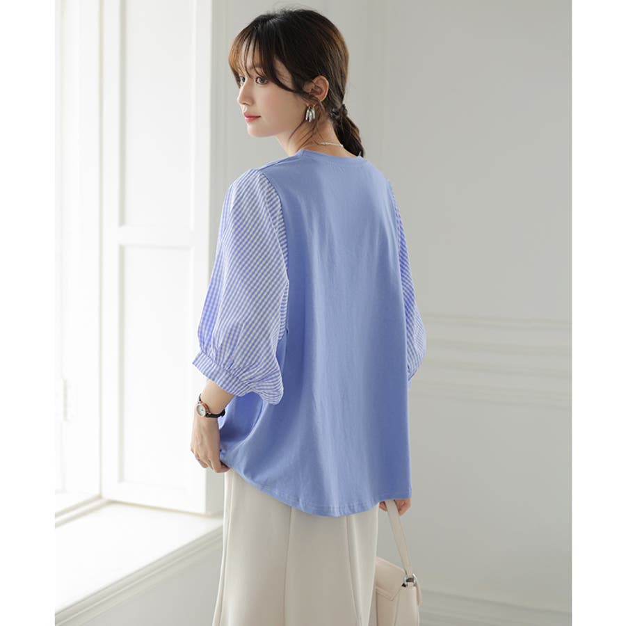 ブラウス コットン100% ドッキング 切り替え 七分丈袖 クルーネック Tシャツ トップス レディース 異素材ボリューム袖 プルオーバー パフスリーブ 七分袖 大人