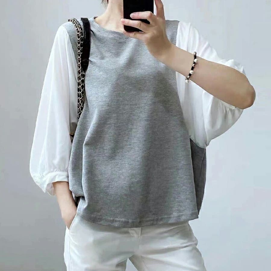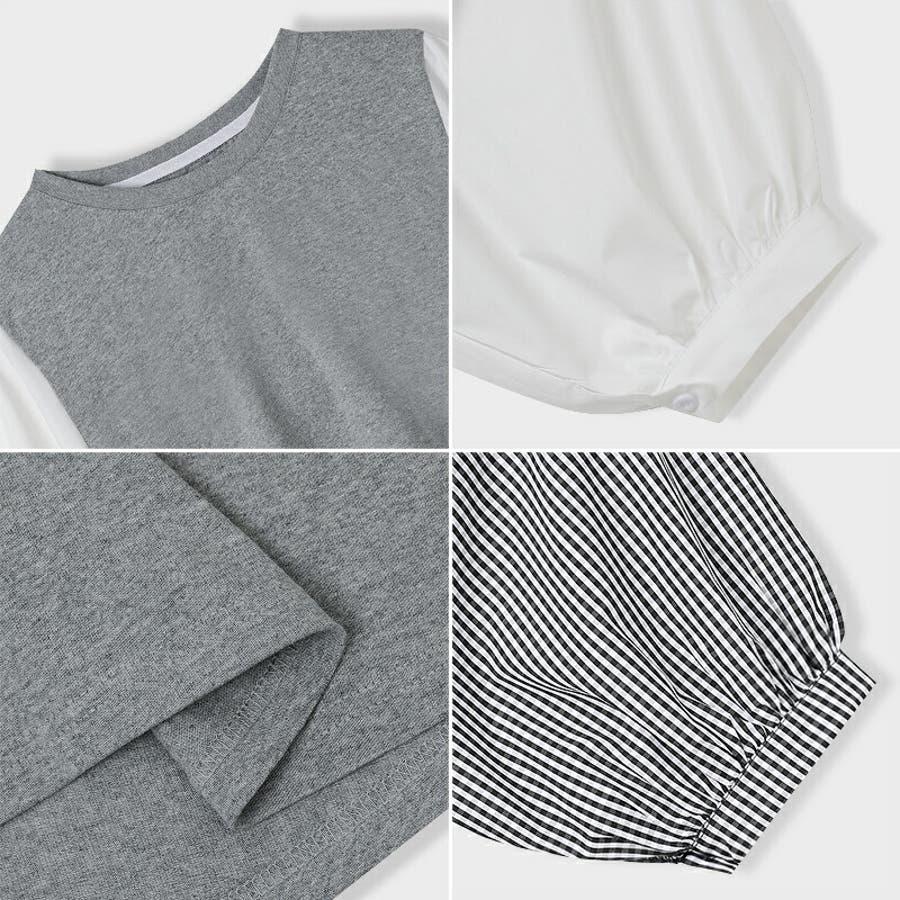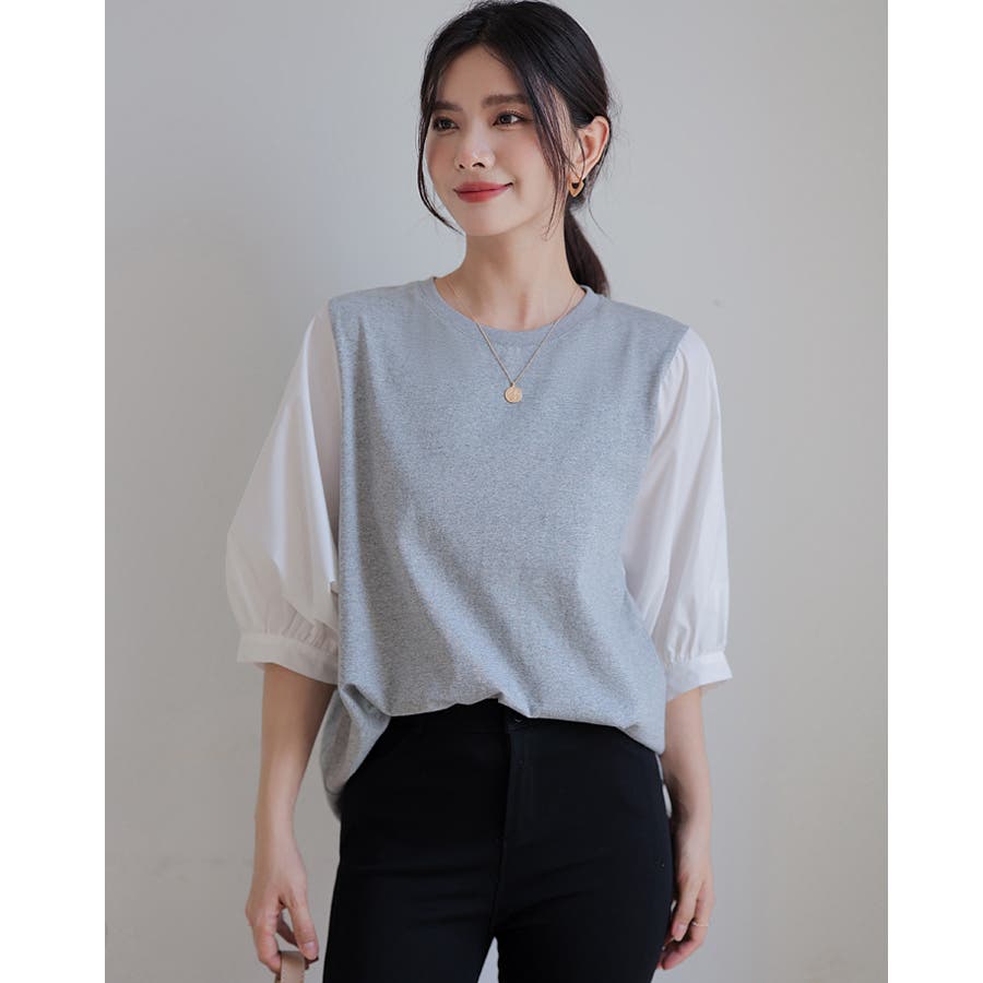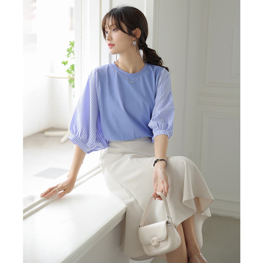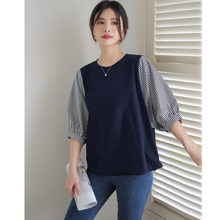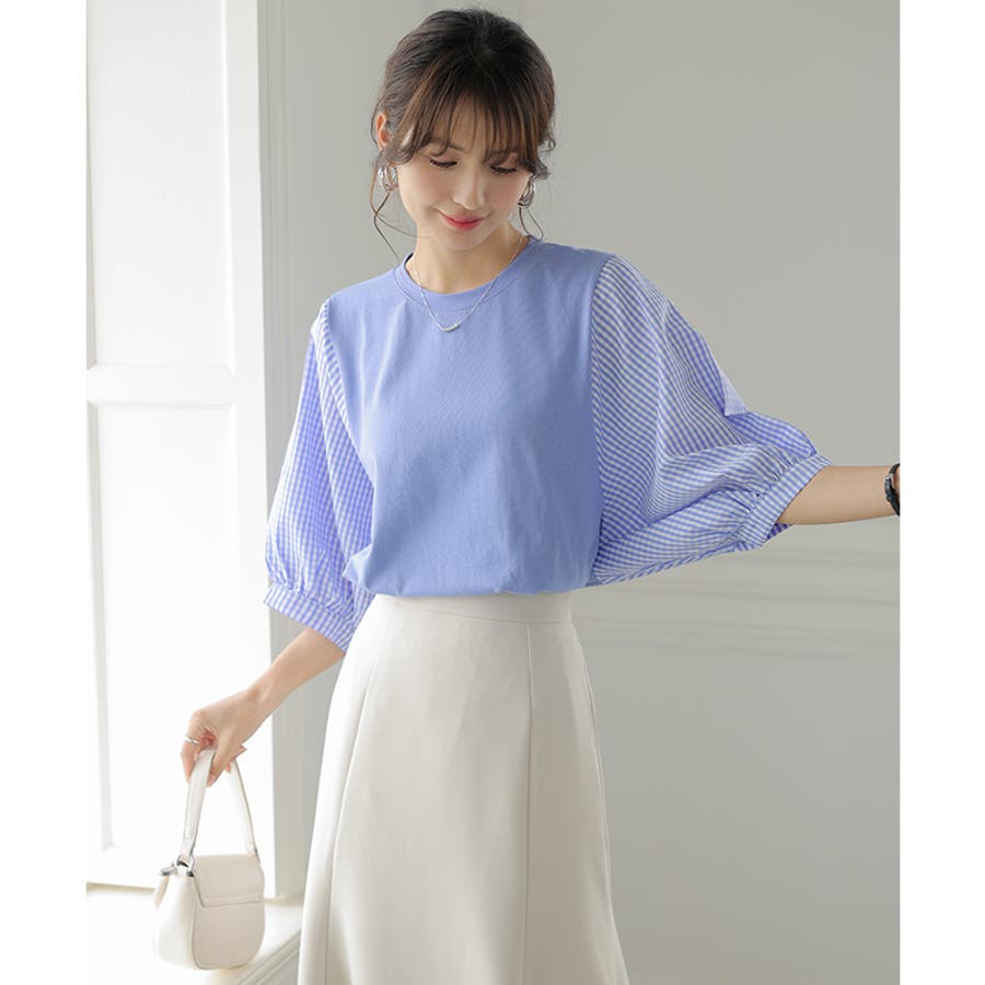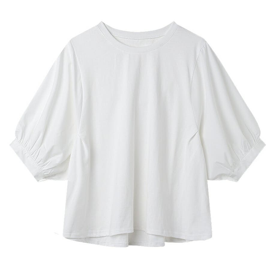 ブラウス コットン100% ドッキング 切り替え 七分丈袖 クルーネック Tシャツ トップス レディース 異素材ボリューム袖 プルオーバー パフスリーブ 七分袖 大人