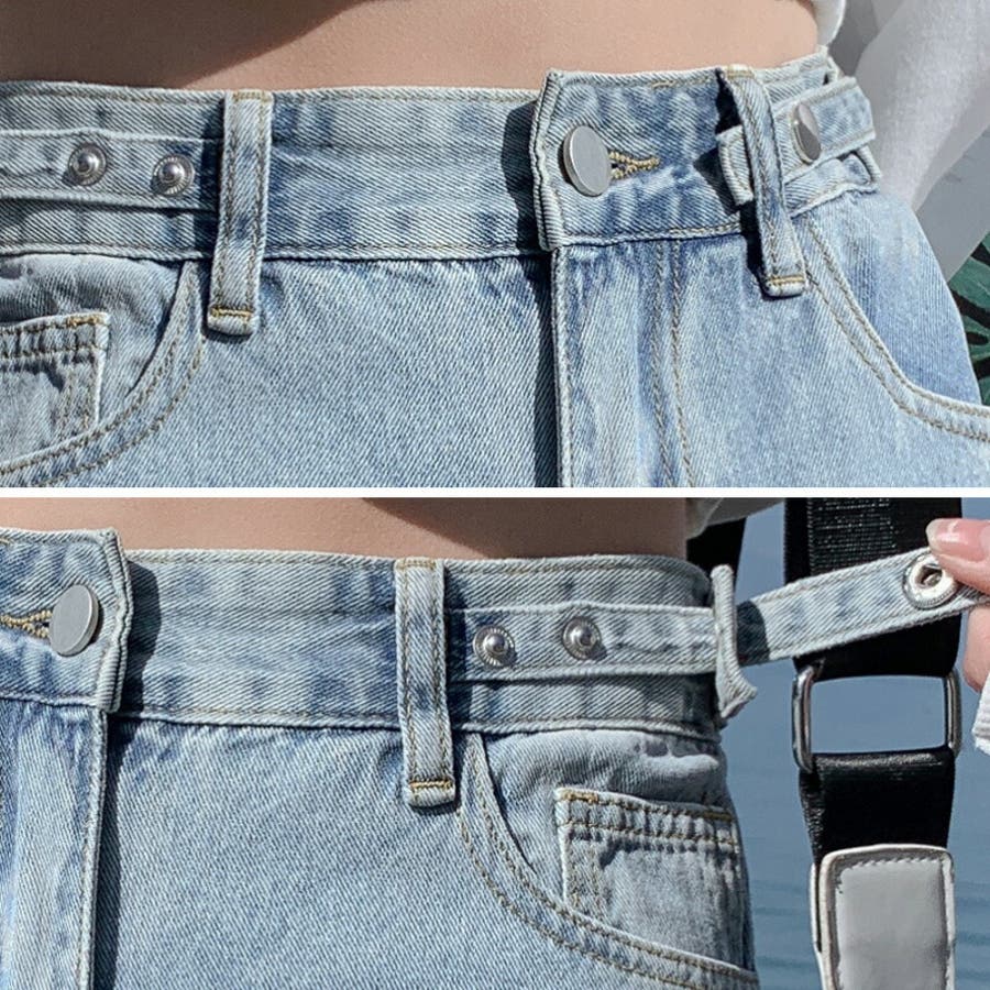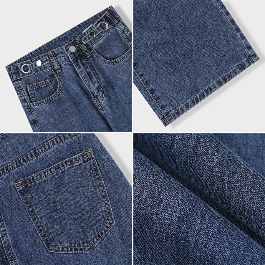 【ロング丈ダークブルー】ウエスト調整可能 デニムパンツ セミワイドパンツ