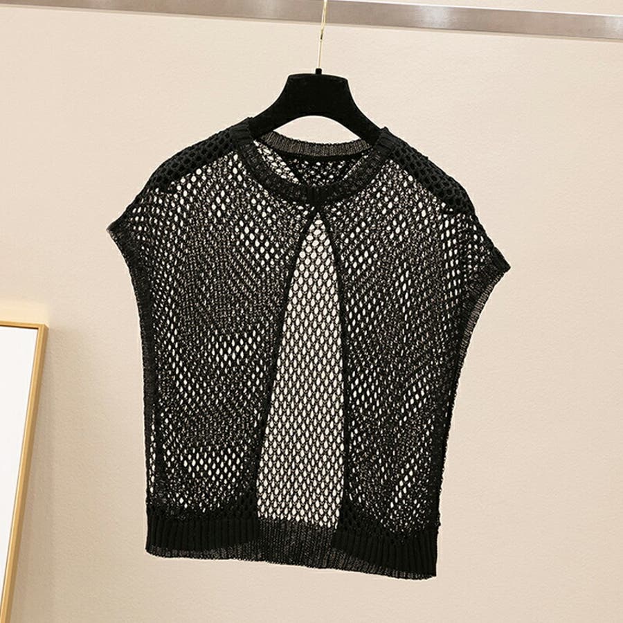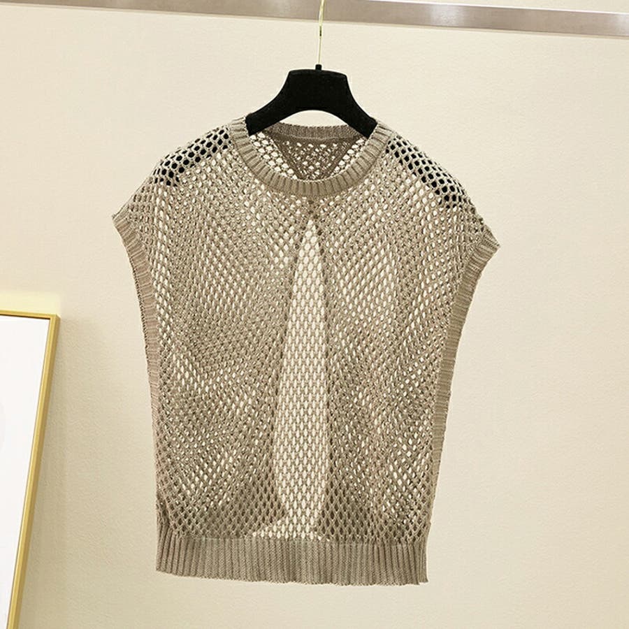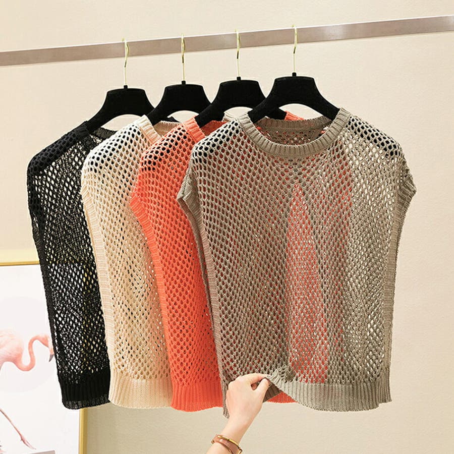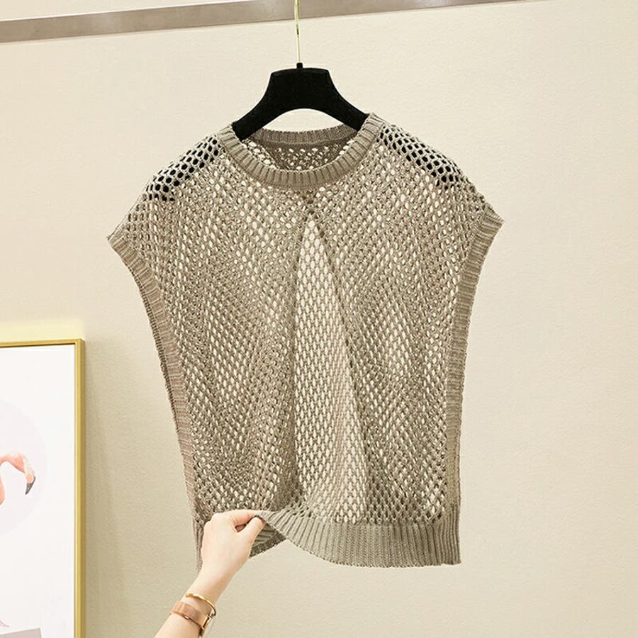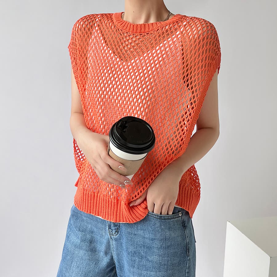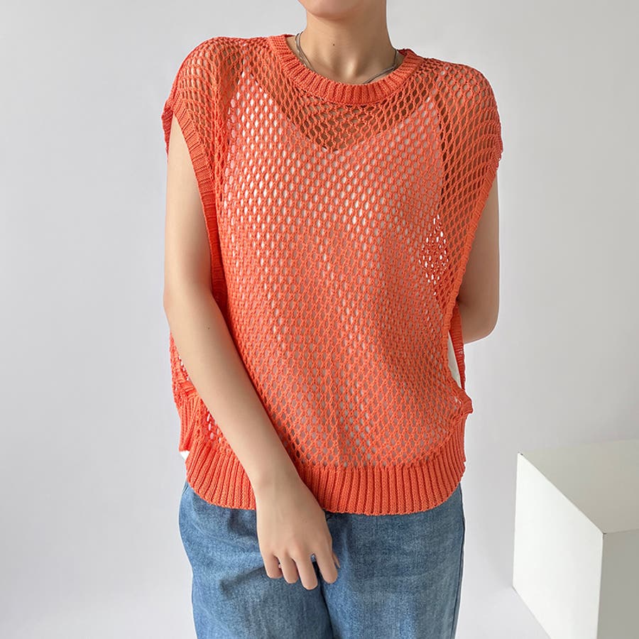 ノースリーブ 透かし編みバックスリットトップス 2wayメッシュニットベスト