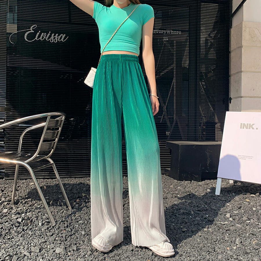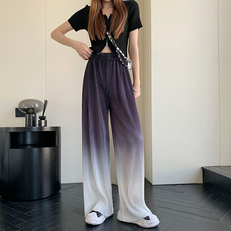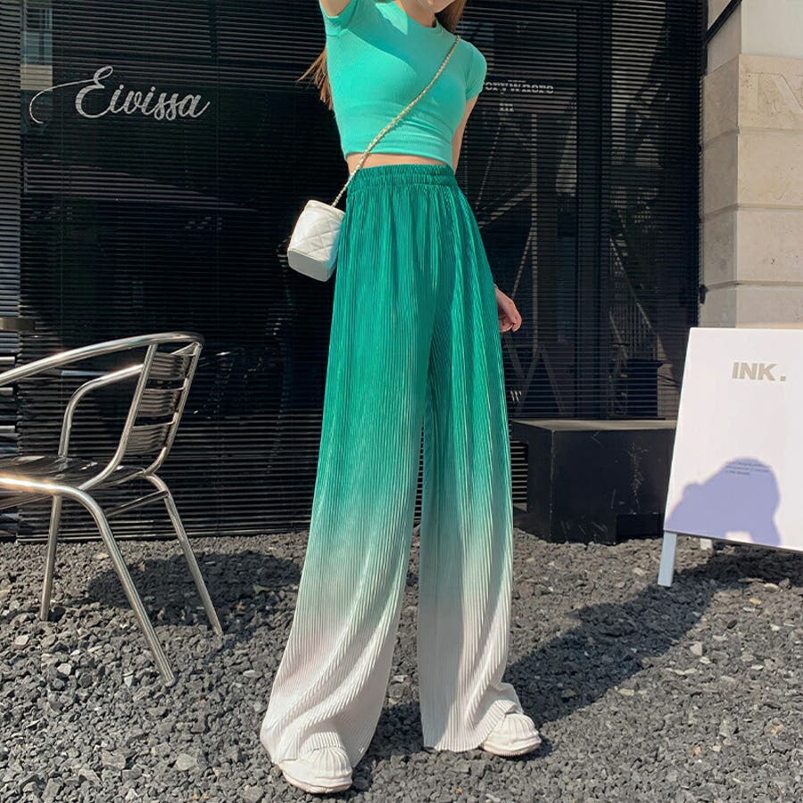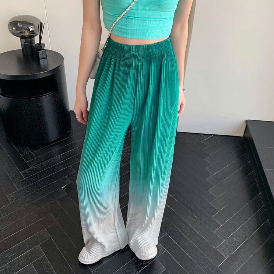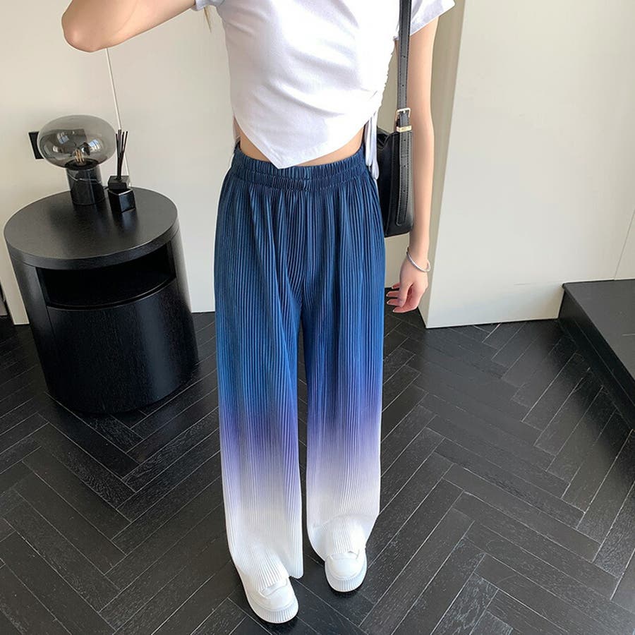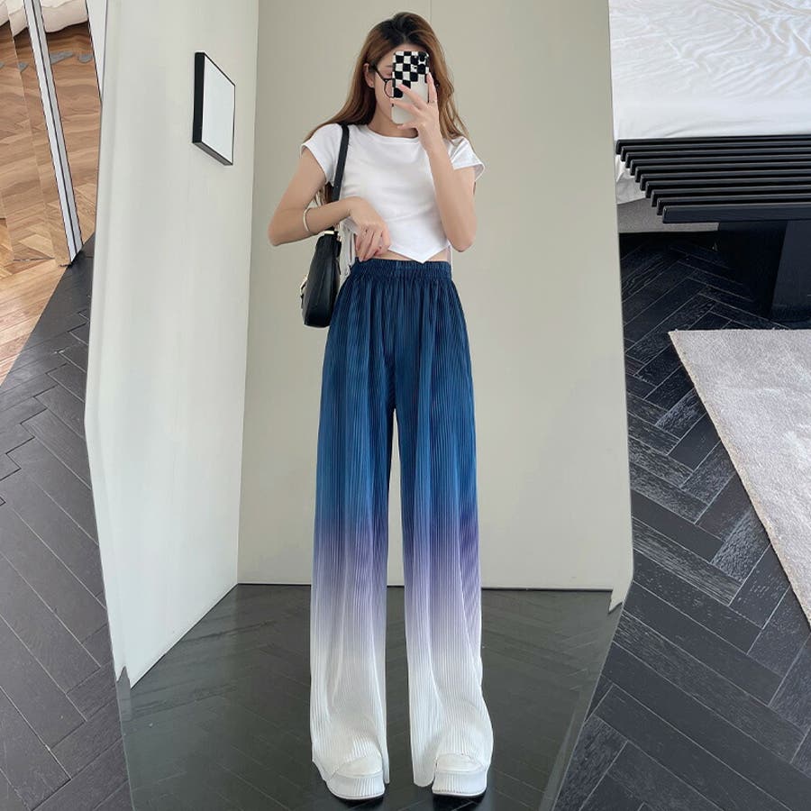 ボトムス ワイドパンツ グラデーションパンツ ストレートパンツ パンツ ズボン レディース ロングパンツ プリーツ ハイウエスト