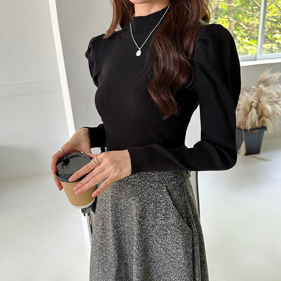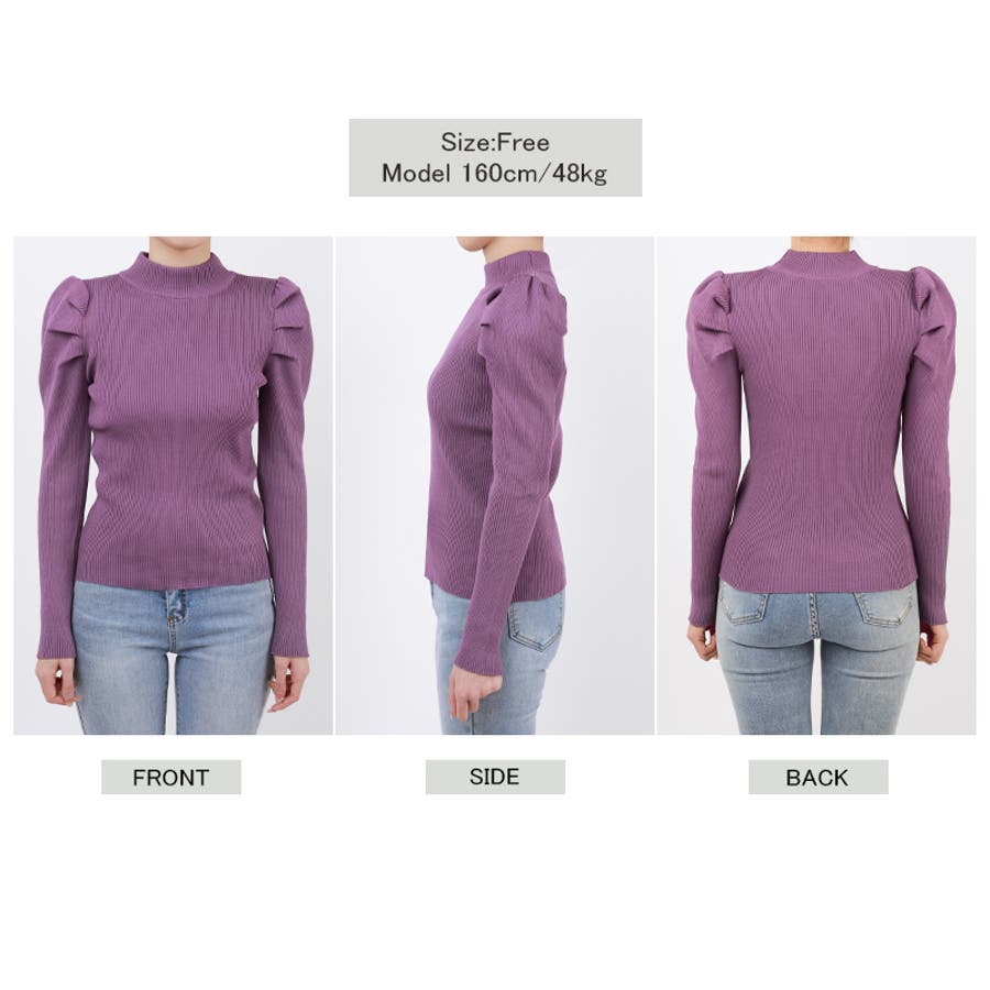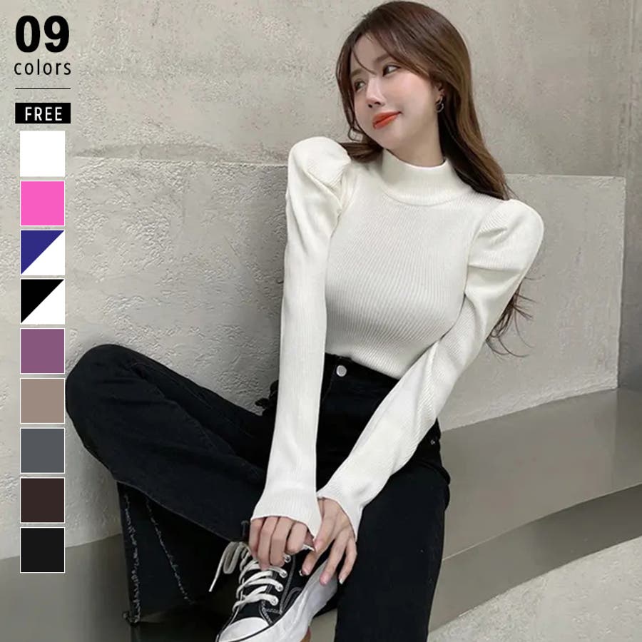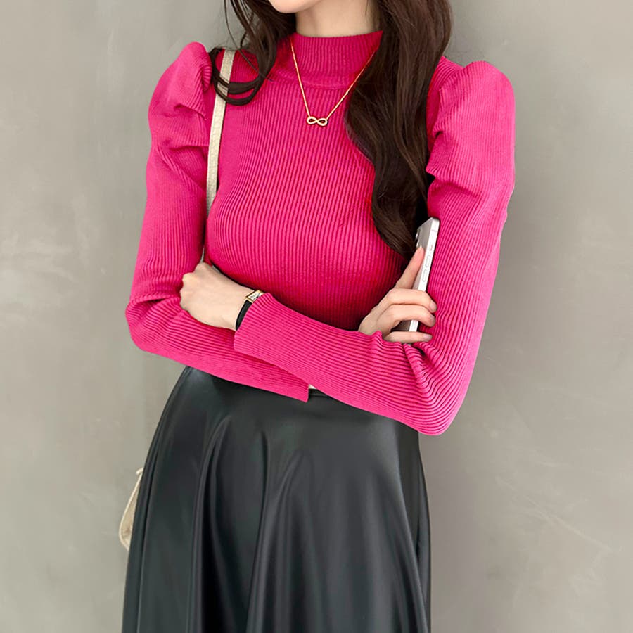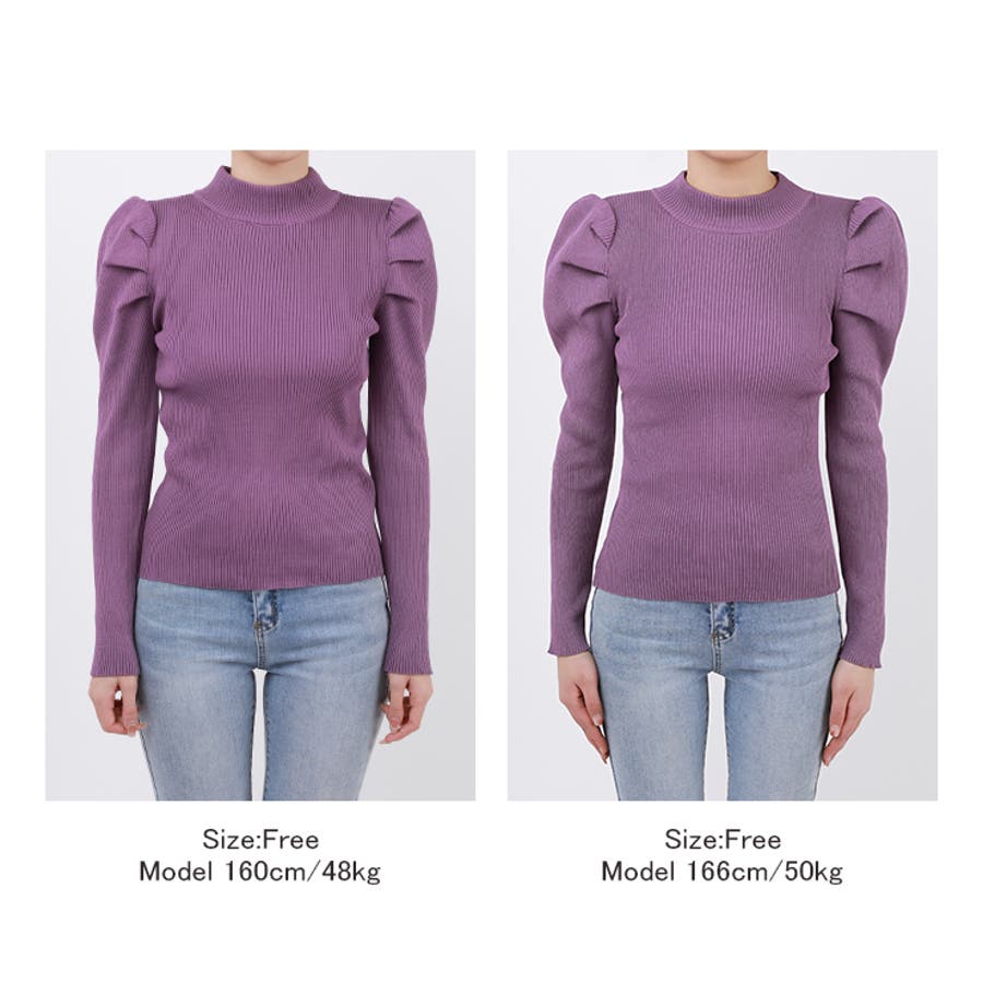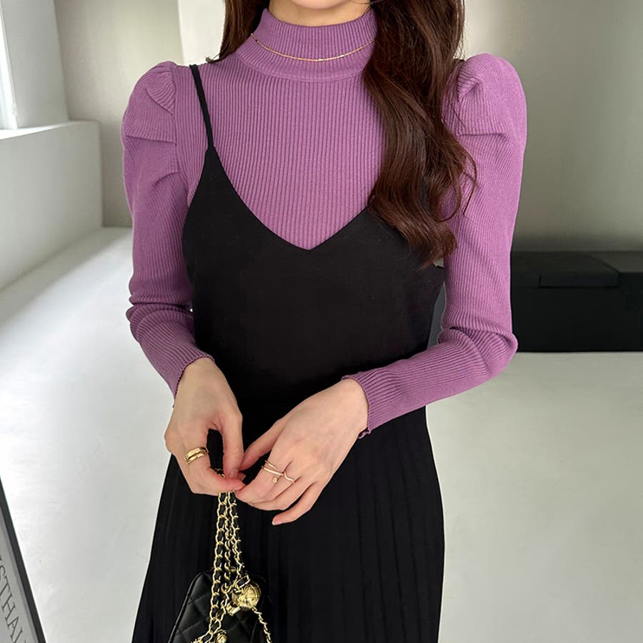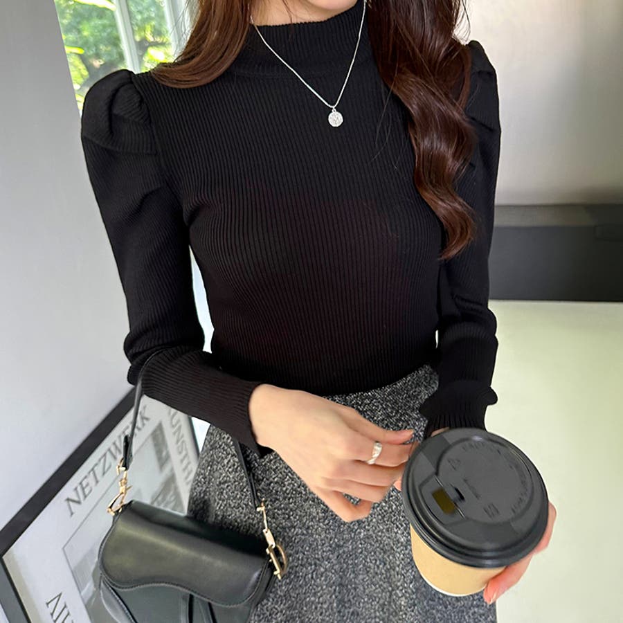 パワショル パフスリーブ ボリュームスリーブ タートルネック ボトルネック セーター 薄手 シンプル リブ 細見え インナー カットソー