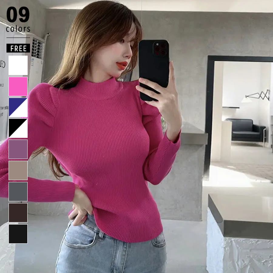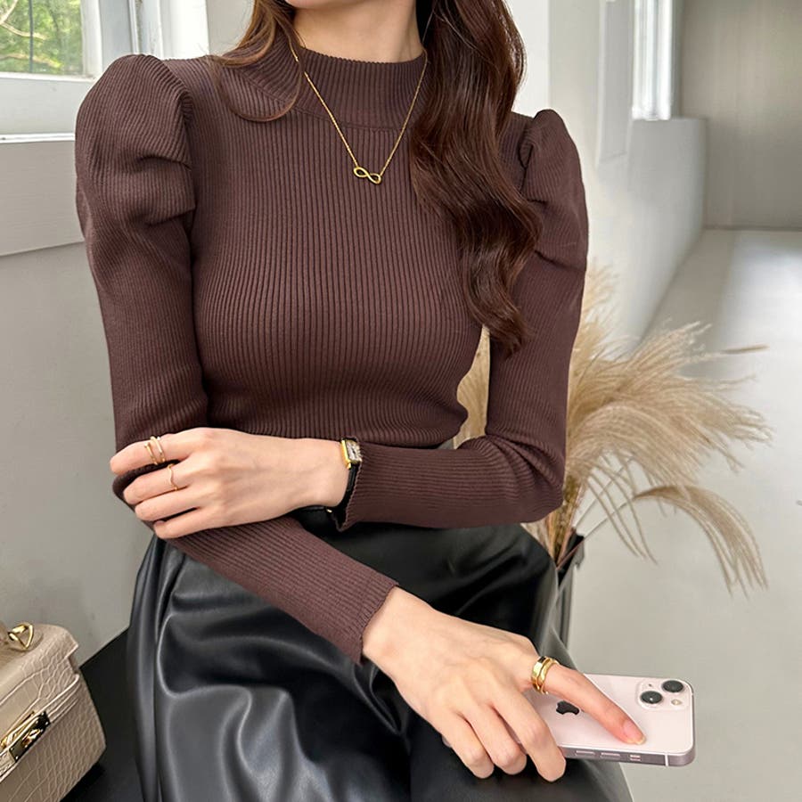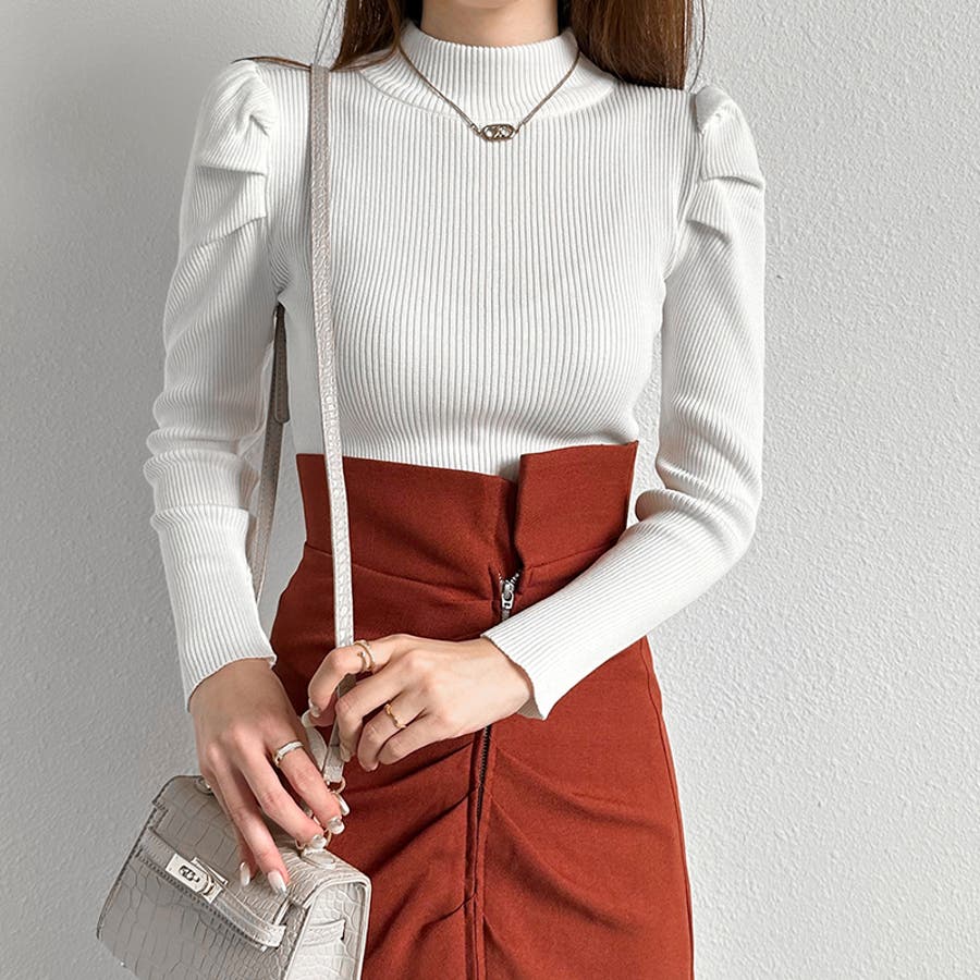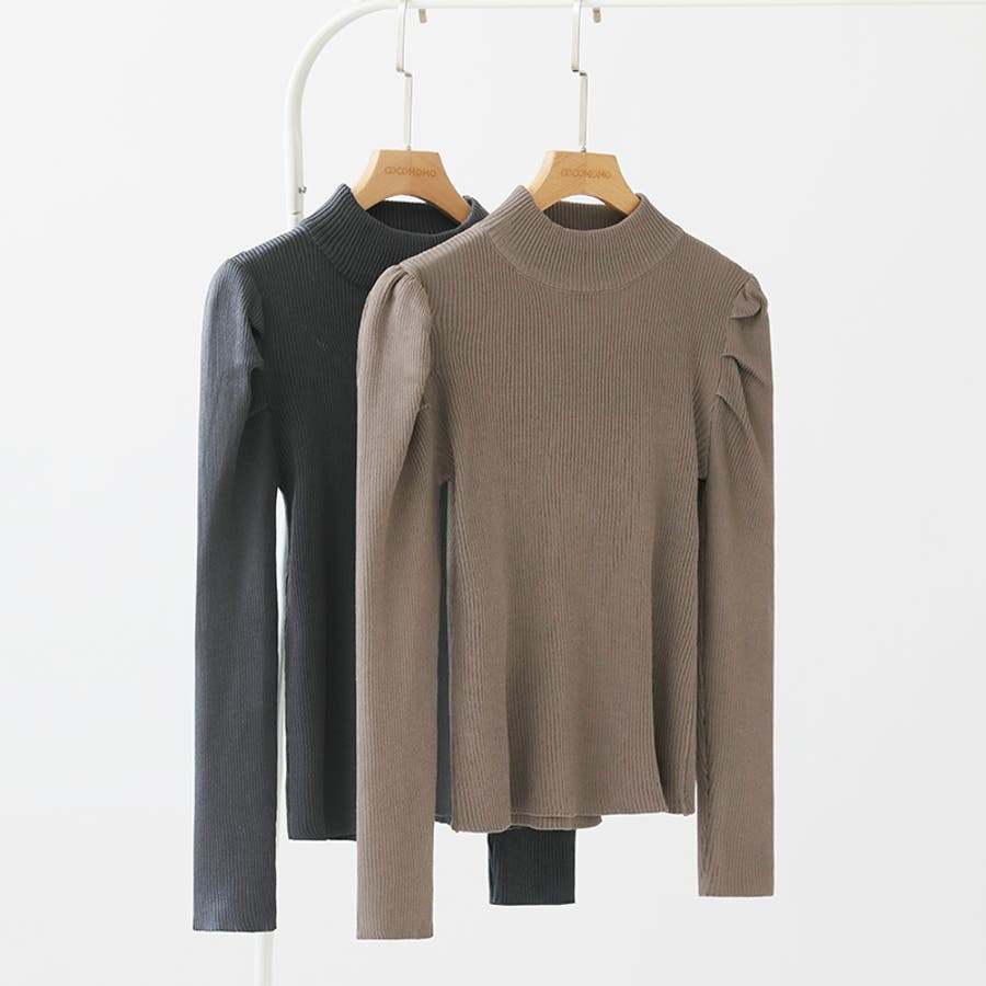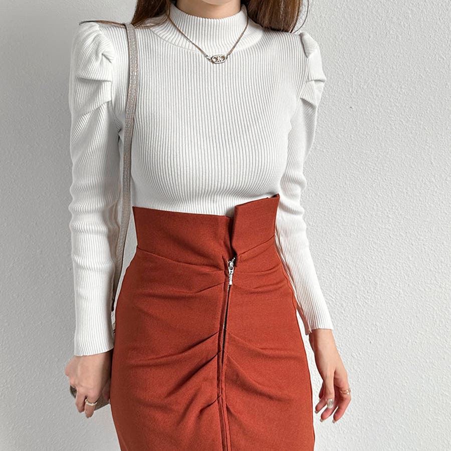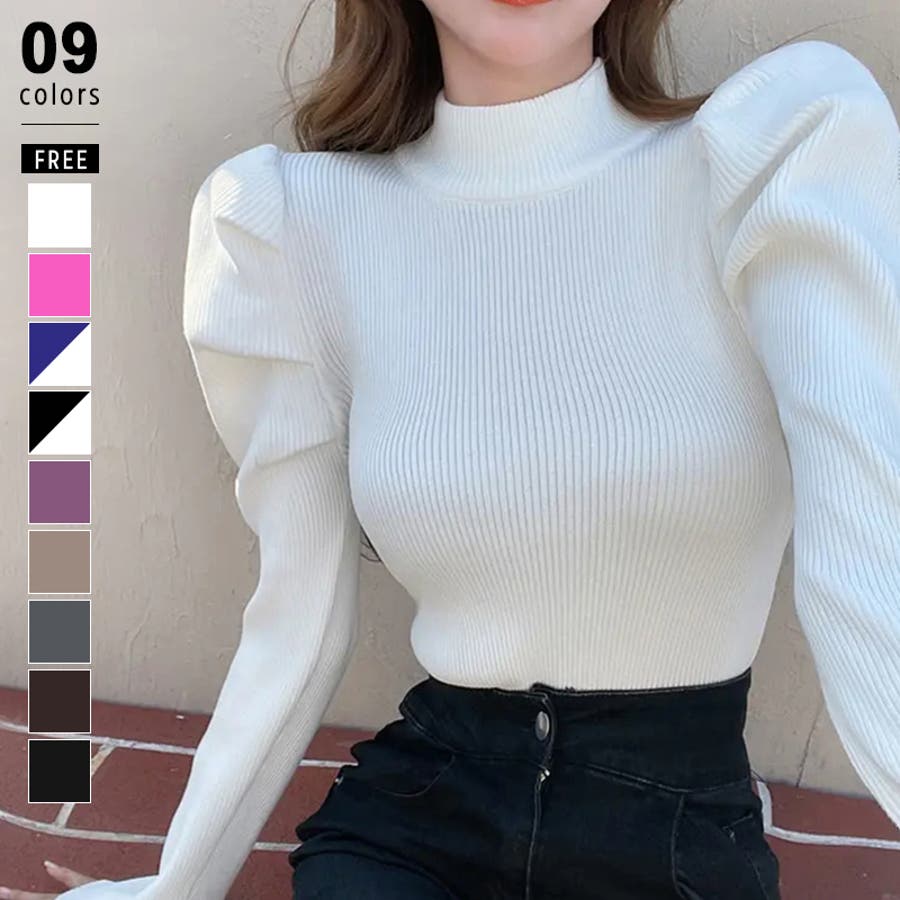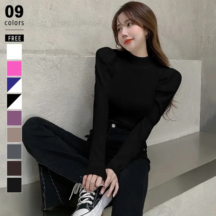 パワショル パフスリーブ ボリュームスリーブ タートルネック ボトルネック セーター 薄手 シンプル リブ 細見え インナー カットソー
