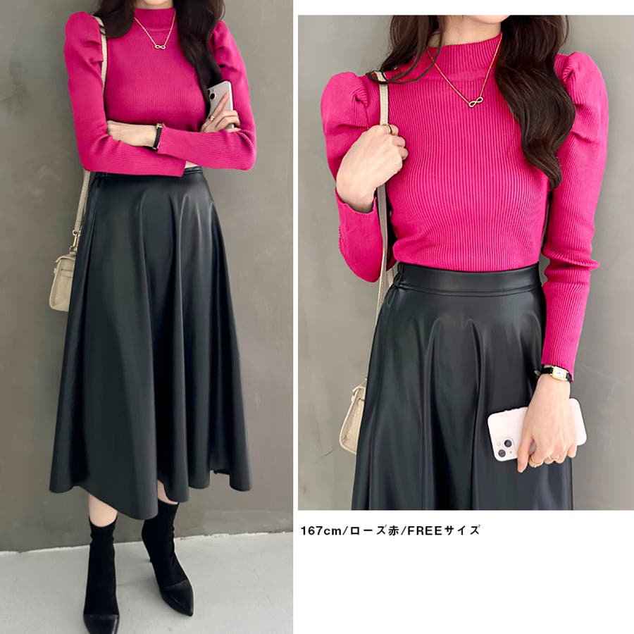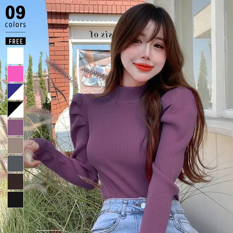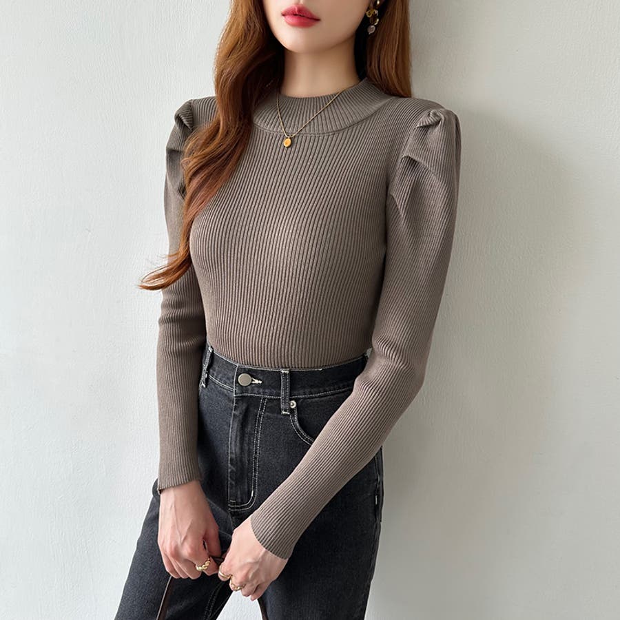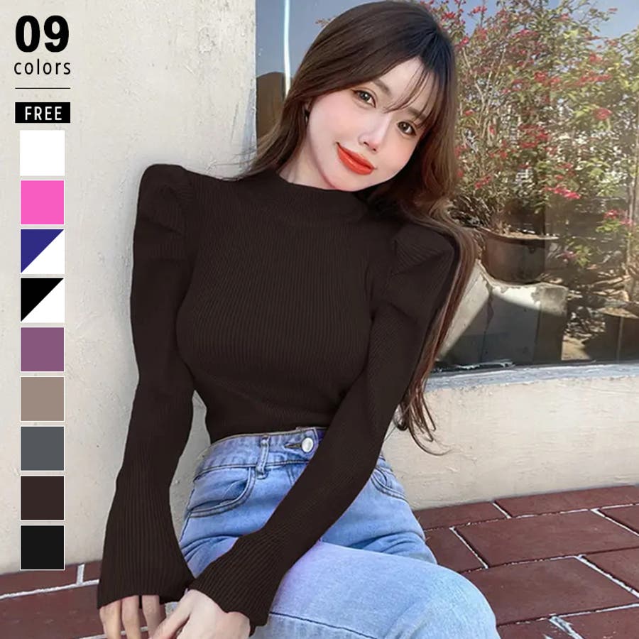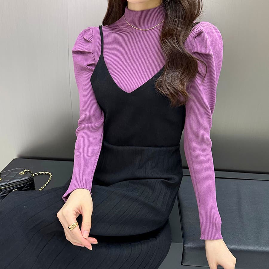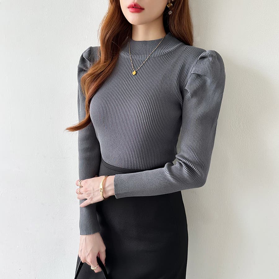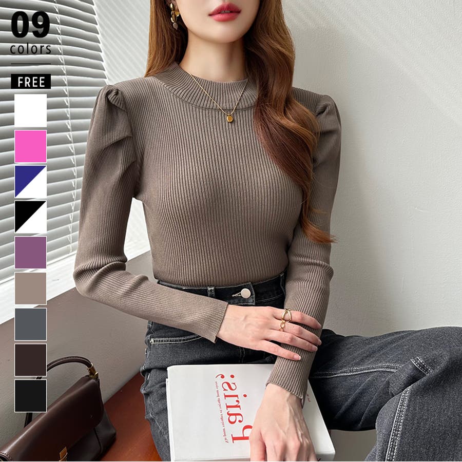 パワショル パフスリーブ ボリュームスリーブ タートルネック ボトルネック セーター 薄手 シンプル リブ 細見え インナー カットソー
