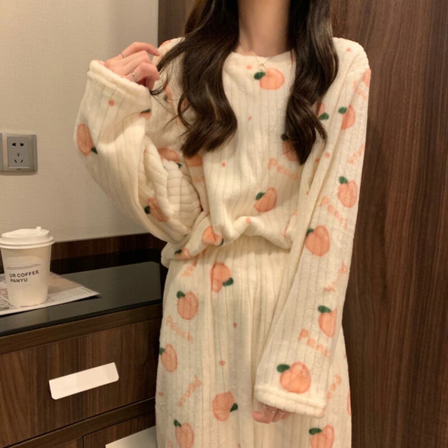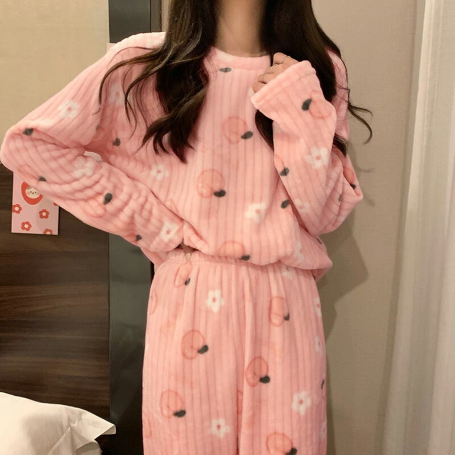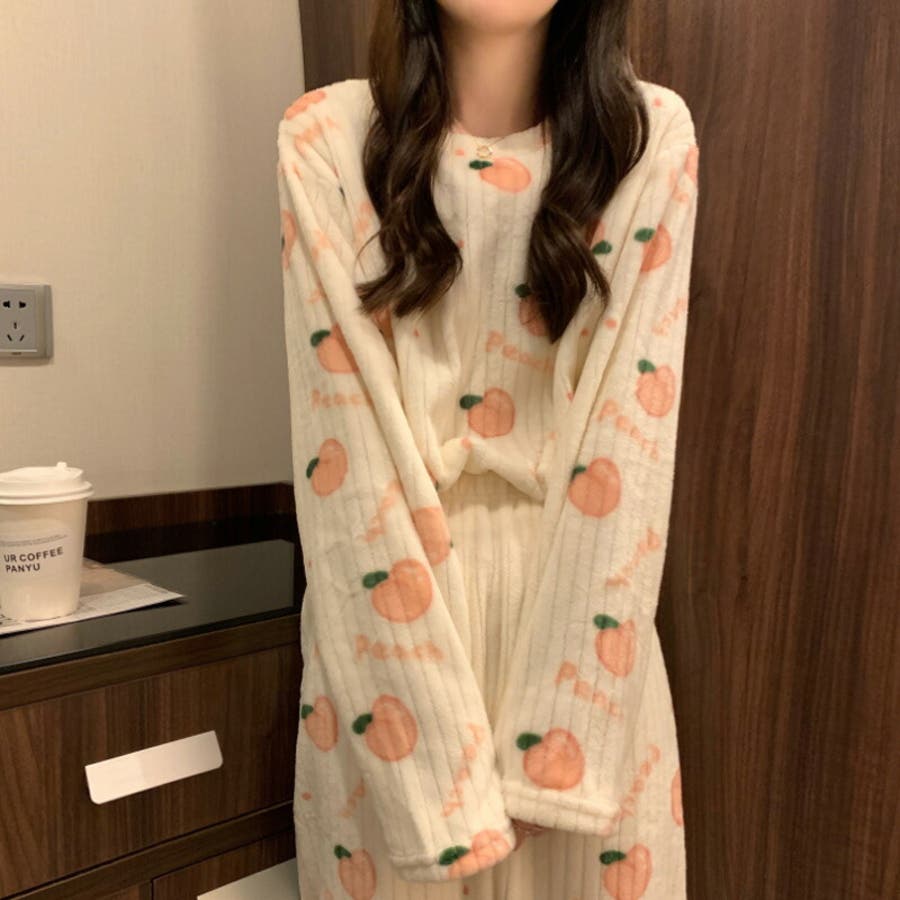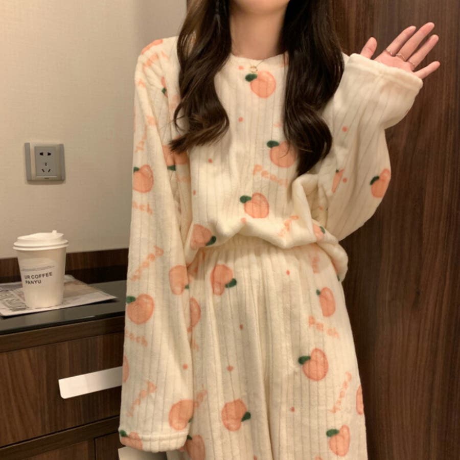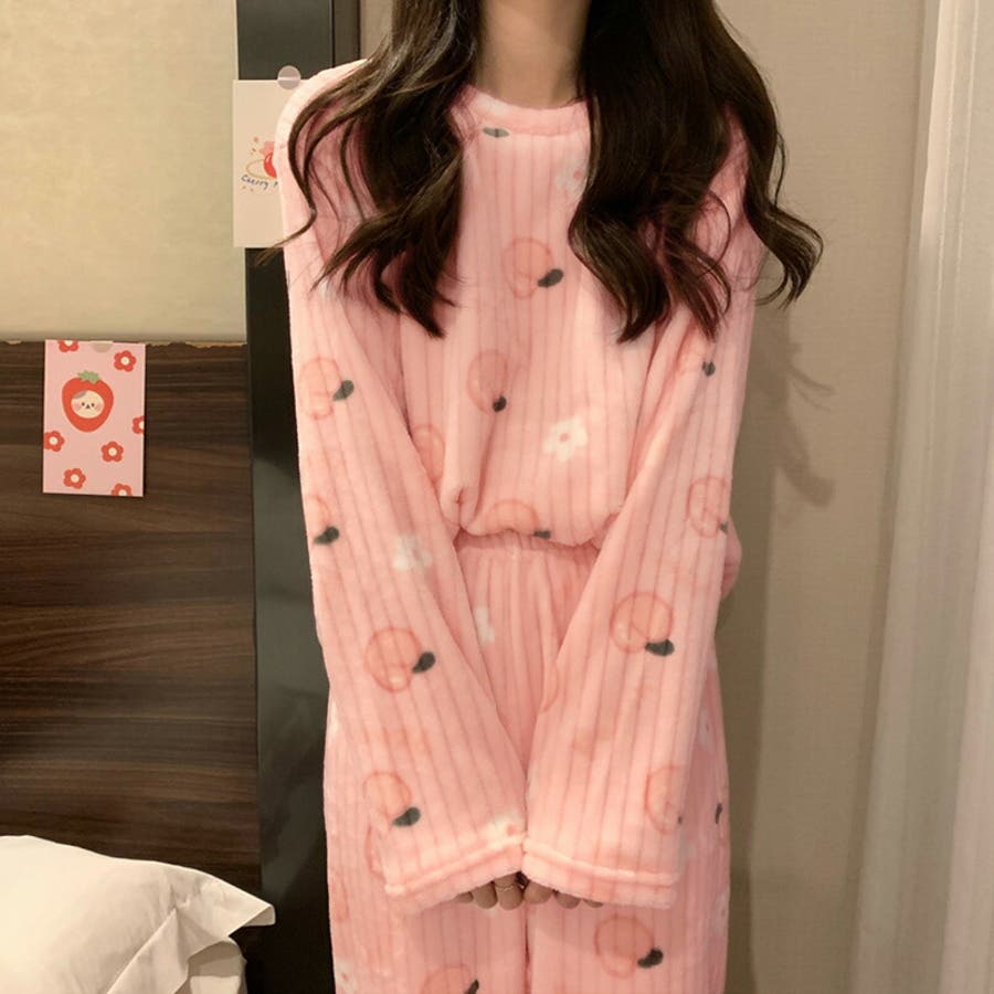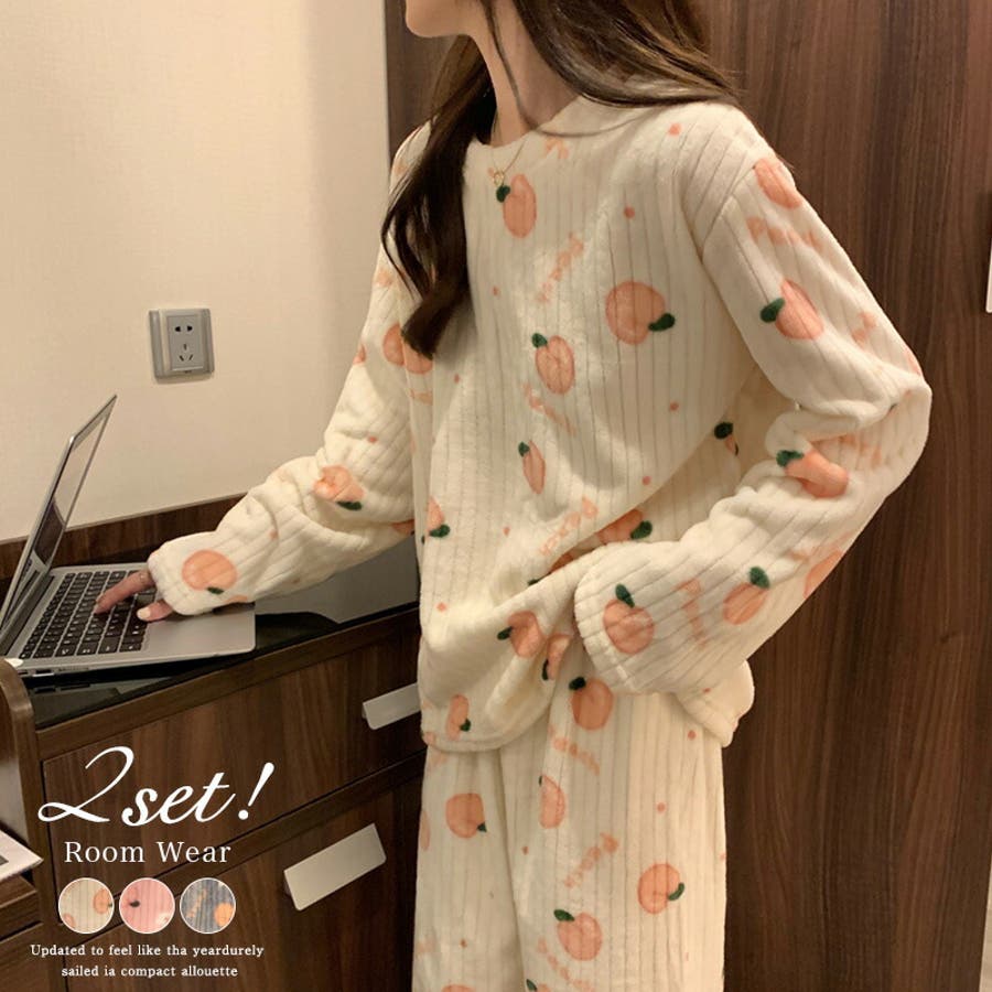 ルームウェア 韓国風ピーチ柄パジャマ 上下セット パジャマ レディース 部屋着 セットアップ 長袖 秋冬 ナイトウェア セット
