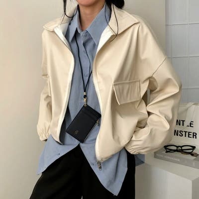 女性らしさを感じるレザー調ジャケット。