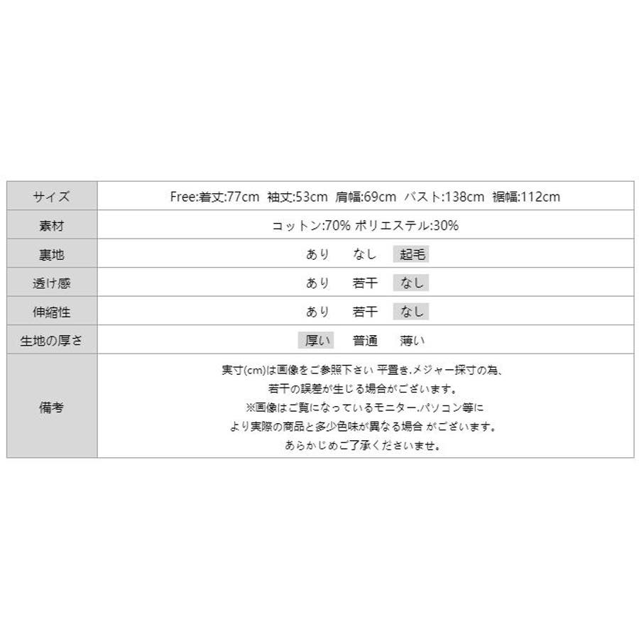 | サイズ | Free: 着丈 77cm 袖丈 53cm 肩幅 69cm バスト 138cm 裾幅 112cm |