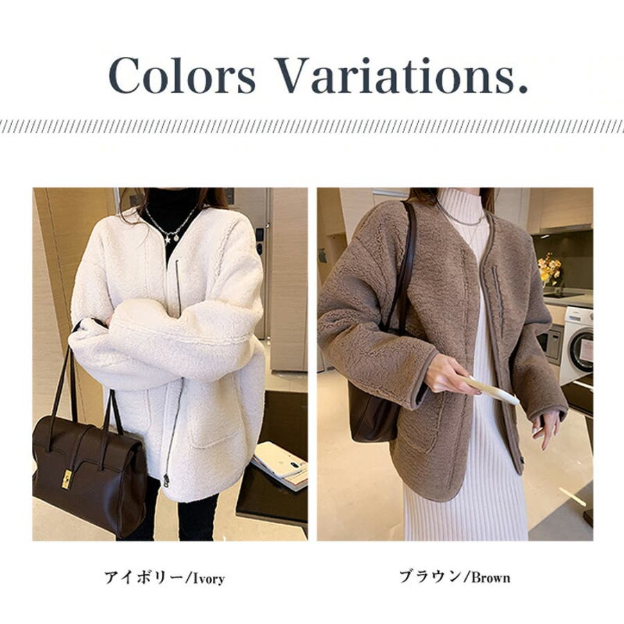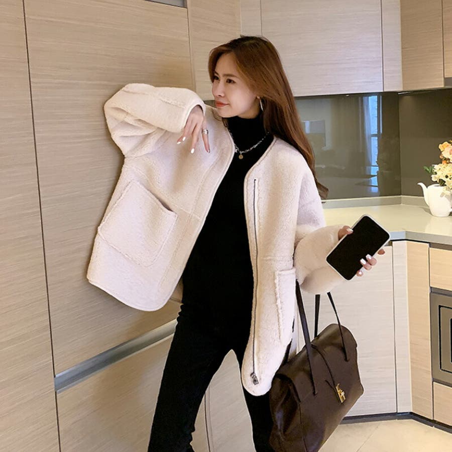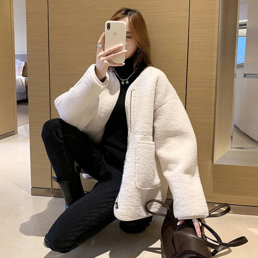 ジップアップ もこもこ ふわふわ ボアジャケット 襟なし ライトアウター 暖かい あったか 長袖 秋冬 羽織り 上着 ミドル丈