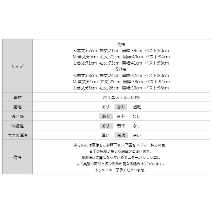 | サイズ | 長袖 S: 着丈 67cm 袖丈 71cm 肩幅 39cm バスト 90cm M: 着丈 69cm 袖丈 72cm 肩幅 40cm バスト 94cm L: 着丈 71cm 袖丈 73cm 肩幅 41cm バスト 98cm 5分袖 S: 着丈 63cm 袖丈 24cm 肩幅 37cm バスト 90cm M: 着丈 64cm 袖丈 25cm 肩幅 38cm バスト 94cm L: 着丈 65cm 袖丈 26cm 肩幅 39cm バスト 98cm |