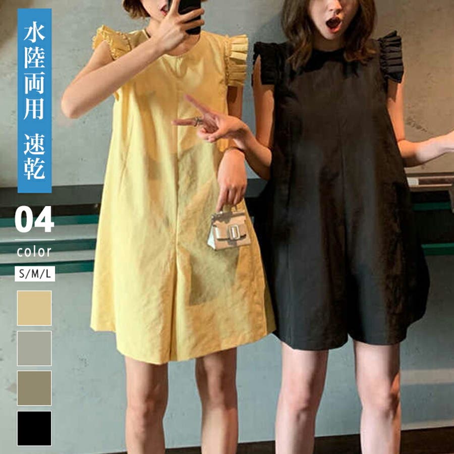 ラッシュガード オールインワン 水陸両用 レディース ノースリーブ 水着 フリル 肩 フリルショルダー ゆったり 大きい 大きいサイズ 体型カバー 二の腕カバー ポケット付き ショート丈 ショートパンツ ボトムス キュロット 無地 シンプル フードなし ジップアップ ファスナー リゾート 海 川 プール ジャンプスーツ つなぎ 細見え 着痩せ 丸襟 クルーネック ノーカラー キレイめ きれいめ 大人 かわいい 大人可愛い おしゃれ プチプラ ママ ママコーデ ママ水着 母 s m l 黒 黄 茶 灰 灰色 春物 夏物 春コーデ 夏コーデ 春夏新作 23年 2023ss 春夏 春 夏 春服 夏服 韓国 韓国ファッション 10代 20代 30代 40代 50代 cocomomo ココモモ