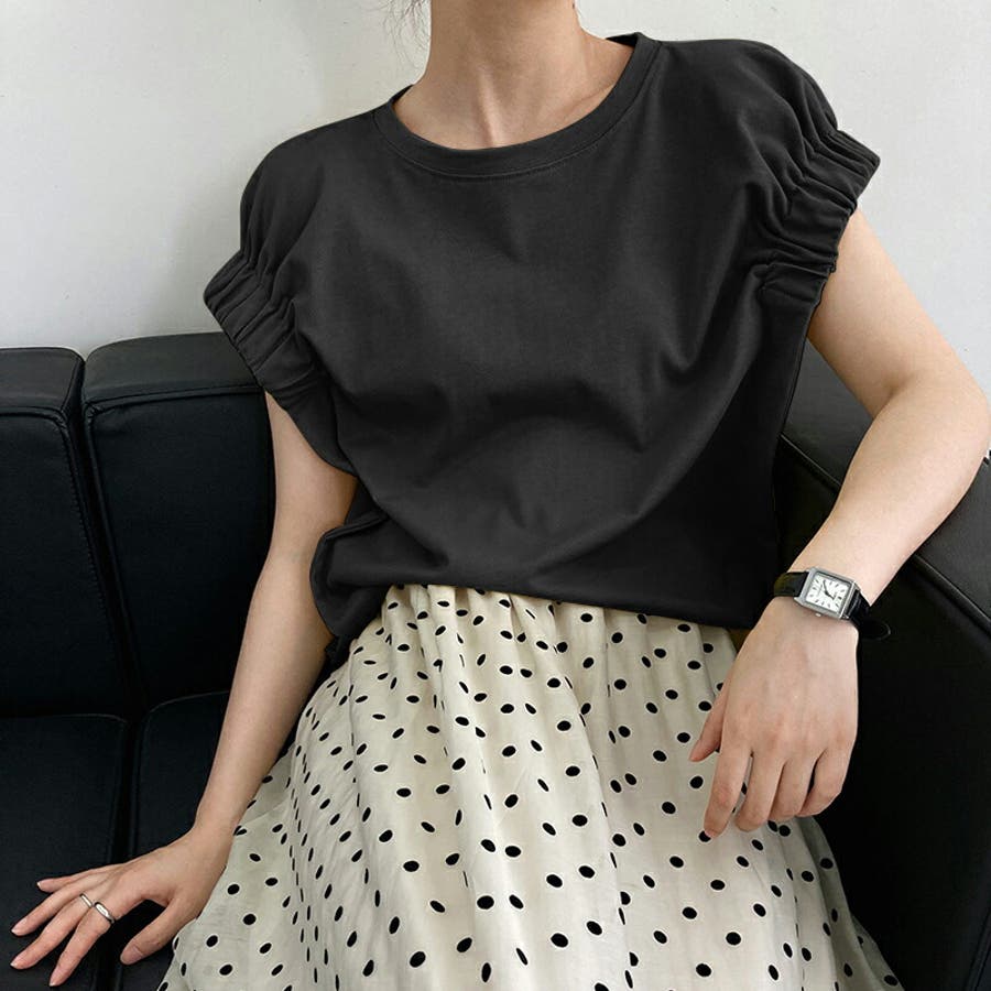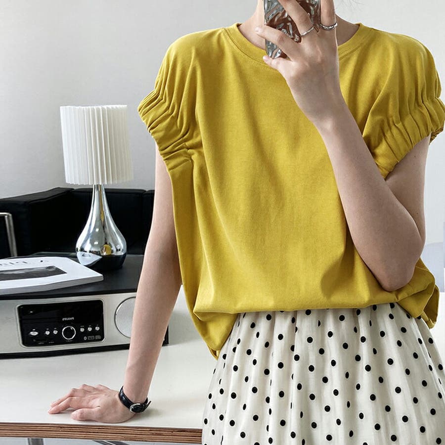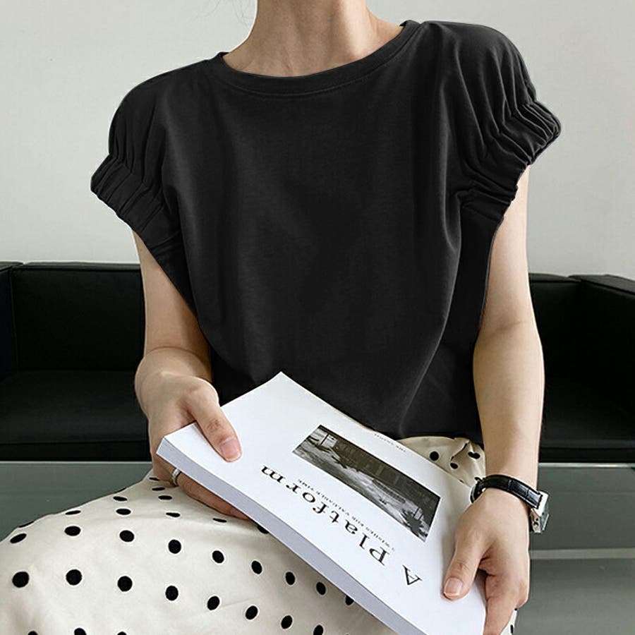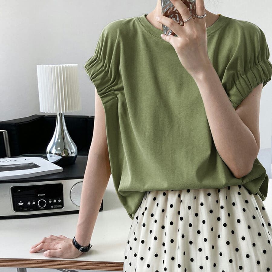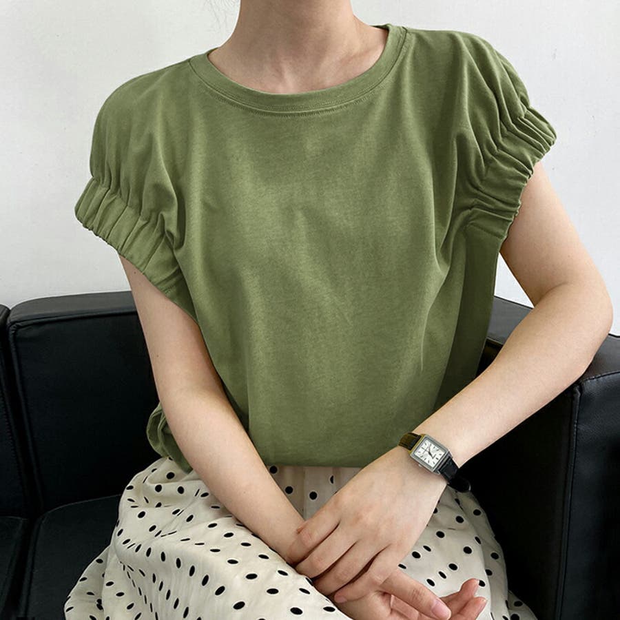 tシャツ コットン100% レディース 半袖 カットソー フレンチスリーブ ギャザー 袖 袖口ゴム ボリューム ゆったり 大きめ 体型カバー 二の腕カバー トップス tops 無地 シンプル クルーネック 丸襟 プルオーバー 細見え 半袖シャツ tシャツ・カットソー tシャツ 綿 綿100 綿100% コットン コットン100 コットン100% cotton100% 肌に優しい 肩 半袖tシャツ 着回し サマー 夏トップス さらさら ナチュラル カジュアル きれいめ 大人 かわいい 大人可愛い 黒 白 黄 緑 m l xl 春夏新作 23年 ワンツーコーデ 春物 夏物 春夏 春 夏 春服 夏服 韓国 韓国ファッション 10代 20代 30代 40代 50代 cocomomo ココモモ