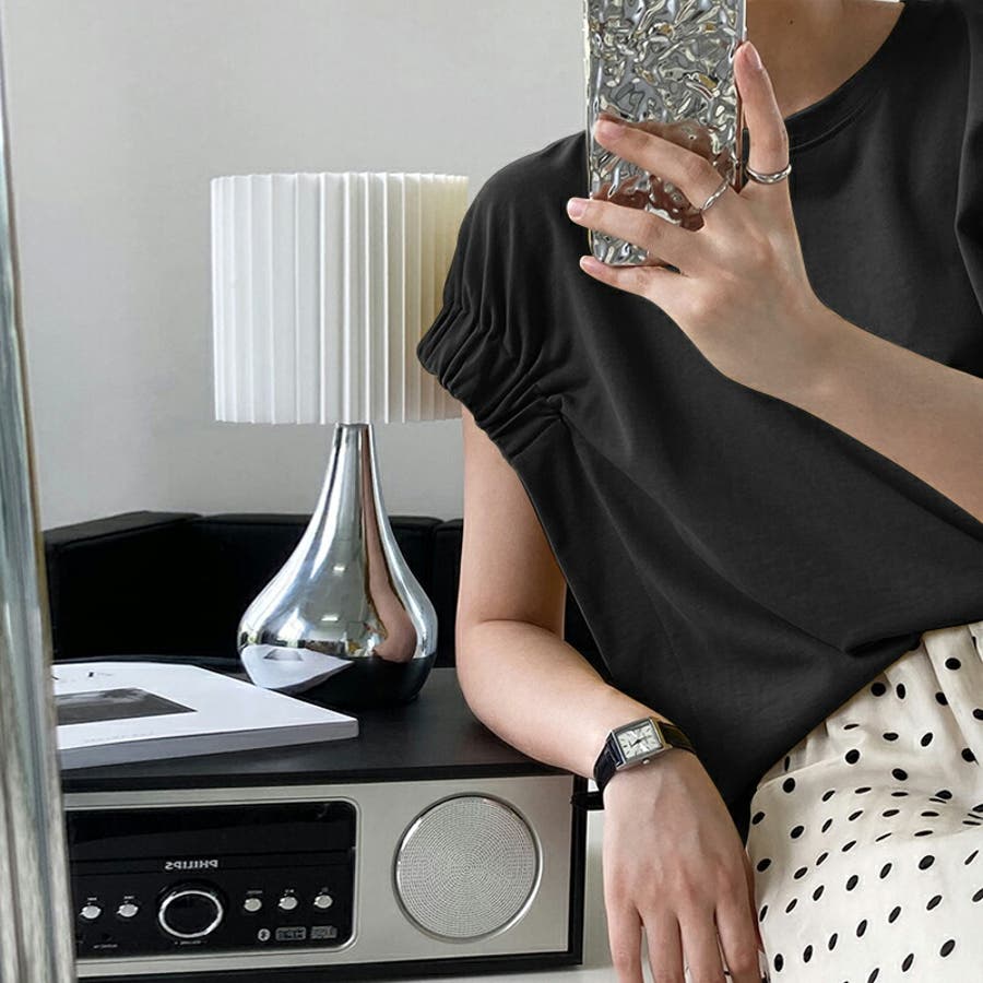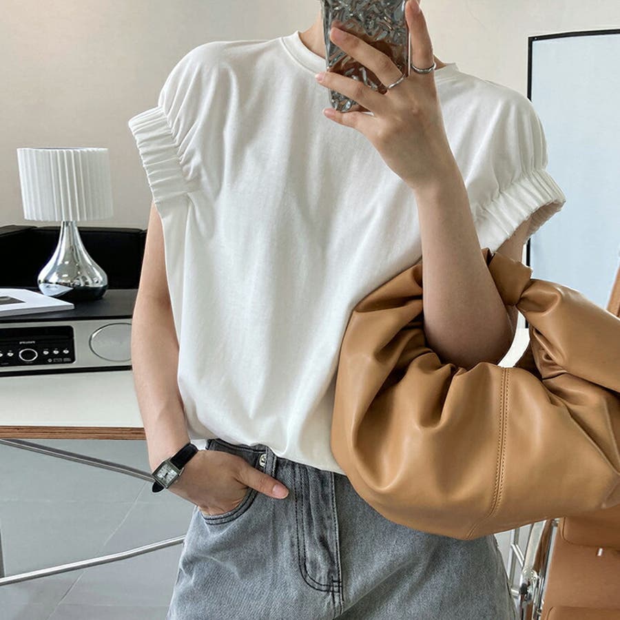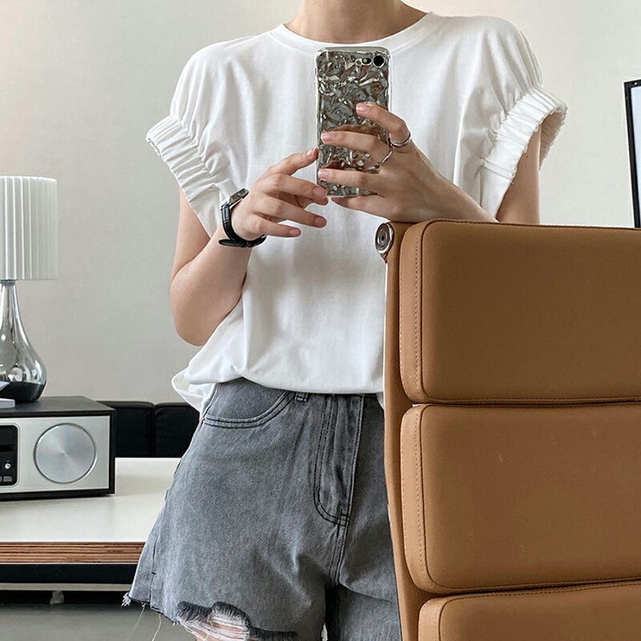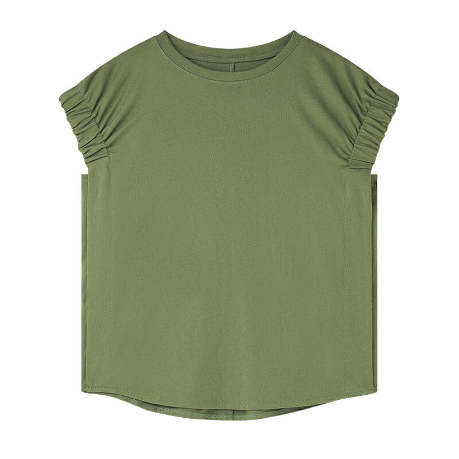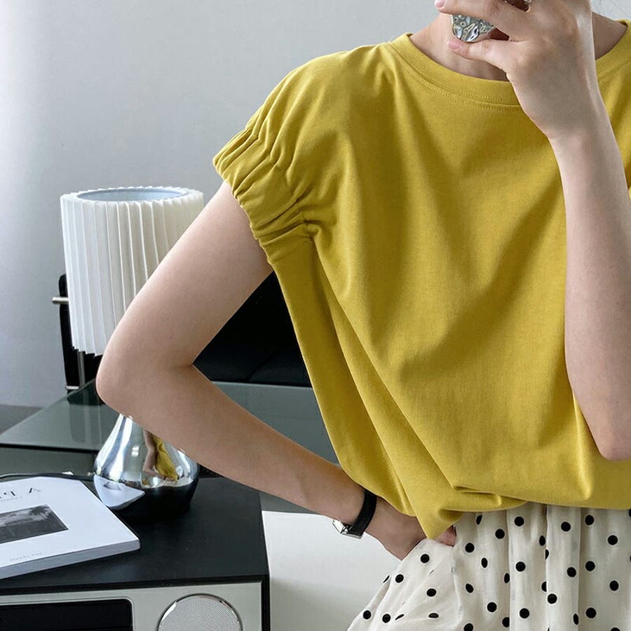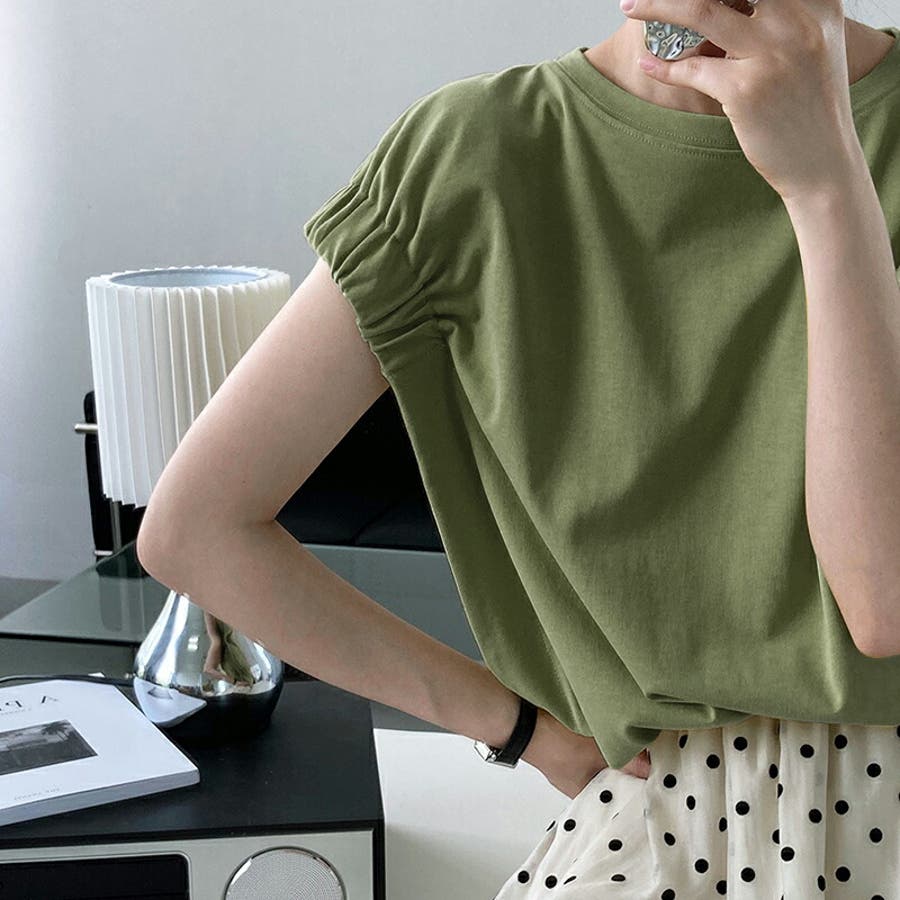 tシャツ コットン100% レディース 半袖 カットソー フレンチスリーブ ギャザー 袖 袖口ゴム ボリューム ゆったり 大きめ 体型カバー 二の腕カバー トップス tops 無地 シンプル クルーネック 丸襟 プルオーバー 細見え 半袖シャツ tシャツ・カットソー tシャツ 綿 綿100 綿100% コットン コットン100 コットン100% cotton100% 肌に優しい 肩 半袖tシャツ 着回し サマー 夏トップス さらさら ナチュラル カジュアル きれいめ 大人 かわいい 大人可愛い 黒 白 黄 緑 m l xl 春夏新作 23年 ワンツーコーデ 春物 夏物 春夏 春 夏 春服 夏服 韓国 韓国ファッション 10代 20代 30代 40代 50代 cocomomo ココモモ