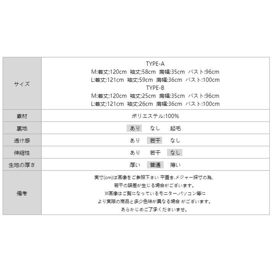 | サイズ | TYPE-A [M] 着丈 120cm 袖丈 58cm 肩幅 35cm バスト 96cm [L] 着丈 121cm 袖丈 59cm 肩幅 36cm バスト 100cm TYPE-B [M] 着丈 120cm 袖丈 25cm 肩幅 35cm バスト 96cm [L] 着丈 121cm 袖丈 26cm 肩幅 36cm バスト 100cm |