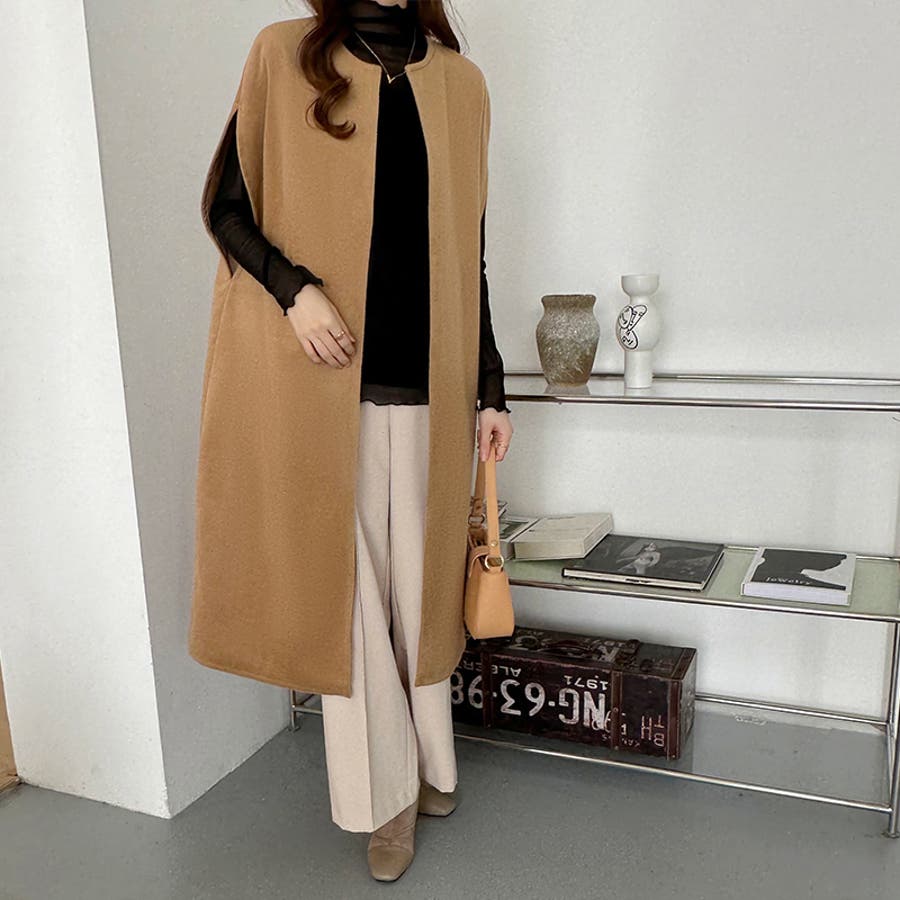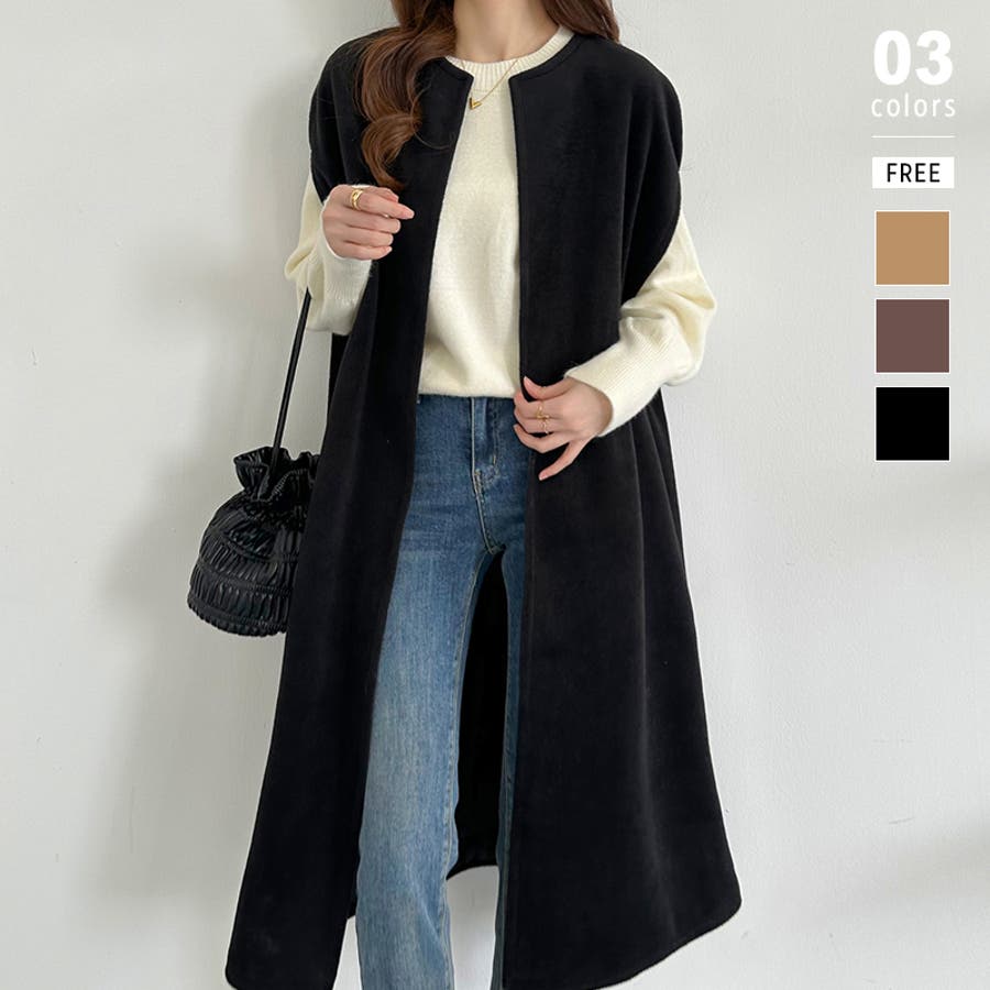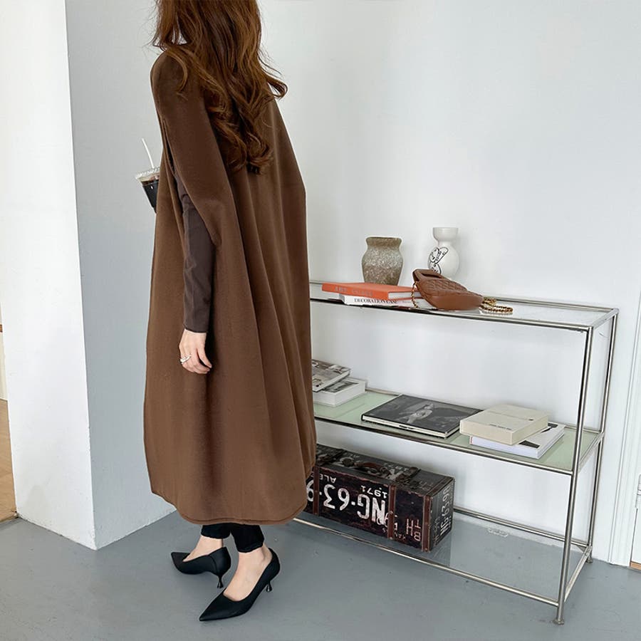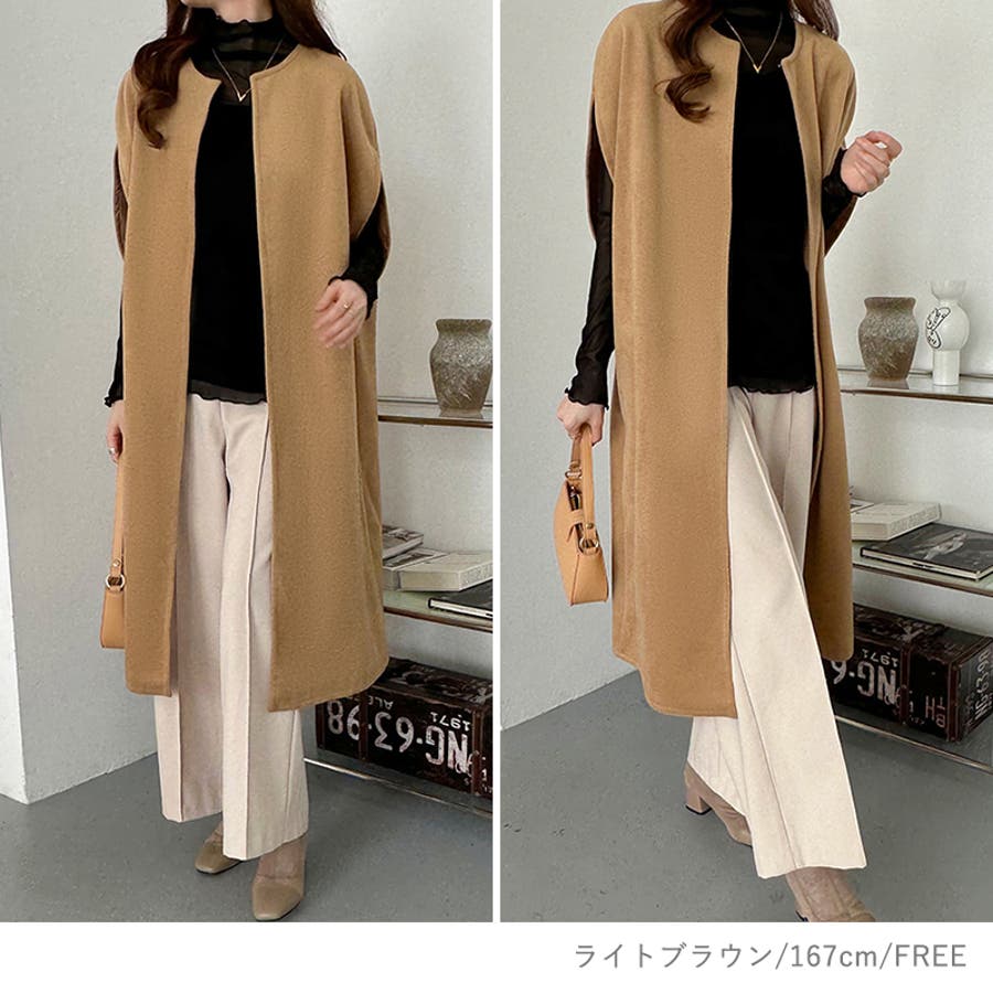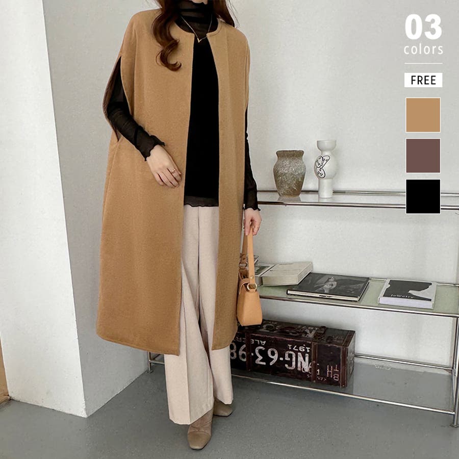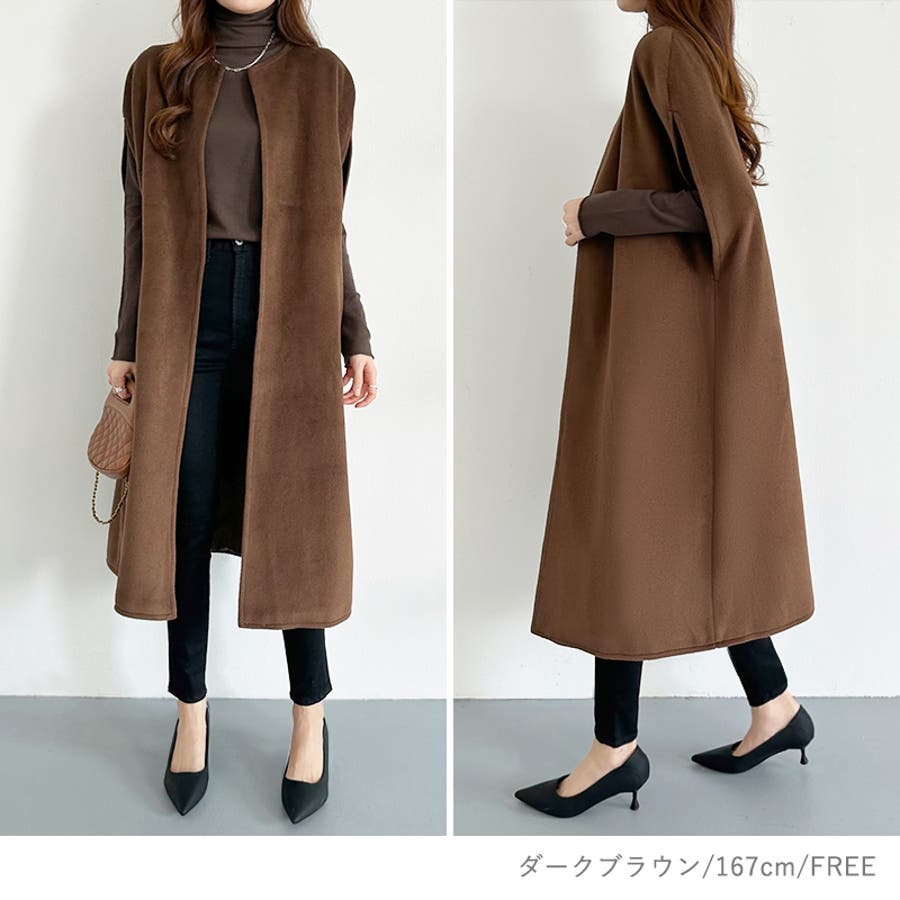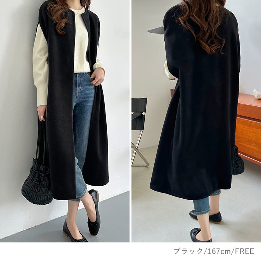 コート レディース ジレ ベスト ロングコート ロング ロング丈 ロングジレ ロングベスト ジレベスト ジャケット アウター ノーカラー ノーカラーコート ノーカラージャケット ノースリーブ 襟なし 袖なし メルトン風 ケープ ポンチョ ゆったり 大きめ 大きいサイズ 体型カバー 羽織 羽織り 羽織もの 上着 あたたかい あったか 暖かい 厚手 厚い 長い コートケープ フォーマル セレモニー シンプル 無地 重ね 重ね着 レイヤード オフィス オフィスカジュアル カジュアル 上品 大人 オトナ かわいい 可愛い 大人可愛い オトナ女子 オシャレ おしゃれ 高見え プチプラ 通勤 通学 母 ママ ママコーデ 女性 フリーサイズ ブラック 黒 ダークブラウン ブラウン 茶色 ライトブラウン ベージュ 新作 2023aw 2023 秋冬新作 秋冬 秋 冬 秋服 冬服 韓国 韓国ファッション 10代 20代 30代 40代 50代 cocomomo ココモモ
