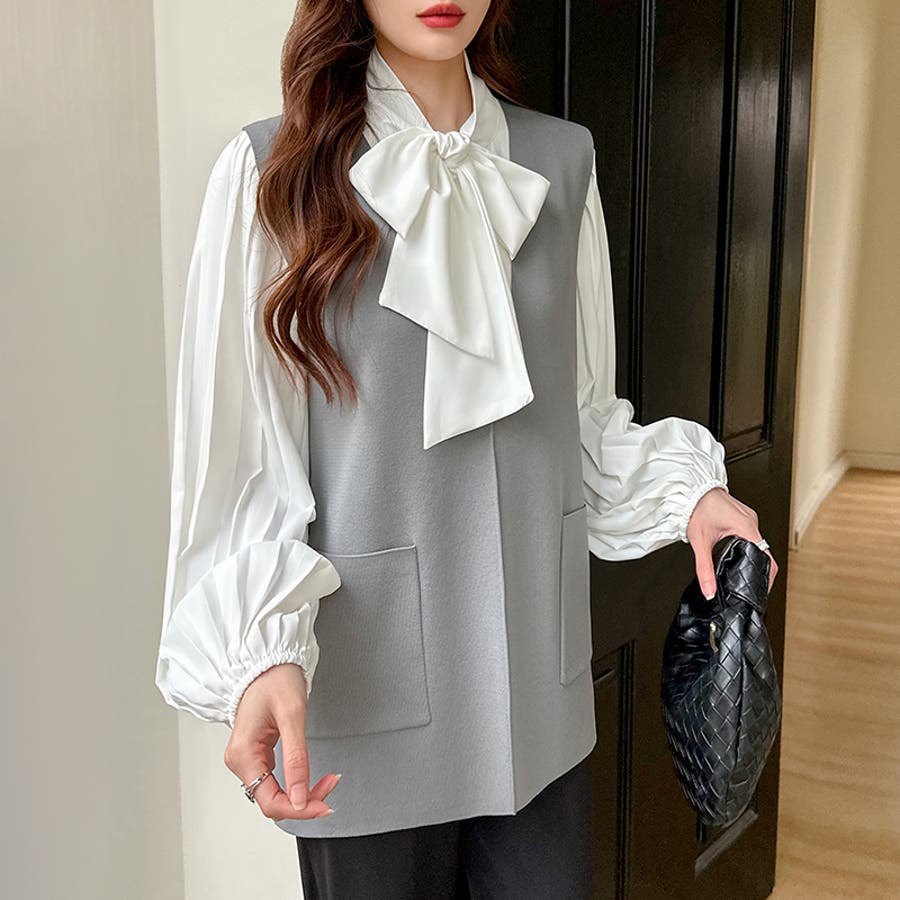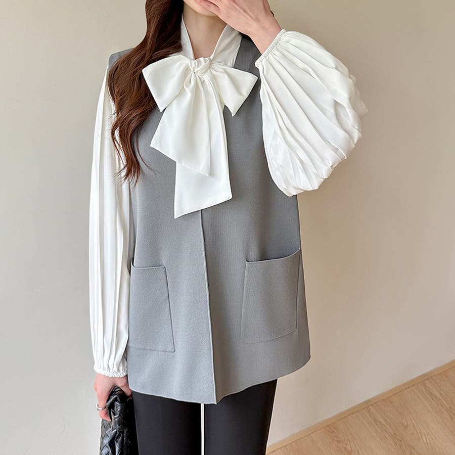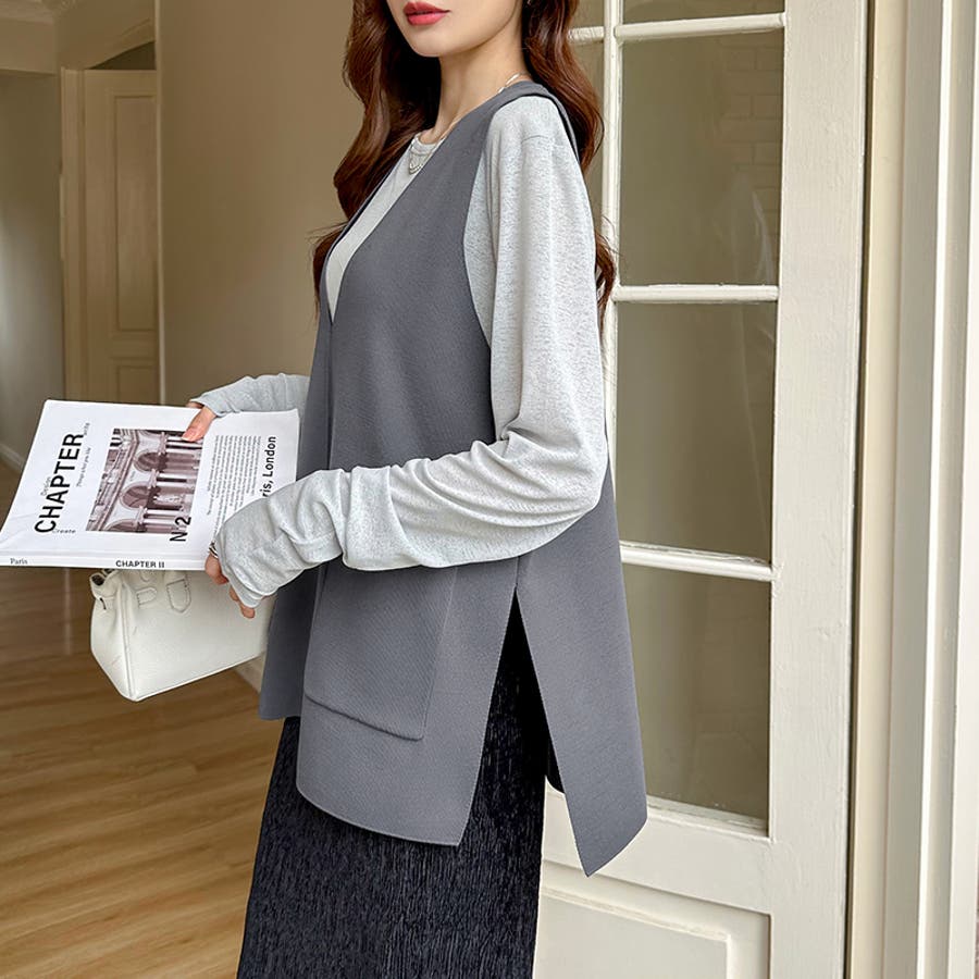 【ライトグレー】サイドスリット入り Vネックベスト ニットベスト