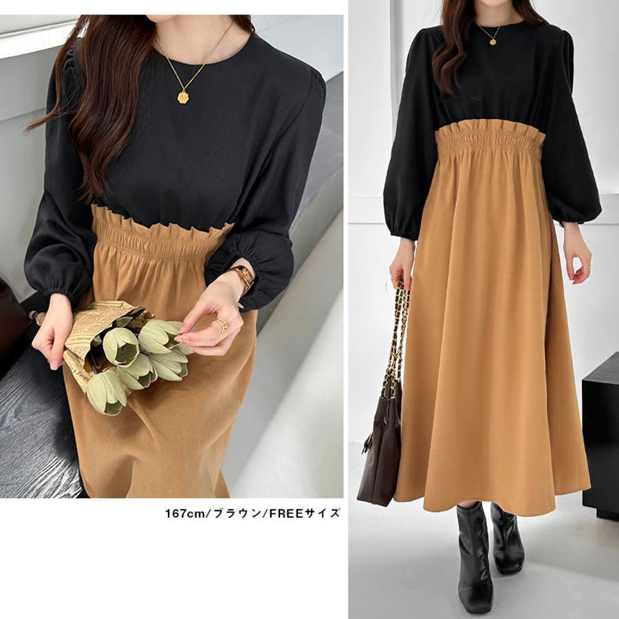 ワンピース ドッキングワンピース レディース 異素材 異素材切り替えワンピース 切り替え ドッキング ロングワンピース ロング ロング丈 長袖 カットソー aライン フレア フレアワンピース シンプル 無地 ウエストゴム ハイウエスト ウエスト絞り らくちん 楽ちん ゆったり お腹カバー 体型カバー ウエストマーク ふんわり スカート ボリューム ボリューム袖 ボリュームスリーブ ボリュームスリーブワンピース ボリュームスリーブプルオーバー プルオーバー 袖口 ゴム 袖あり ぽわん ぽわん袖 ポワン ポワン袖 かぶるだけ 細見え バイカラー 綿 コットン ポリエステル 洗える 1枚で決まる ワンピ 配色 お出かけ おでかけ 旅行 プチプラ 高見え ナチュラル カジュアル きれい きれいめ キレイめ 大人 かわいい 可愛い 大人可愛い オトナ女子 おしゃれ オシャレ 女性 女子 ママ ママコーデ 母 フリーサイズ ブラウン 茶色 ブラック 黒 ネイビー 紺 グレー 灰色 新作 2023 2023aw 秋冬 春 秋 冬 春服 秋服 冬服 韓国 韓国ファッション 10代 20代 30代 40代 50代 10 20 30 40 50 60 代 cocomomo ココモモ