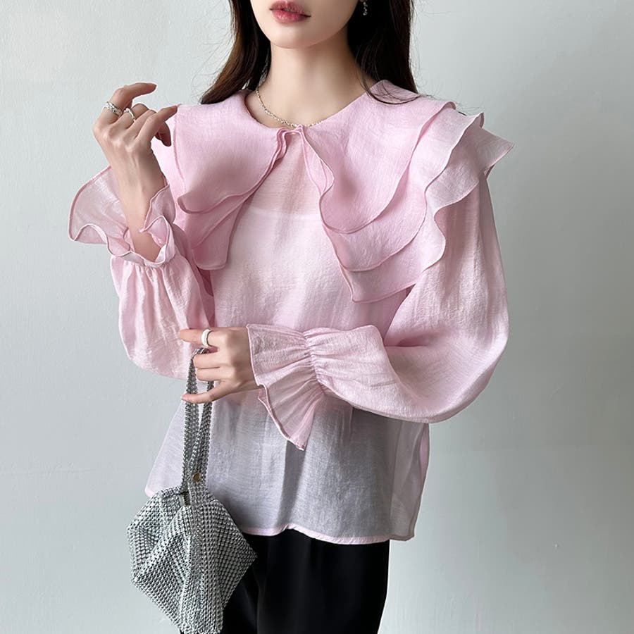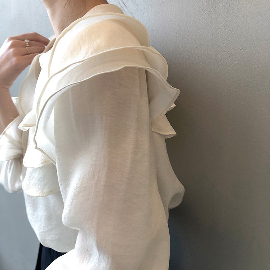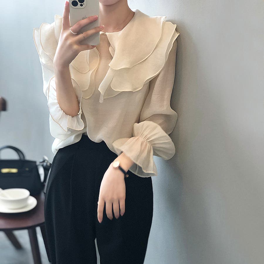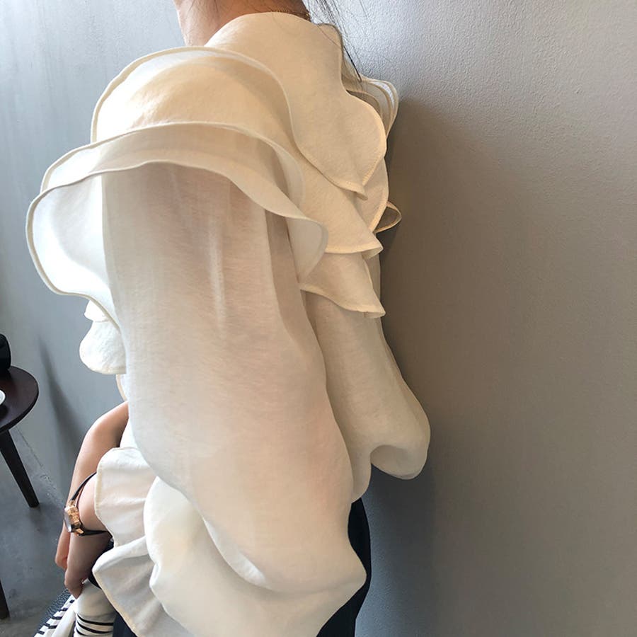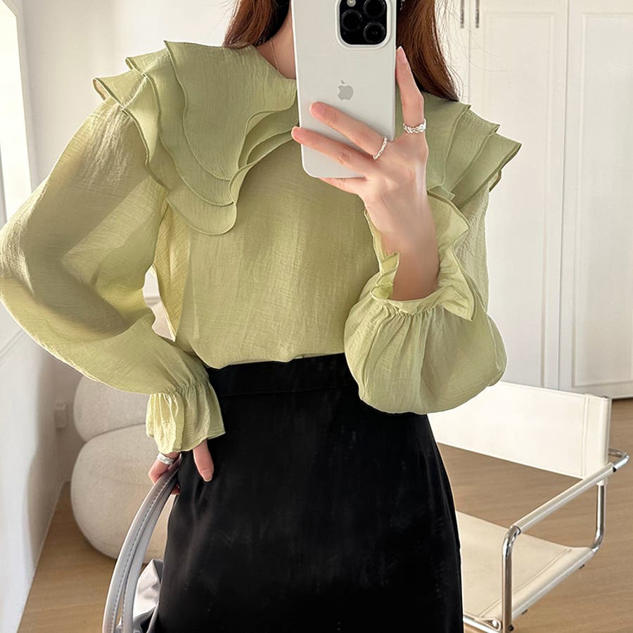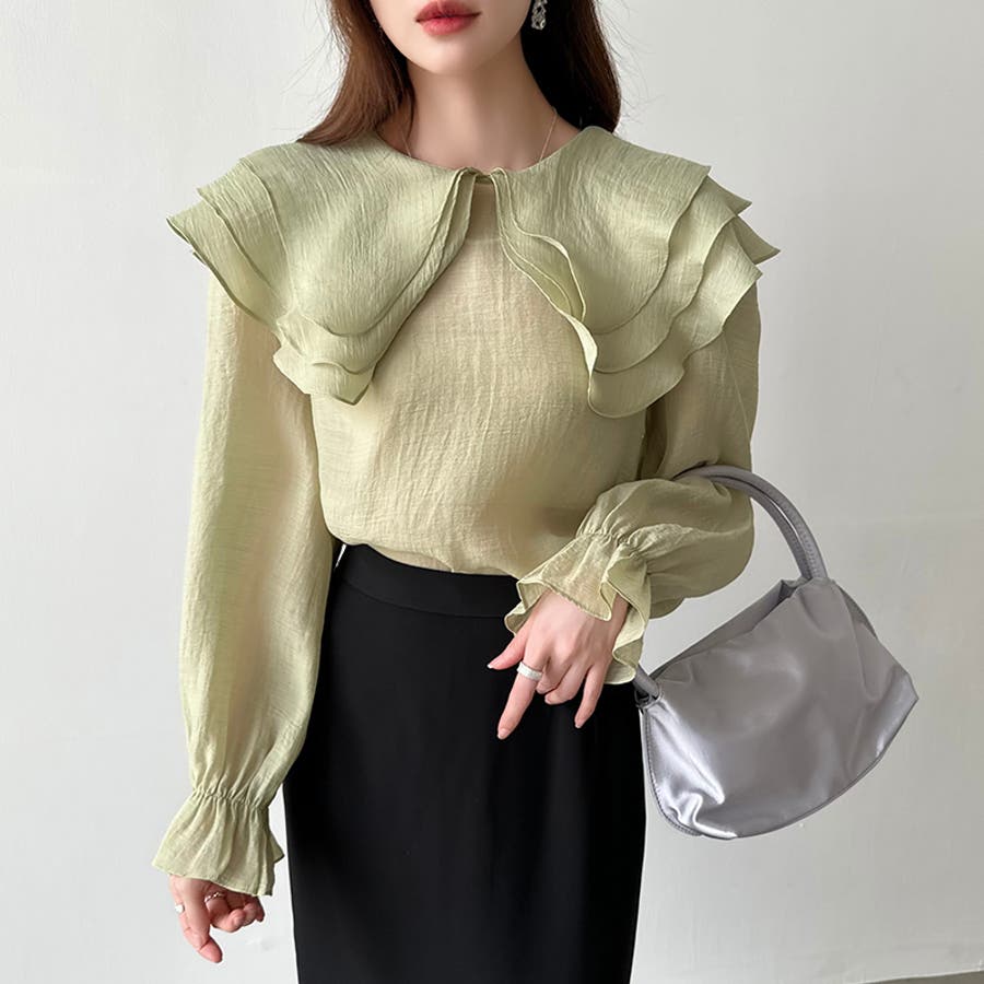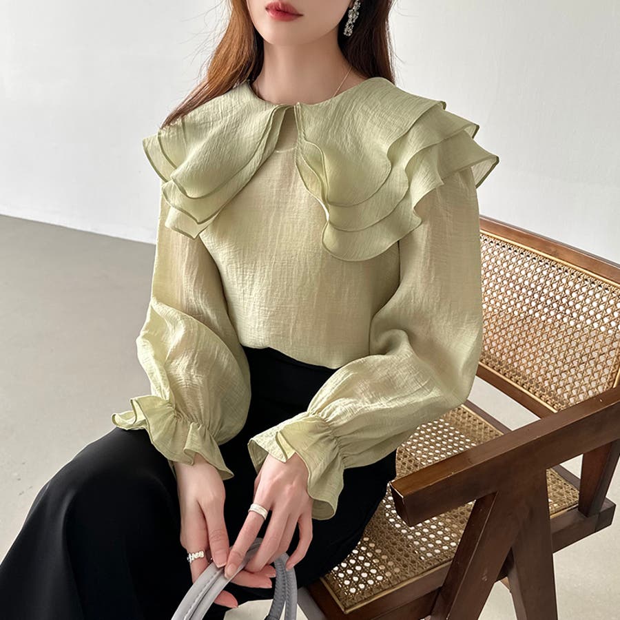 ラッフルカラーシアーブラウス シフォンブラウス ボリュームスリーブ