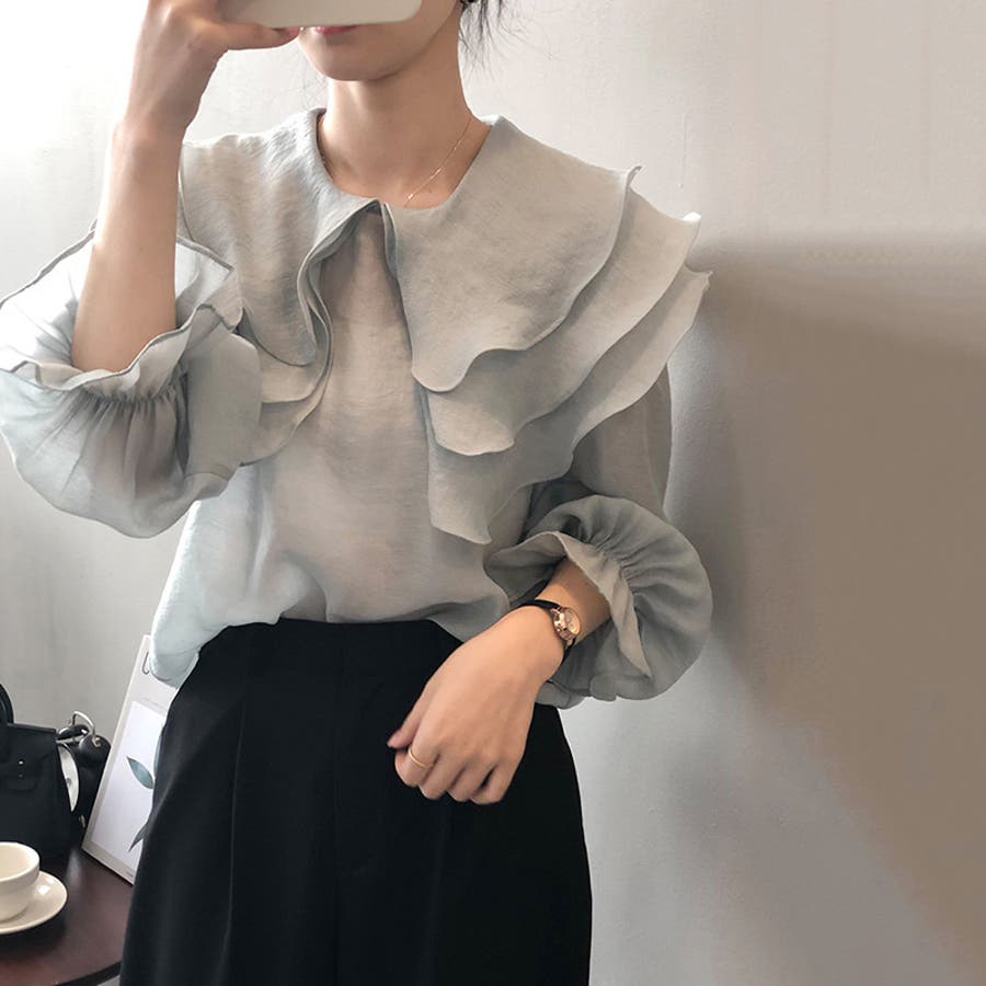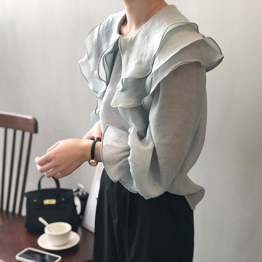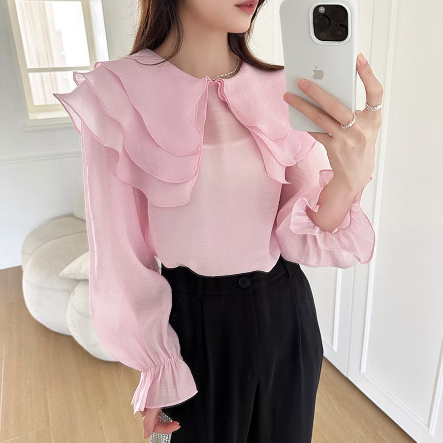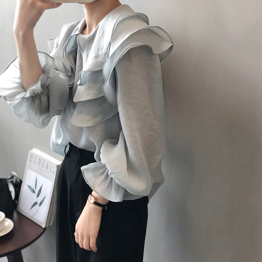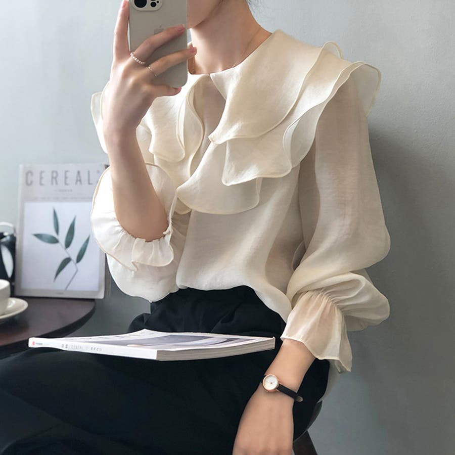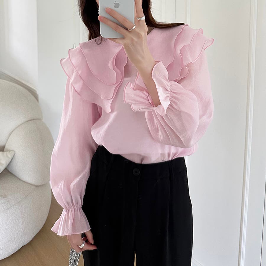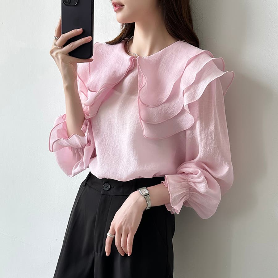 ラッフルカラーシアーブラウス シフォンブラウス ボリュームスリーブ