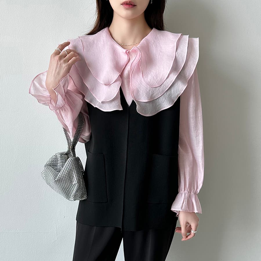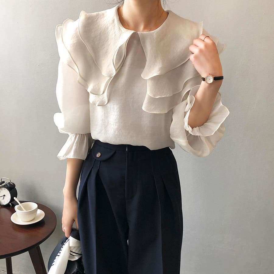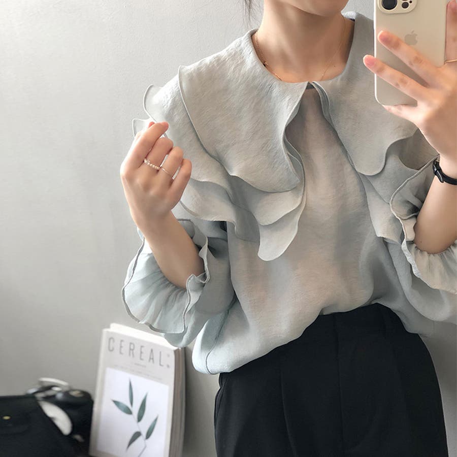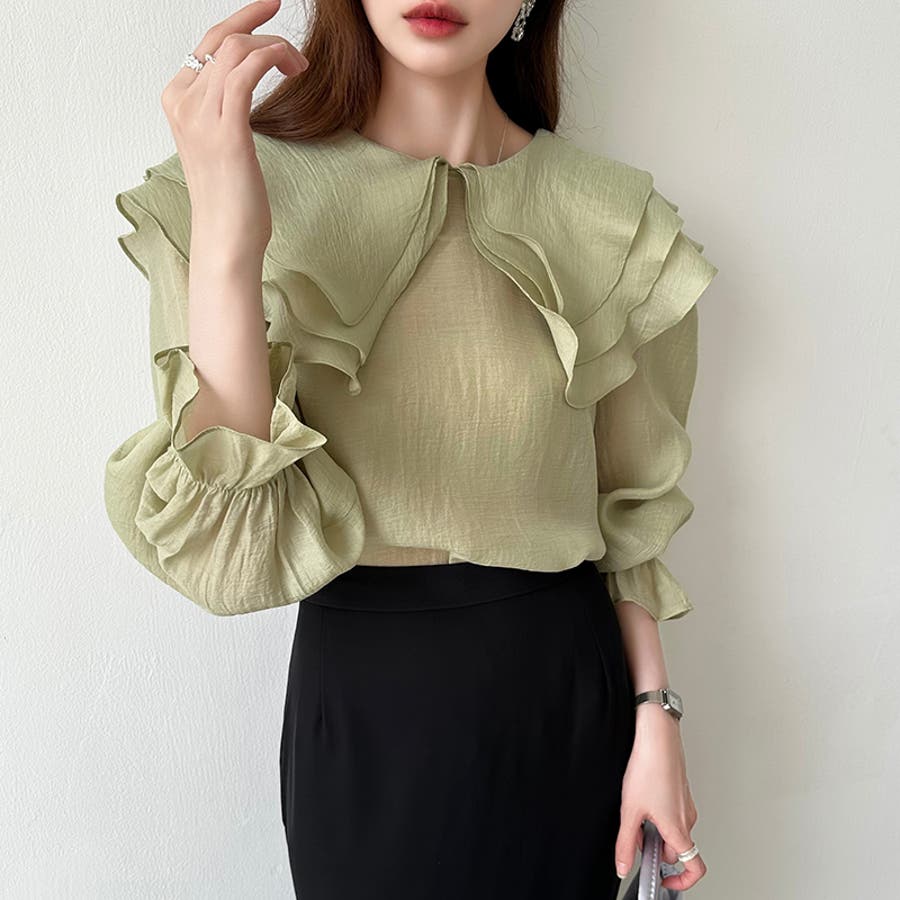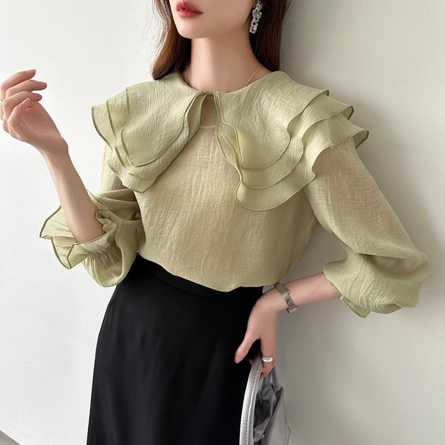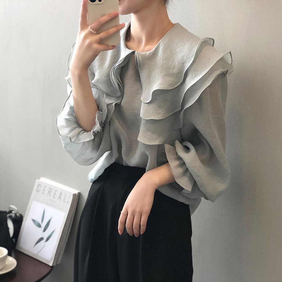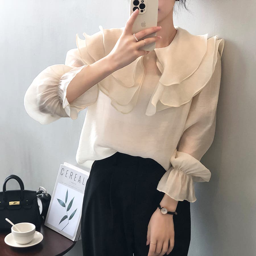 ラッフルカラーシアーブラウス シフォンブラウス ボリュームスリーブ
