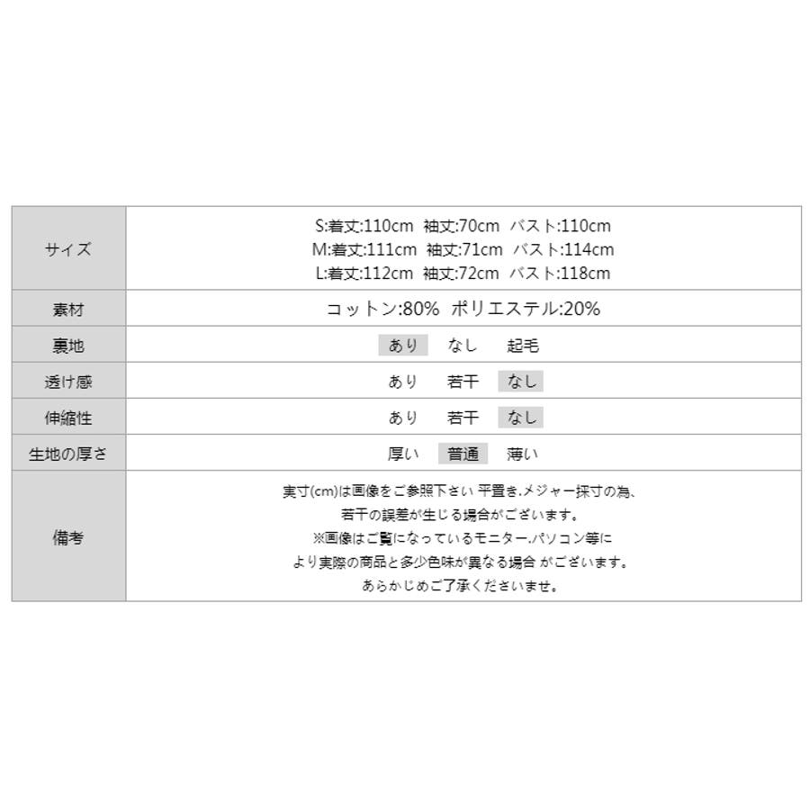 | サイズ | S: 着丈 110cm 袖丈 70cm バスト 110cm M: 着丈 111cm 袖丈 71cm バスト 114cm L: 着丈 112cm 袖丈 72cm バスト 118cm |