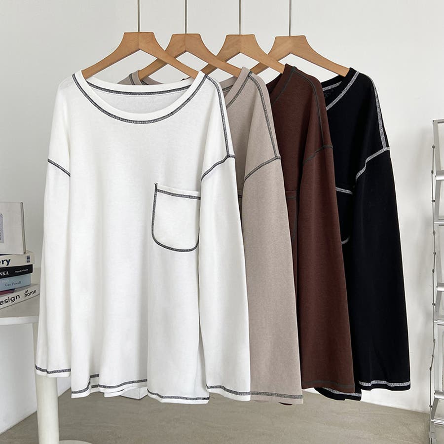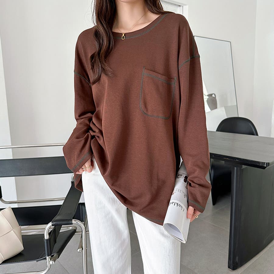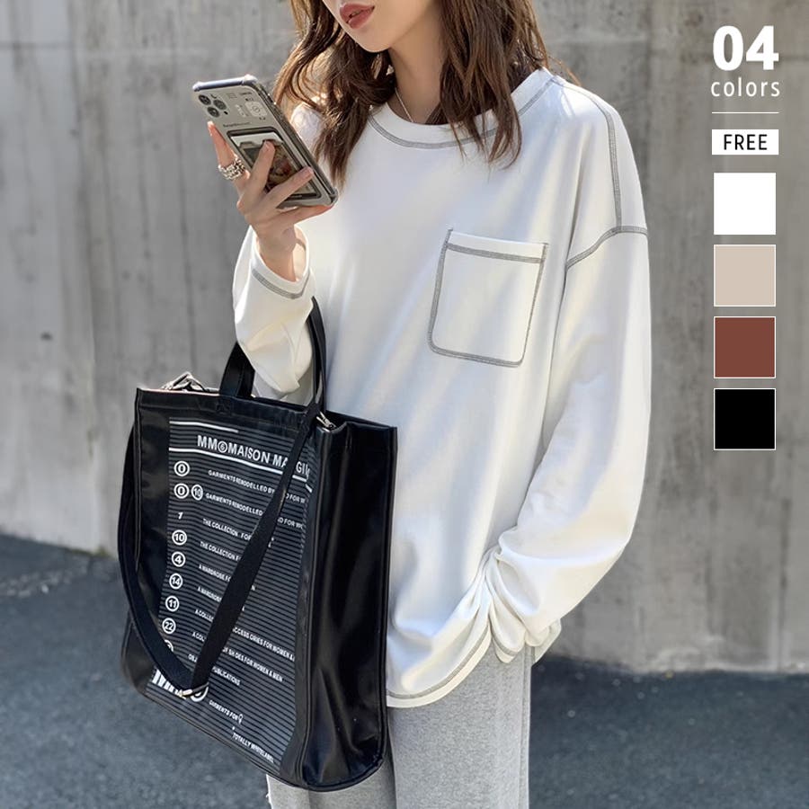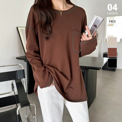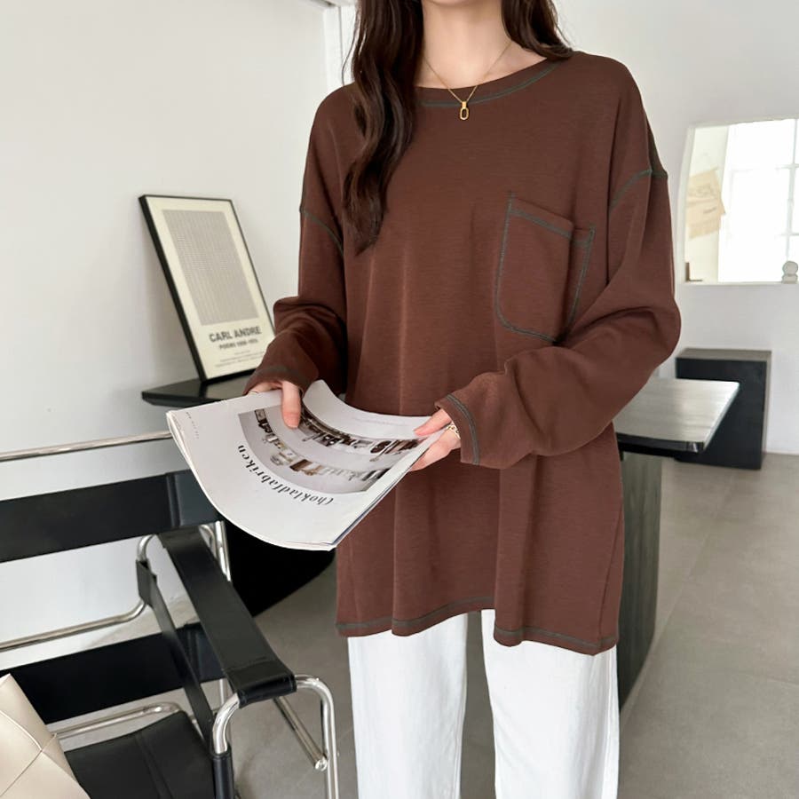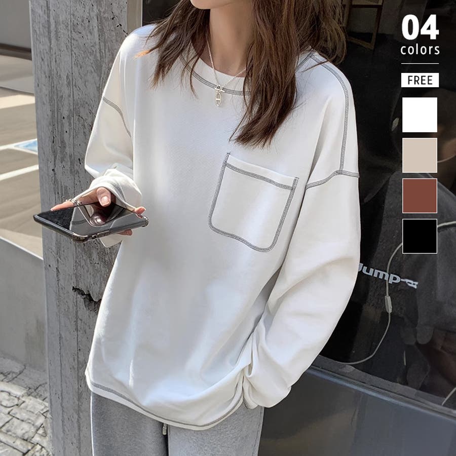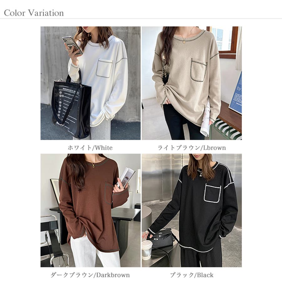 カットソー ロンt レディース 配色ステッチ 長袖 tシャツ 長袖tシャツ トップス 配色 ステッチ 切り替え ロンティー ろんt ロングtシャツ ロング ロング丈 ロングスリーブ ロンT ゆったり 大きめ 大きい 大きいサイズ 体型カバー オーバーサイズ クルーネック ラウンドネック 丸首 丸襟 1枚で決まる 綿 コットン ポリエステル 細見え ドロップショルダー ビッグシルエット ボリューム ボリューム袖 ボリュームスリーブ プルオーバー tops ラフ ゆる カジュアル 大人 かわいい 可愛い 大人可愛い おしゃれ オシャレ プチプラ トレンド ヒット 商品 おすすめ 服 ファッション フリーサイズ ホワイト 白 ライトブラウン ダークブラウン 茶色 ブラック 黒 新作 2023AW 2023 2023新作 春物 秋物 冬物 秋冬 春 秋 冬 春服 秋服 冬服 韓国 韓国ファッション 10代 20代 30代 40代 50代 cocomomo ココモモ
