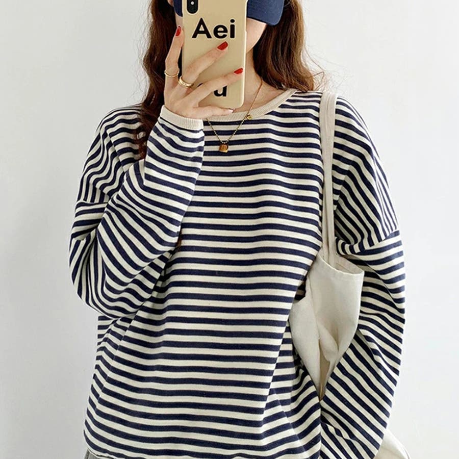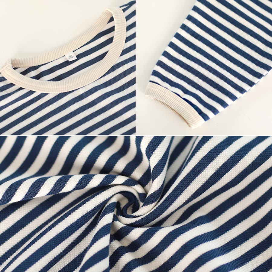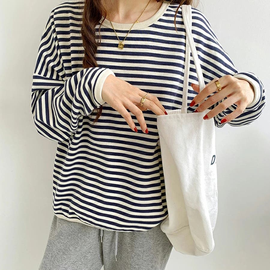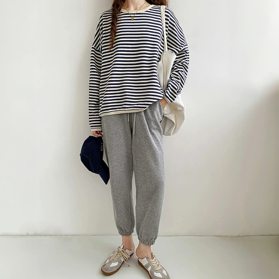 Tシャツよりは厚手で薄手のトレーナーのような感じです。襟ぐりと袖口は伸びませんが、ゆったり目で、着心地が良いし、ボーダーのピッチが最高です。
