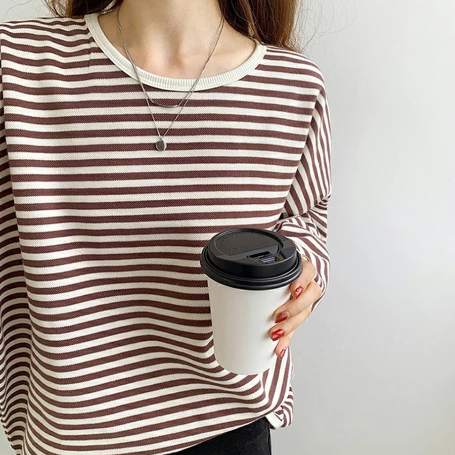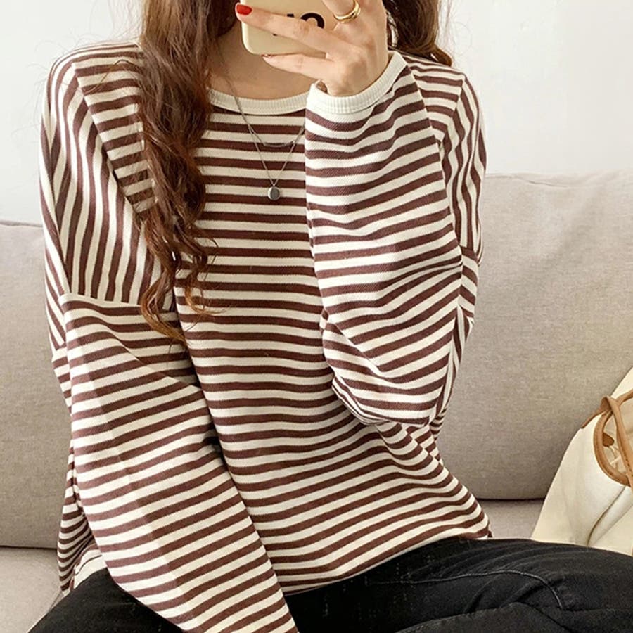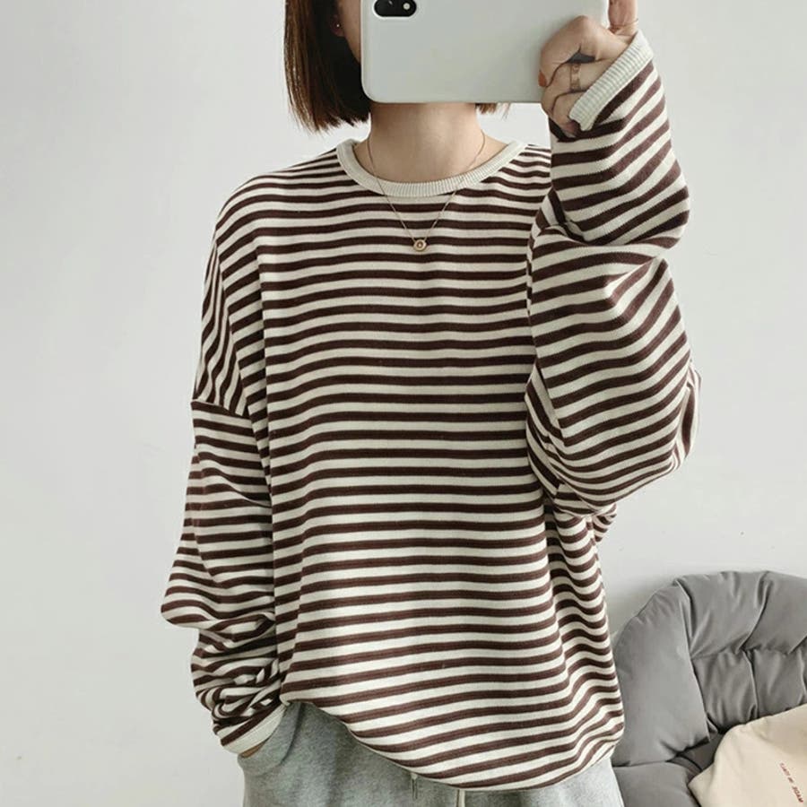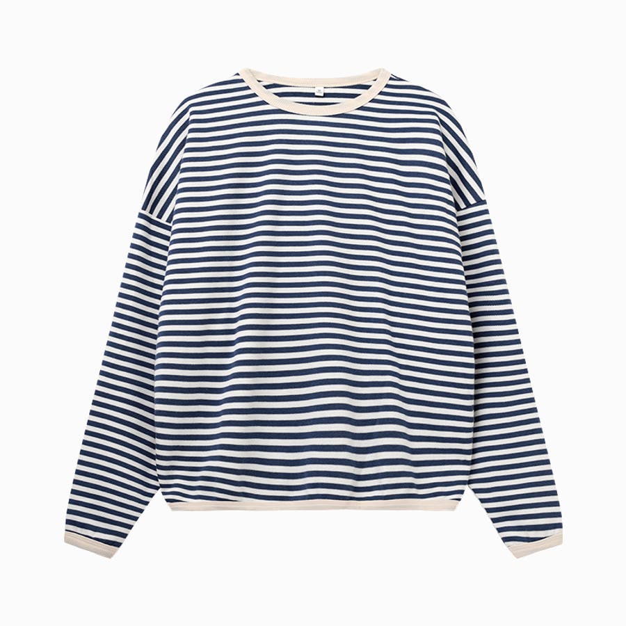 Tシャツよりは厚手で薄手のトレーナーのような感じです。襟ぐりと袖口は伸びませんが、ゆったり目で、着心地が良いし、ボーダーのピッチが最高です。