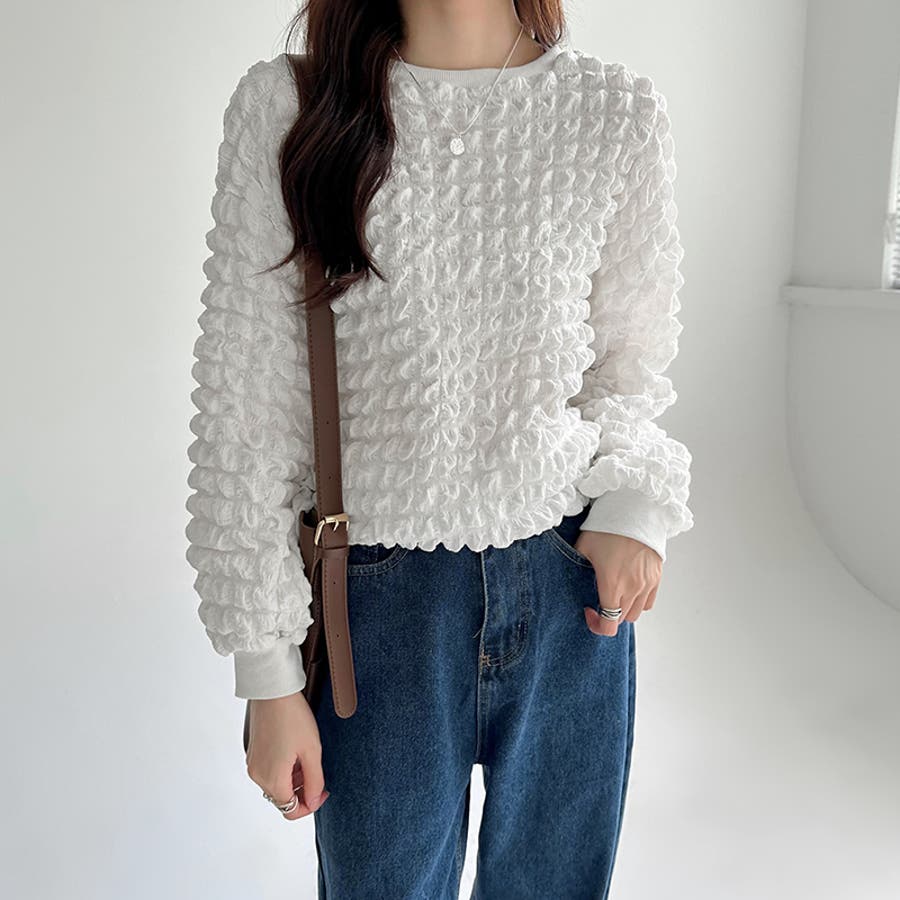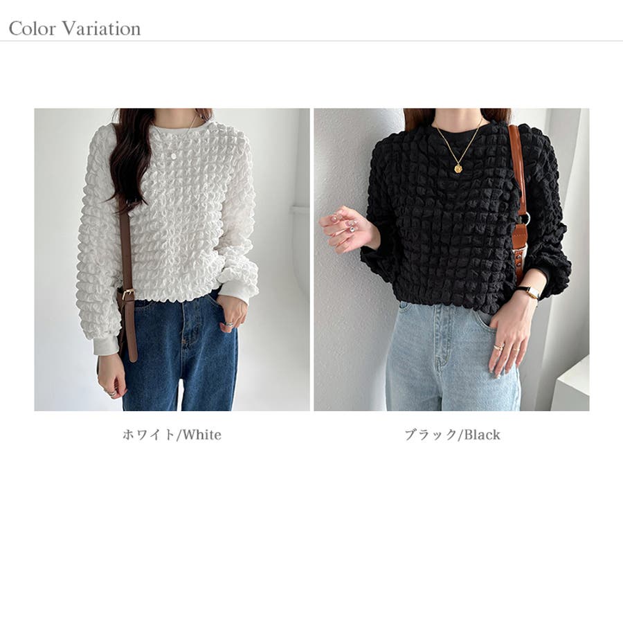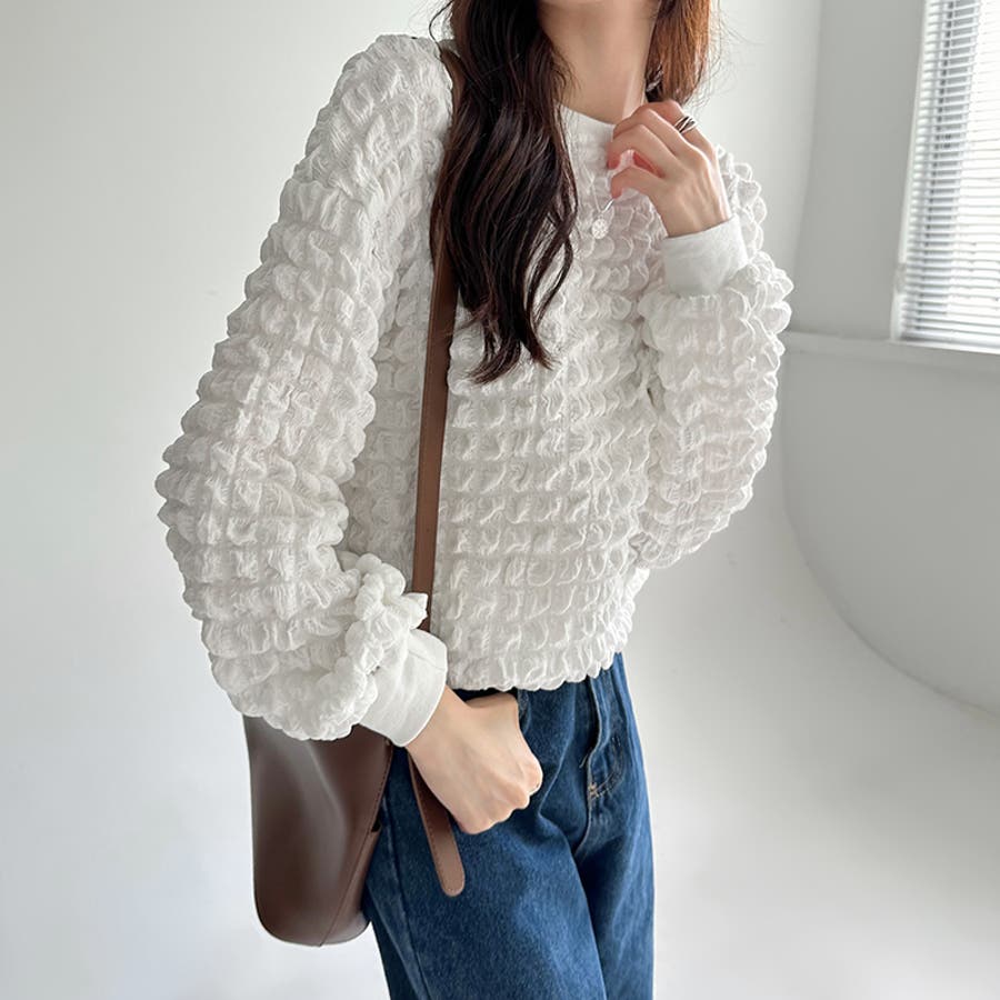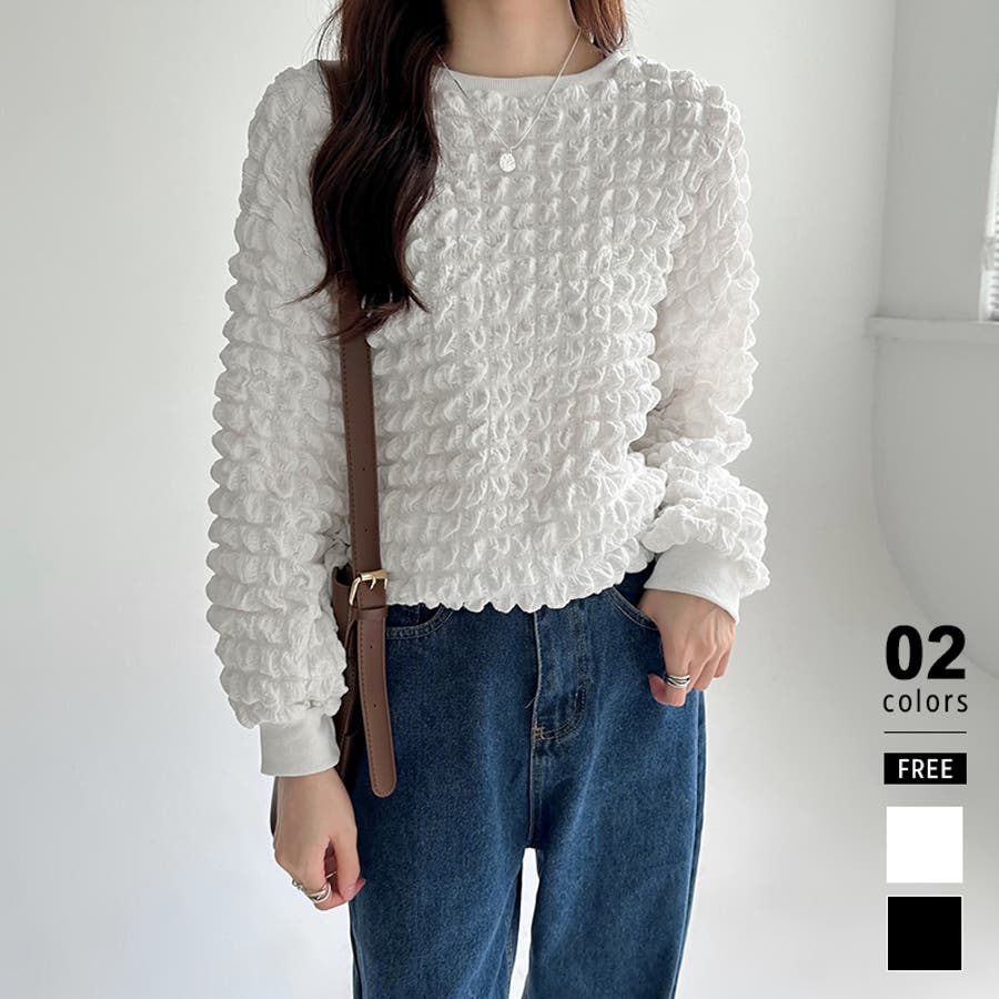 ポコポコ ポップコーン トップス レディース 長袖 プルオーバー ジャガード ワッフル シャーリング カットソー ぽこぽこ 立体 凹凸 コンパクト ショート丈 ショート ぽわん ぽわん袖 ポワン ボリューム ボリュームスリーブ ボリューム袖 バルーン バルーン袖 袖リブ クロップド クロップド丈 ラウンドネック クルーネック ゆったり 大きめ 大きい tops 着回し 無地 ふんわり 1枚で決まる 洗える 骨格ウエーブ ガーリー フェミニン カジュアル 大人 オトナ かわいい 可愛い 大人可愛い きれい きれいめ キレイめ おしゃれ オシャレ 女性 母 ママ ママコーデ プチプラ 高見え フリーサイズ トレンド ヒット 商品 おすすめ 服 ファッション ホワイト 白 ブラック 黒 新作 2023aw 2023AW 23年 2023 秋冬新作 春秋 秋冬 春 秋 冬 春服 秋服 冬服 韓国 韓国ファッション 10代 20代 30代 40代 50代 cocomomo ココモモ