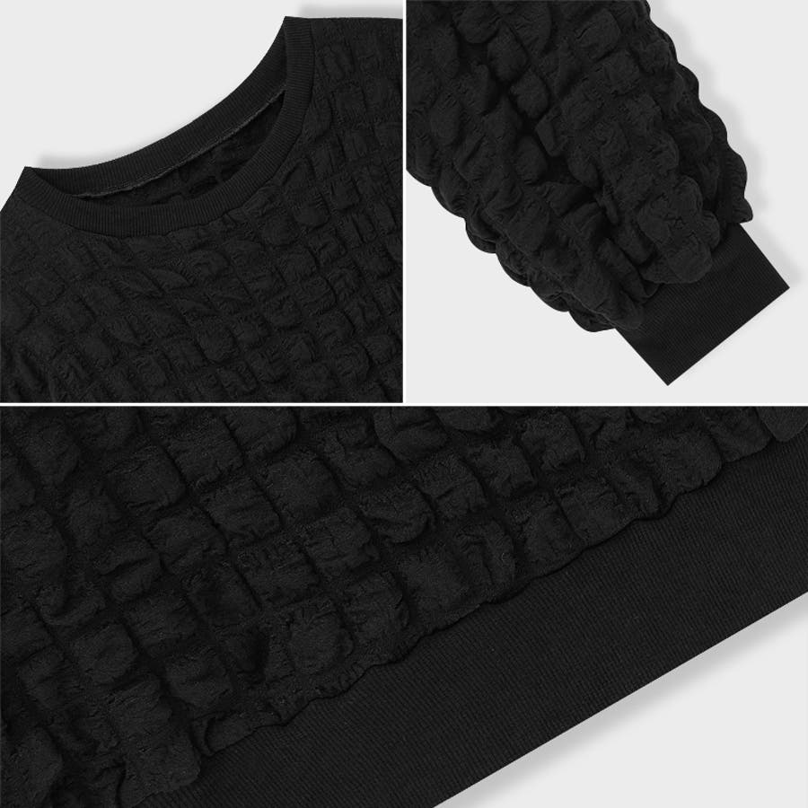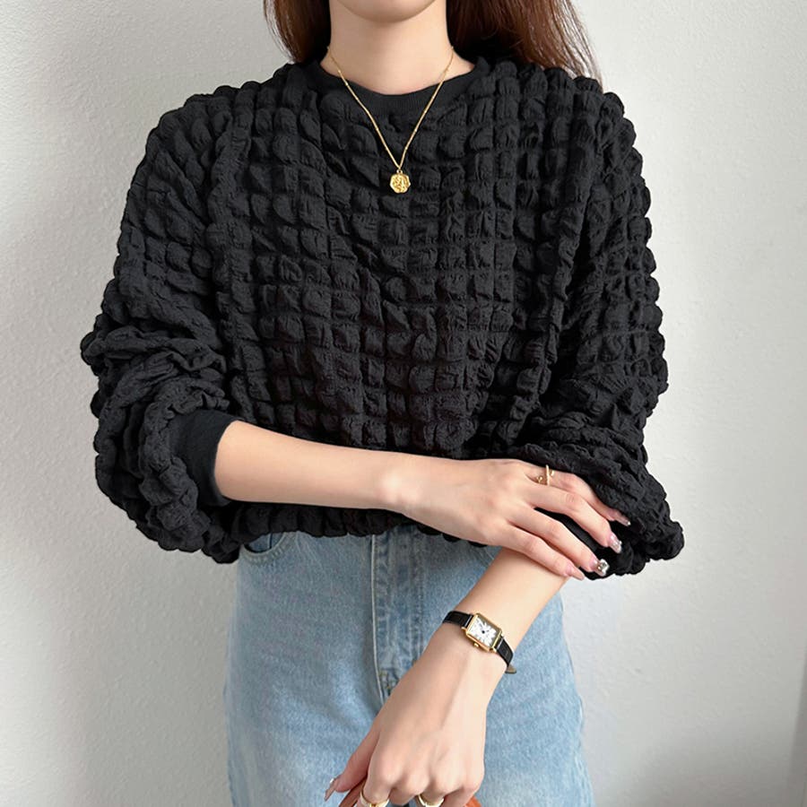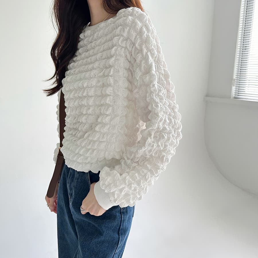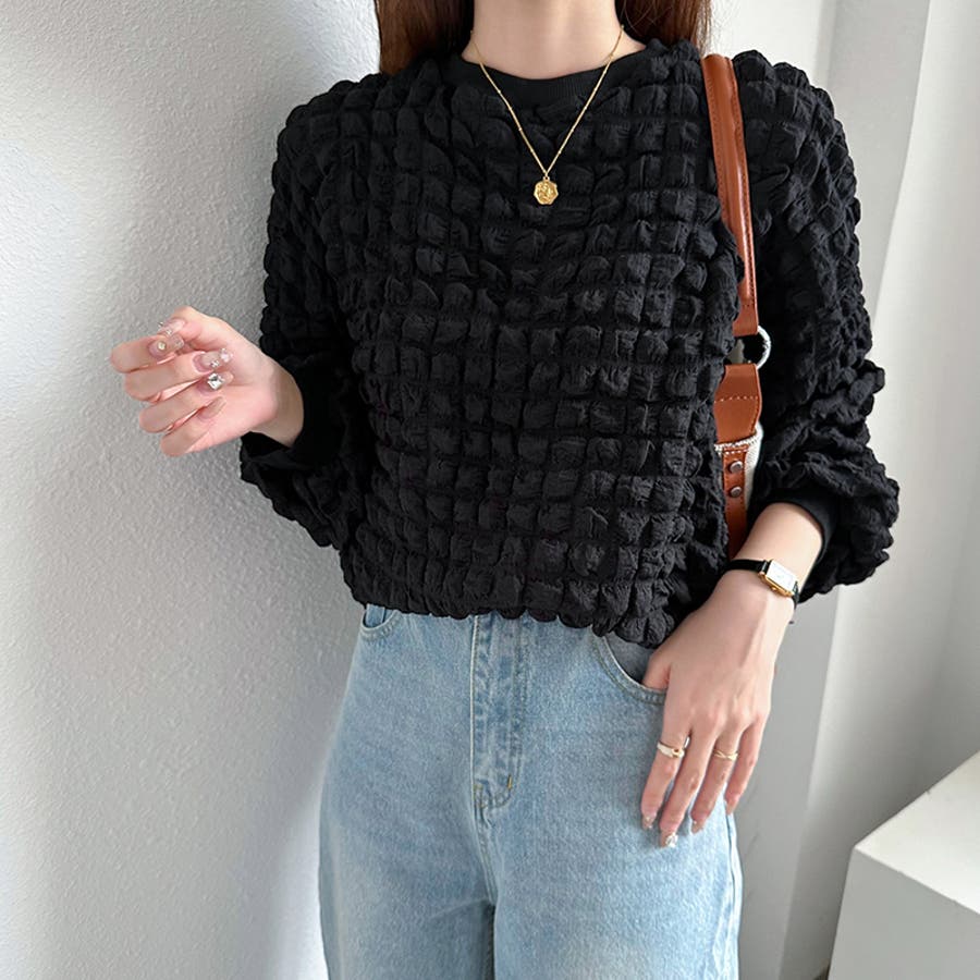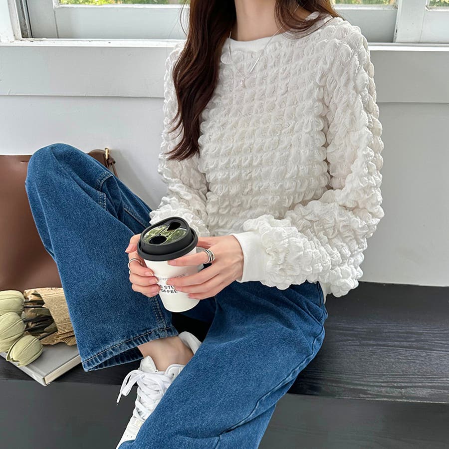 ポコポコ ポップコーン トップス レディース 長袖 プルオーバー ジャガード ワッフル シャーリング カットソー ぽこぽこ 立体 凹凸 コンパクト ショート丈 ショート ぽわん ぽわん袖 ポワン ボリューム ボリュームスリーブ ボリューム袖 バルーン バルーン袖 袖リブ クロップド クロップド丈 ラウンドネック クルーネック ゆったり 大きめ 大きい tops 着回し 無地 ふんわり 1枚で決まる 洗える 骨格ウエーブ ガーリー フェミニン カジュアル 大人 オトナ かわいい 可愛い 大人可愛い きれい きれいめ キレイめ おしゃれ オシャレ 女性 母 ママ ママコーデ プチプラ 高見え フリーサイズ トレンド ヒット 商品 おすすめ 服 ファッション ホワイト 白 ブラック 黒 新作 2023aw 2023AW 23年 2023 秋冬新作 春秋 秋冬 春 秋 冬 春服 秋服 冬服 韓国 韓国ファッション 10代 20代 30代 40代 50代 cocomomo ココモモ