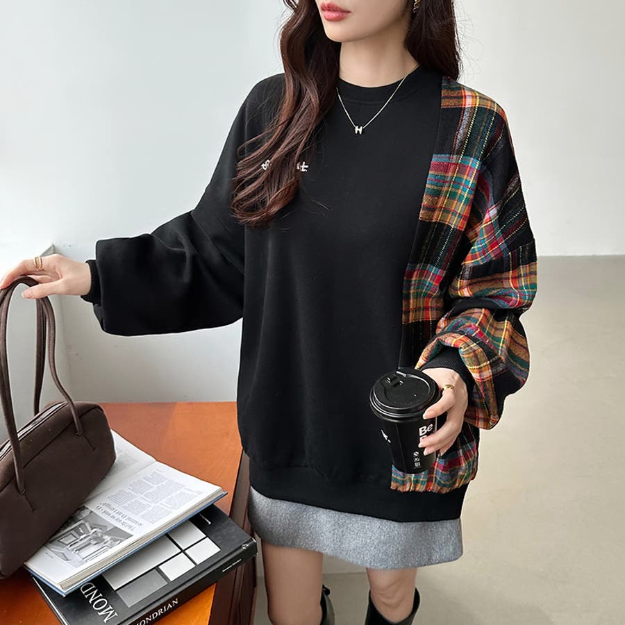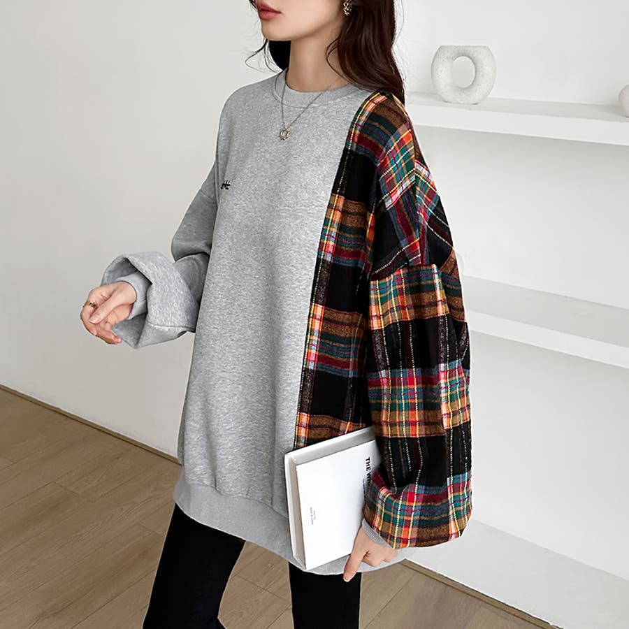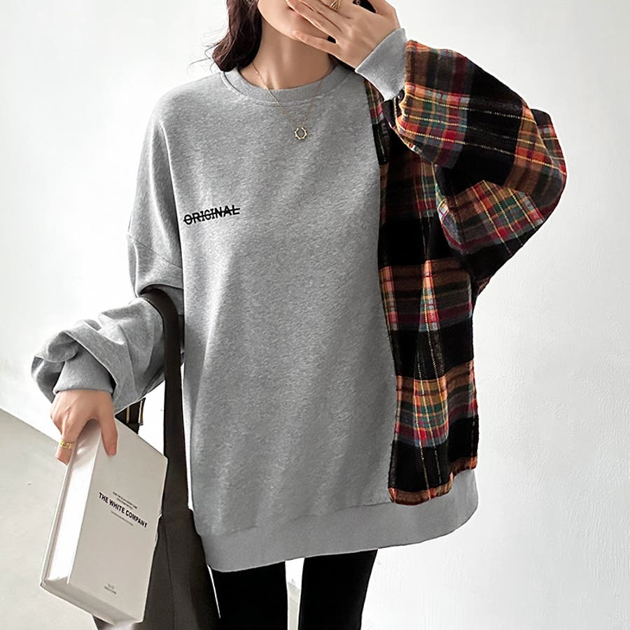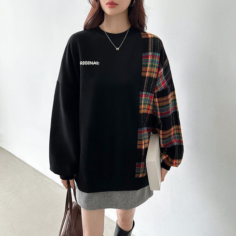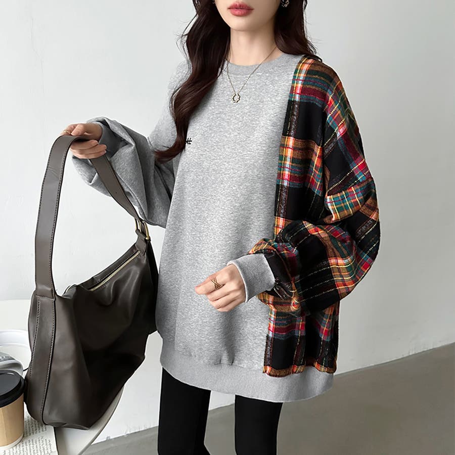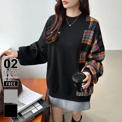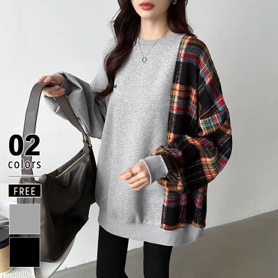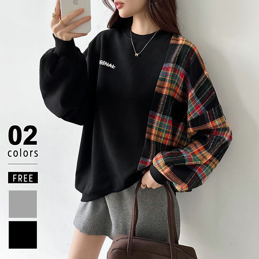 トレーナー レディース チェック柄 大きいサイズ スウェット オーバーサイズ ロゴ スウェットトレーナー トップス 長袖 袖 切り替え 切替 チェック 柄 無地 カットソー ゆったり 大きめ 大きい 大きいサイズ 体型カバー プルオーバー ドッキングプルオーバー ビッグシルエット クルーネック ドロップショルダー ロング ロング丈 ダボダボ ぶかぶか ボリューム 袖 ボリュームスリーブ ボリューム袖 tops 綿 コットン ポリエステル ダンス ストリート 個性的 個性派 韓国風 カジュアル かっこいい かわいい 可愛い おしゃれ オシャレ プチプラ トレンド ヒット 商品 おすすめ 服 ファッション フリーサイズ グレー 灰色 ブラック 黒 カラフル カラー 新作 2023AW 2023 2023新作 秋色 秋物 冬物 秋冬 秋 冬 秋服 冬服 韓国 韓国ファッション 10代 20代 30代 40代 50代 cocomomo ココモモ
