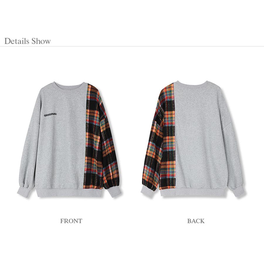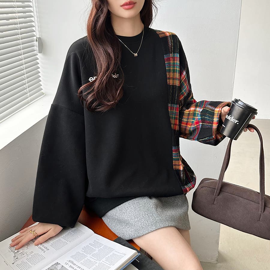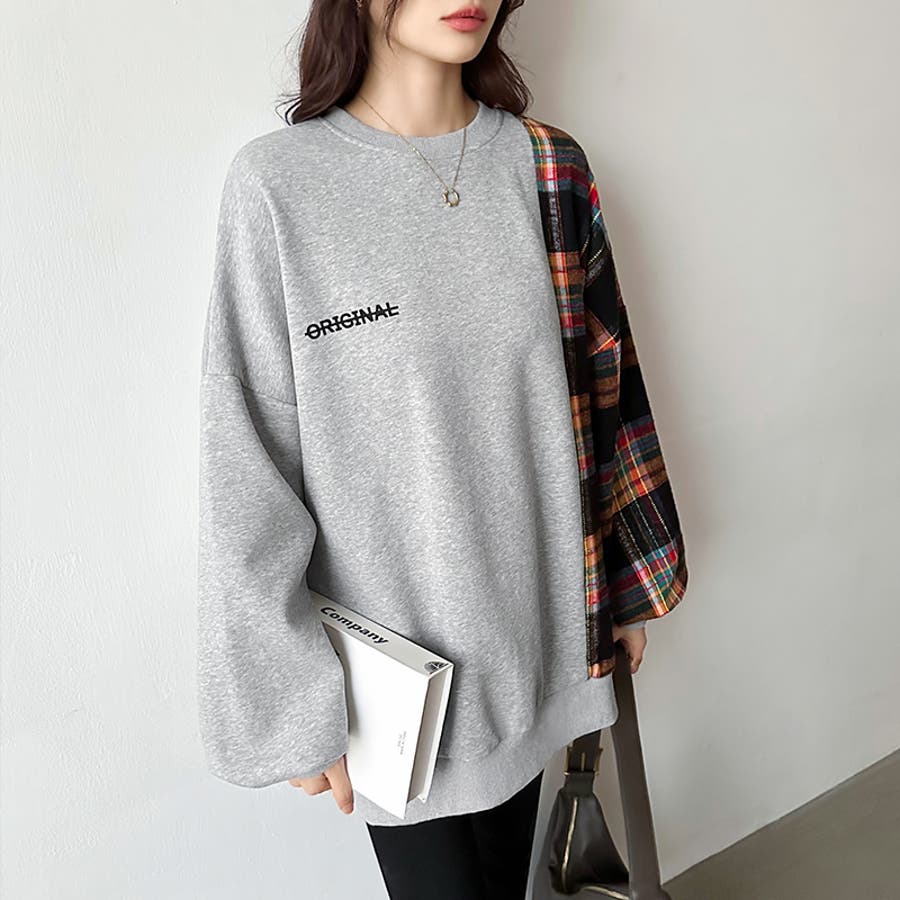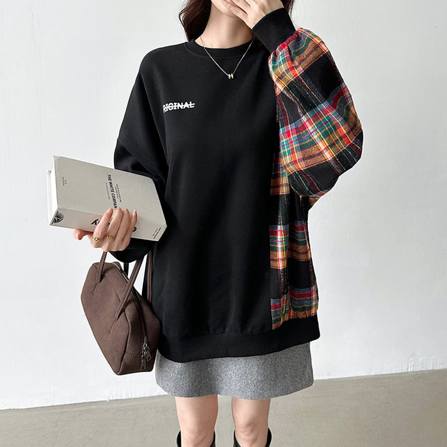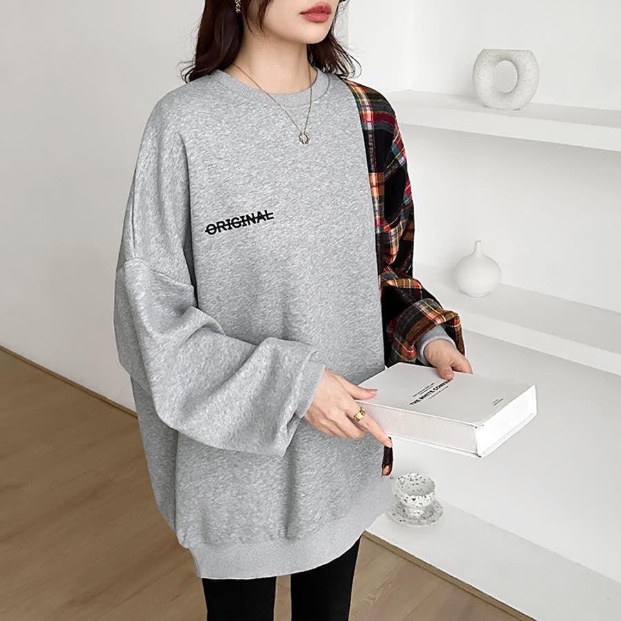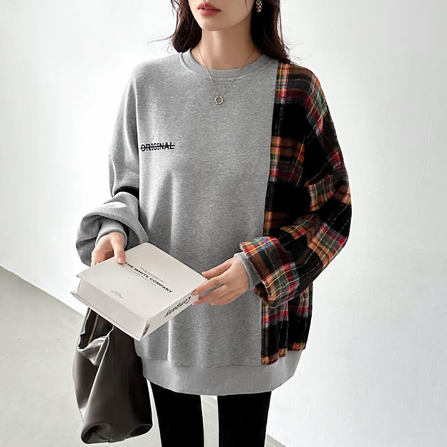 トレーナー レディース チェック柄 大きいサイズ スウェット オーバーサイズ ロゴ スウェットトレーナー トップス 長袖 袖 切り替え 切替 チェック 柄 無地 カットソー ゆったり 大きめ 大きい 大きいサイズ 体型カバー プルオーバー ドッキングプルオーバー ビッグシルエット クルーネック ドロップショルダー ロング ロング丈 ダボダボ ぶかぶか ボリューム 袖 ボリュームスリーブ ボリューム袖 tops 綿 コットン ポリエステル ダンス ストリート 個性的 個性派 韓国風 カジュアル かっこいい かわいい 可愛い おしゃれ オシャレ プチプラ トレンド ヒット 商品 おすすめ 服 ファッション フリーサイズ グレー 灰色 ブラック 黒 カラフル カラー 新作 2023AW 2023 2023新作 秋色 秋物 冬物 秋冬 秋 冬 秋服 冬服 韓国 韓国ファッション 10代 20代 30代 40代 50代 cocomomo ココモモ