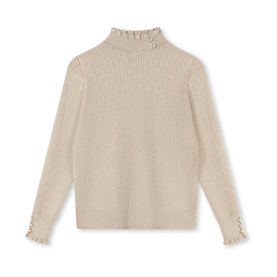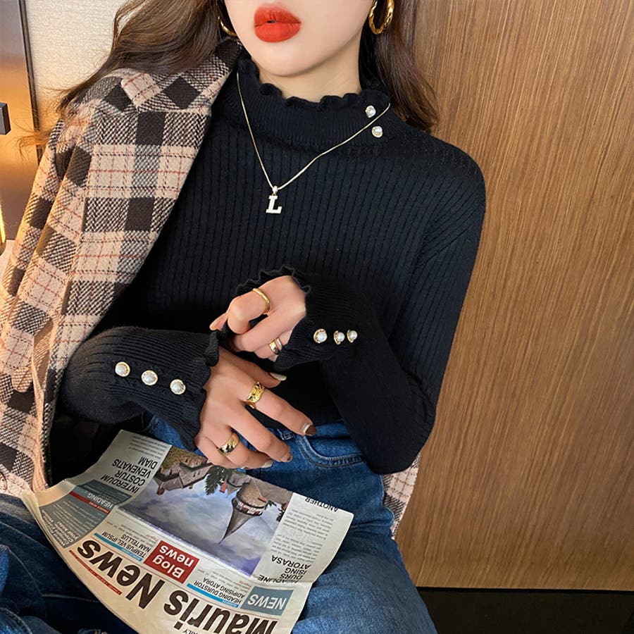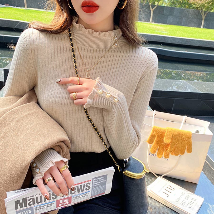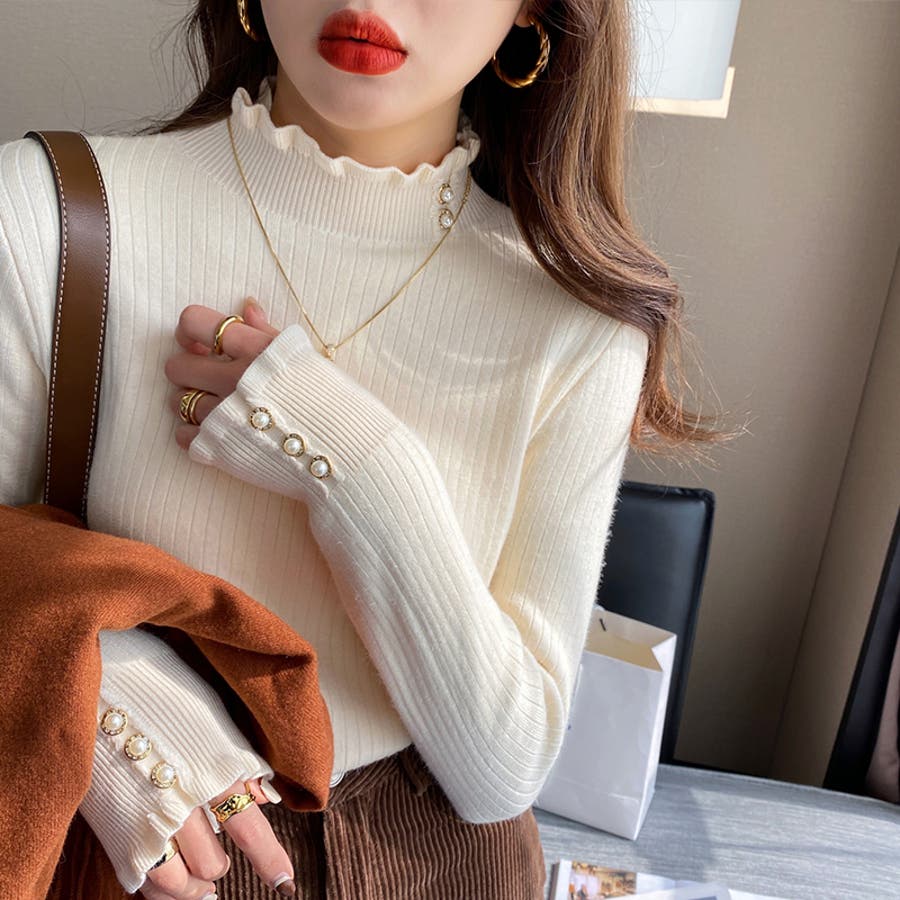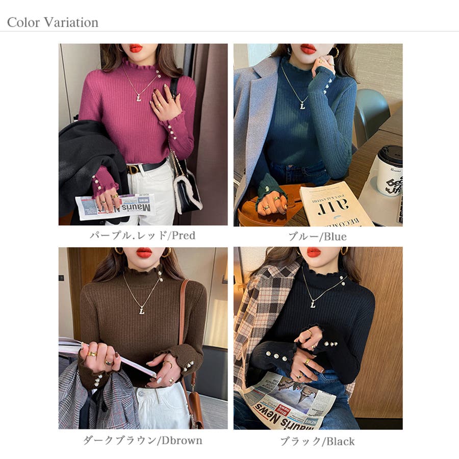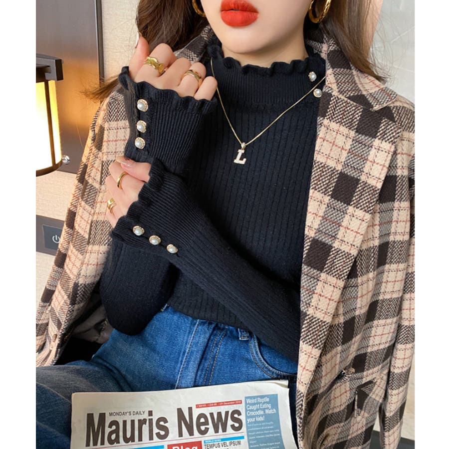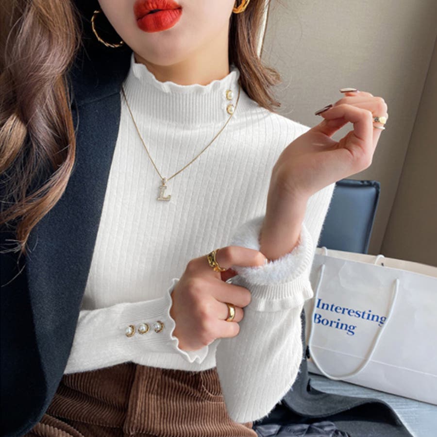 裏起毛 ハイネックニット メロウフリルパールボタン付き