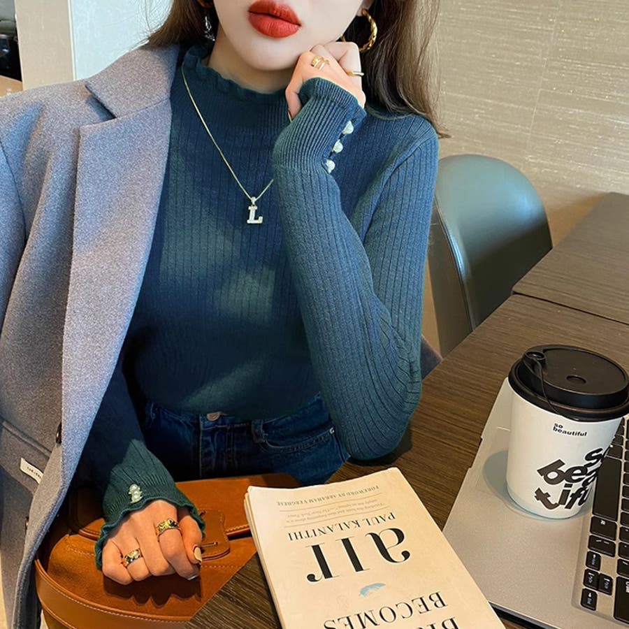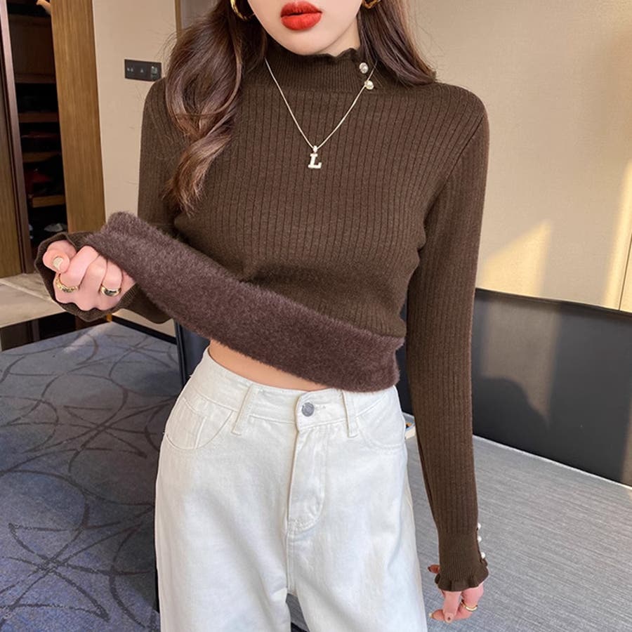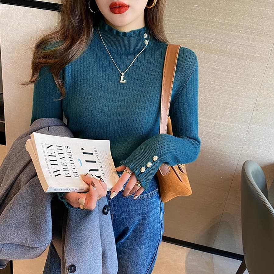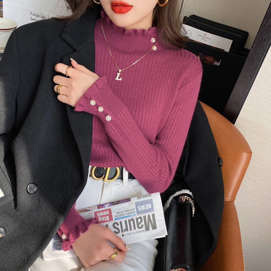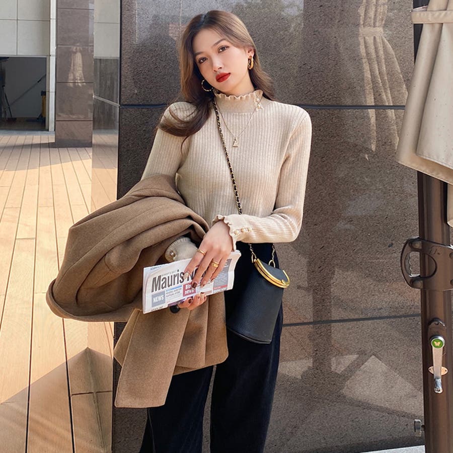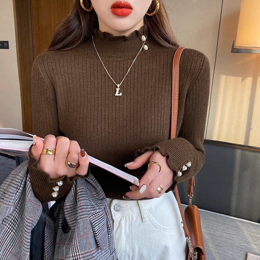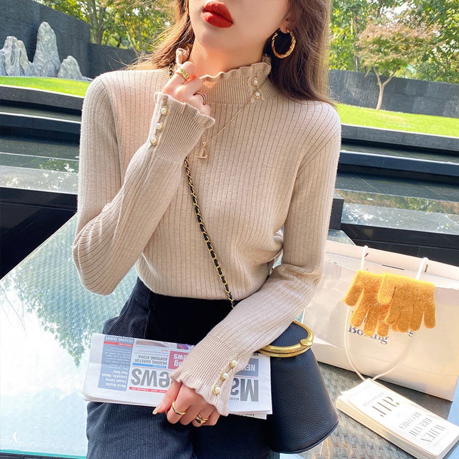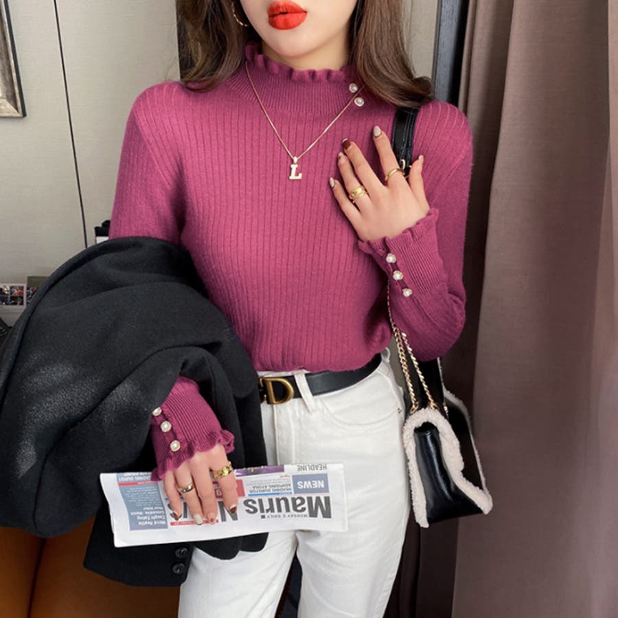 裏起毛 ハイネックニット メロウフリルパールボタン付き